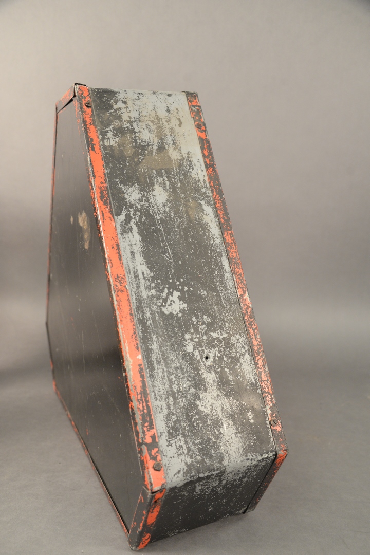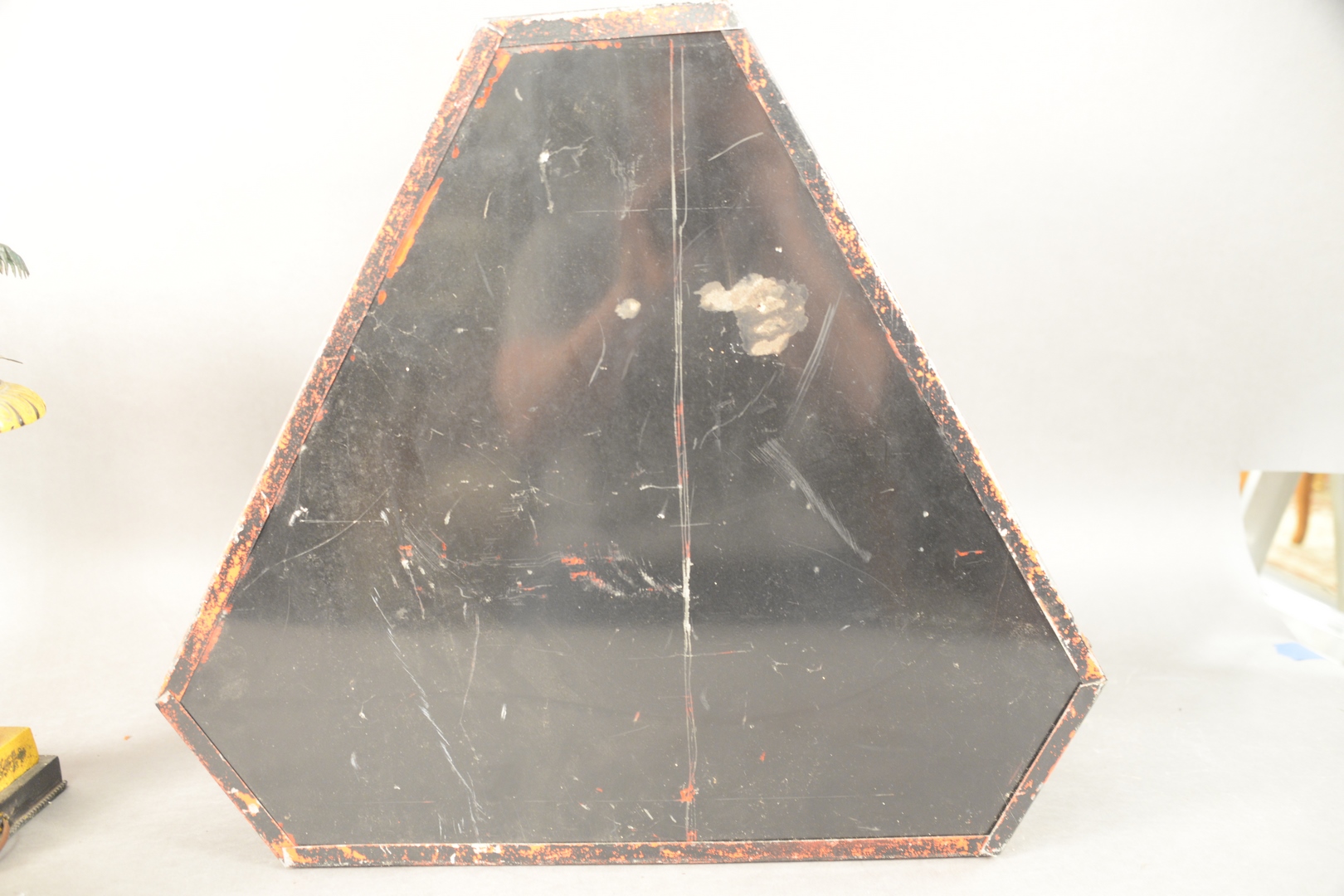 Lot 345: Vintage Triangular Metal Advertising or Storefront Sign, having black, white and red paint, inscribed ’20th Century Antiques’, height 21 1/2 inches, width 24 inches, diameter 6 1/2 inches.