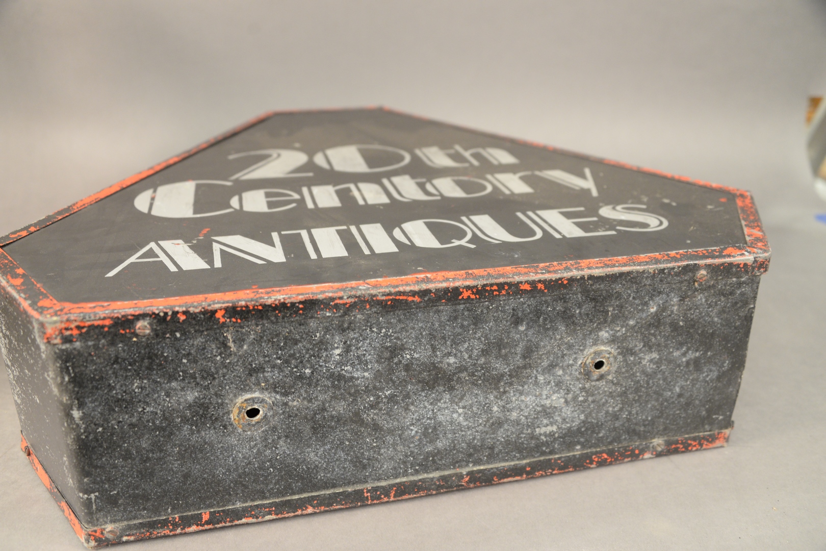 Vintage Triangular Metal Advertising or Storefront Sign, having black, white and red paint, inscribed ’20th Century Antiques’, height 21 1/2 inches, width 24 inches, diameter 6 1/2 inches.