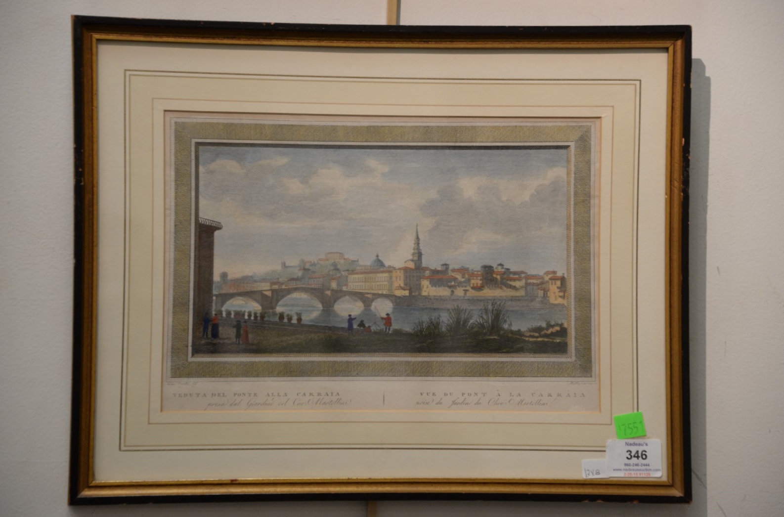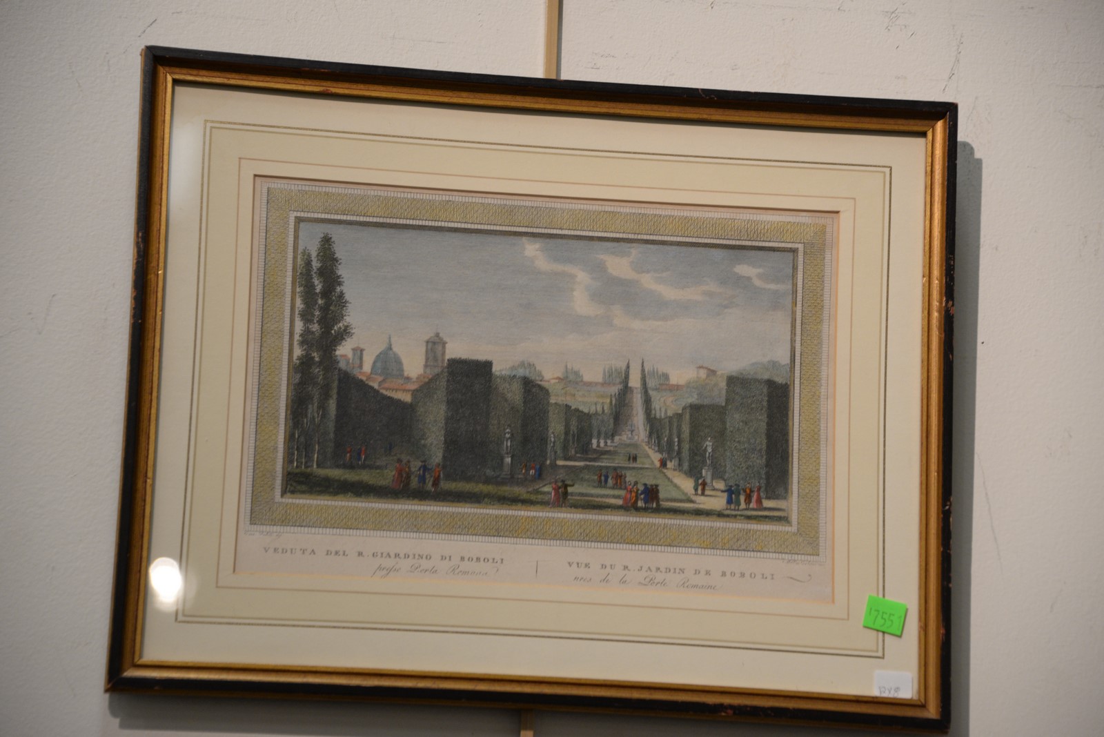 After Giuseppe Zocchi Italian 1711-1767 Set of four colored engravings including Ingresso in Citta Dalla Porta S. Gallo / Entree Dans la Ville de la Porte S. Gallo, Veduta del Ponte Alla Carraia / Vue du pont A La Carraia, and Veduta Del R. Giardino di Boboli / Vue du R. Jardin de Boboli, W. Russell Button Gallery label on reverse. 12 x 8