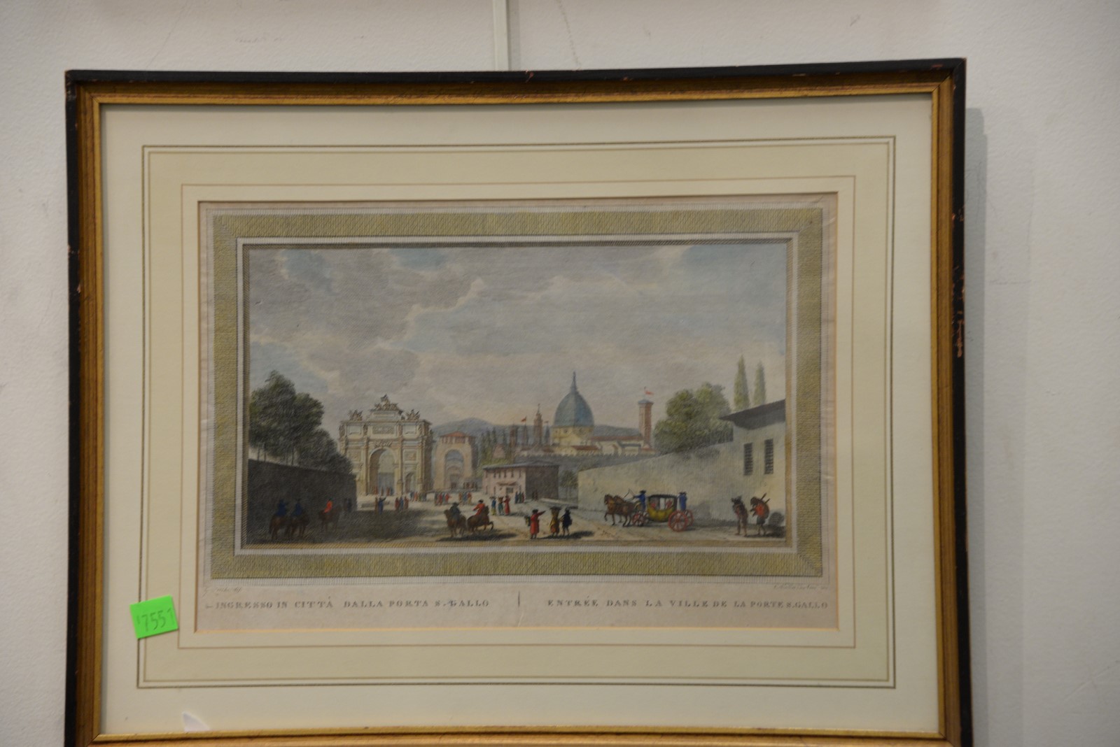 Lot 346: After Giuseppe Zocchi Italian 1711-1767 Set of four colored engravings including Ingresso in Citta Dalla Porta S. Gallo / Entree…