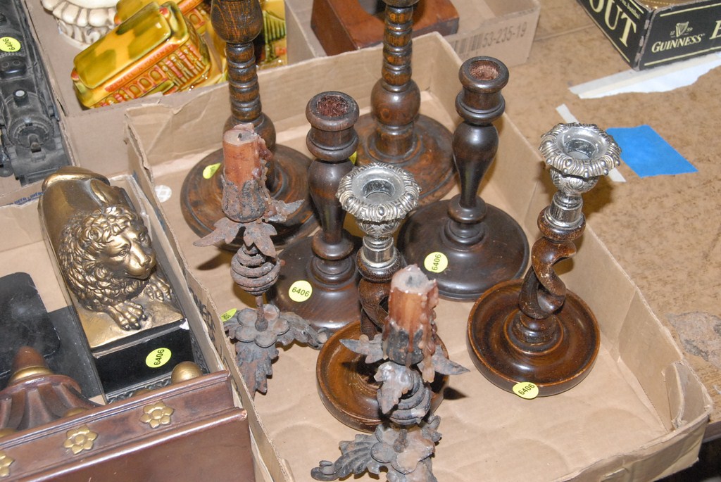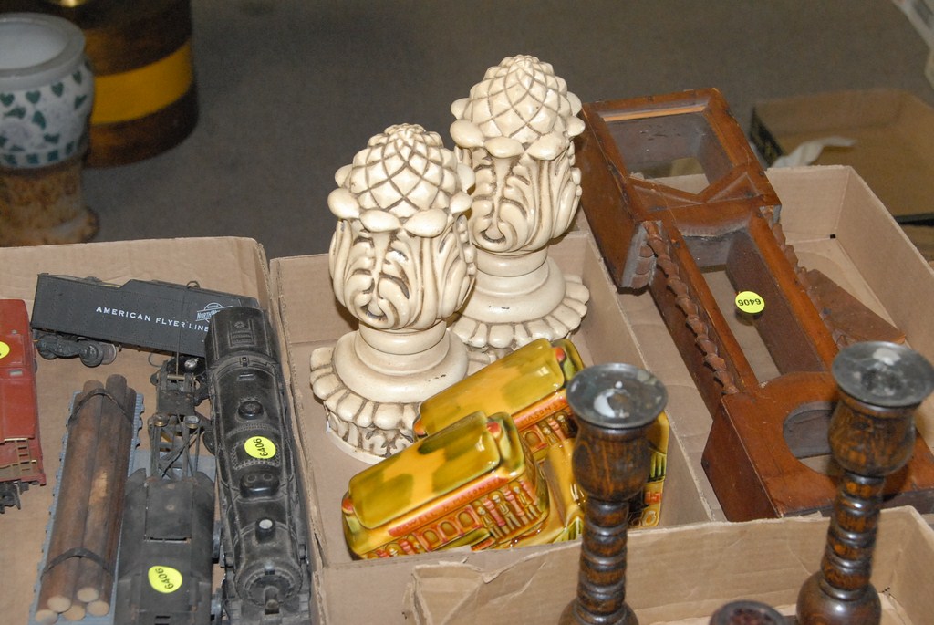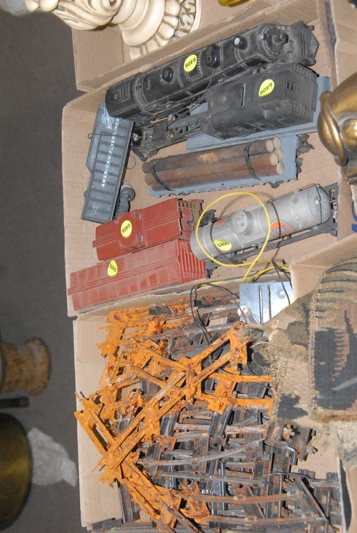 Lot 346: Eight box lots watch hutch, train set, reproduction brass stick phone, machine made tapestry, candlesticks, Hartford Dairy Company …