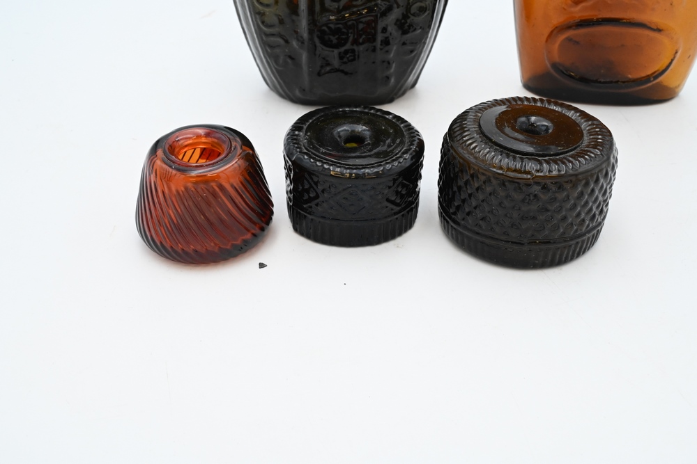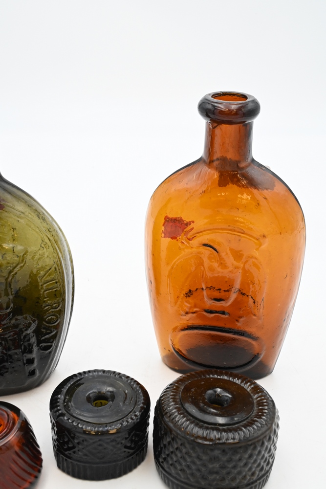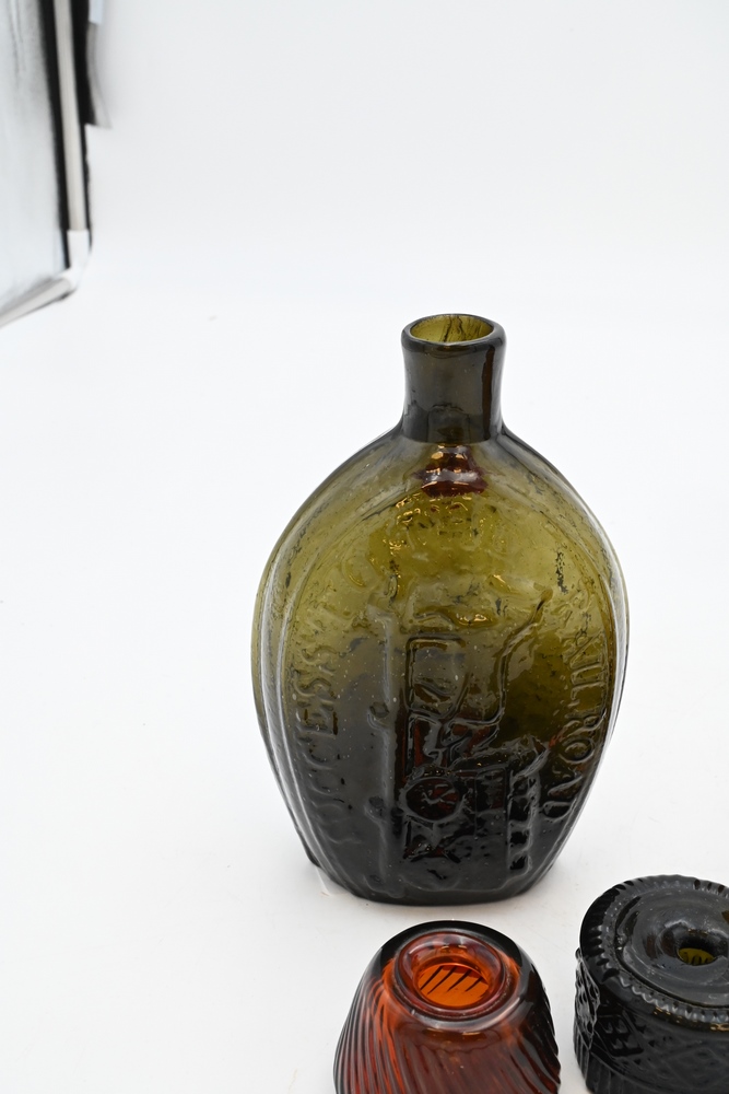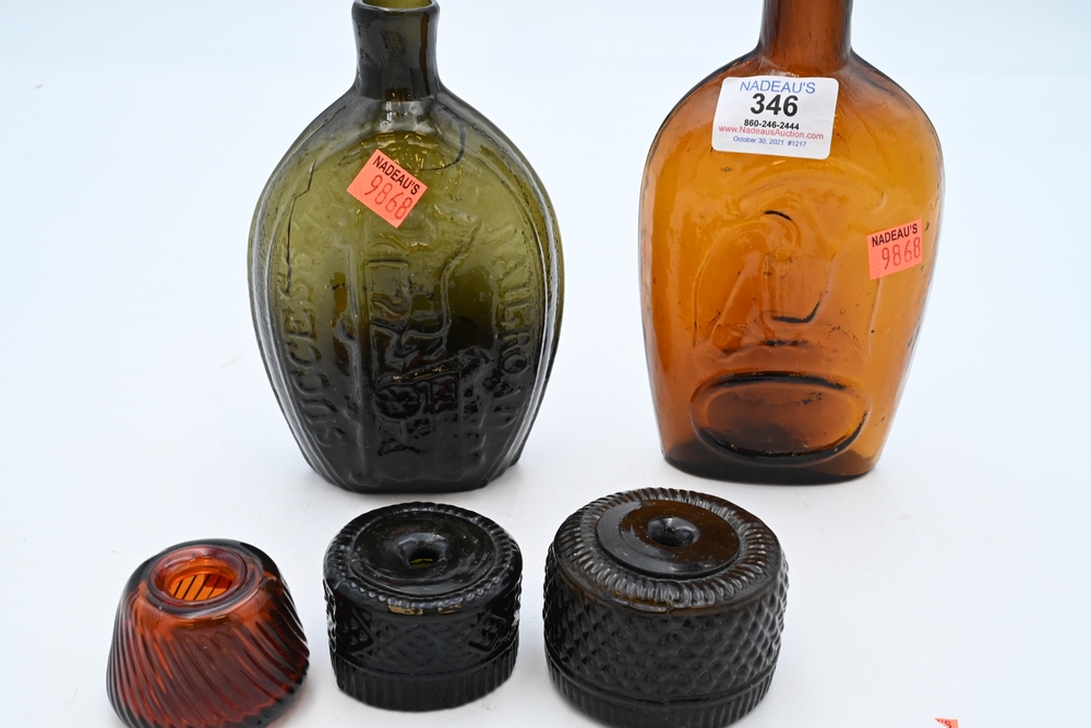 Lot 346: Five Blown Glass Items to include three inkwells, a flask with an eagle on a shield on one side and a flag on the opposite side, along with a flask with an eagle on each side tallest 7 1/2 inches Provenance: Estate of Bruce Sasalla, East Hartford, Connecticut.