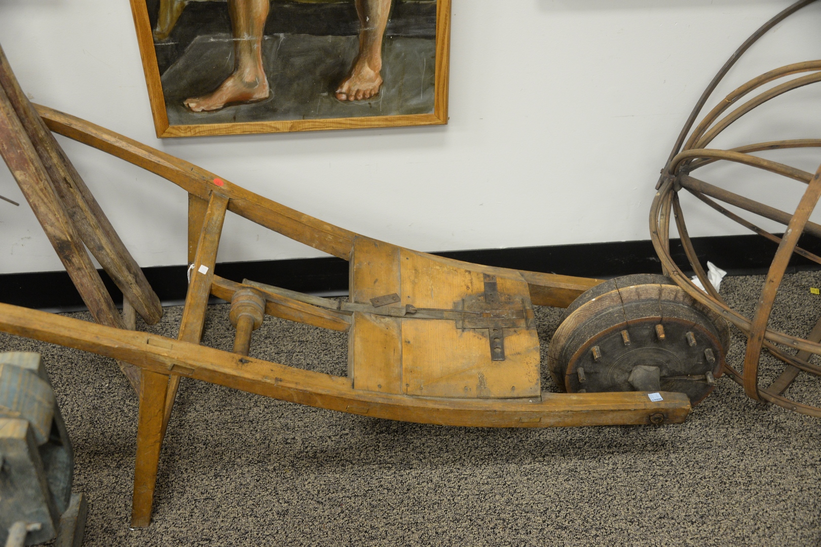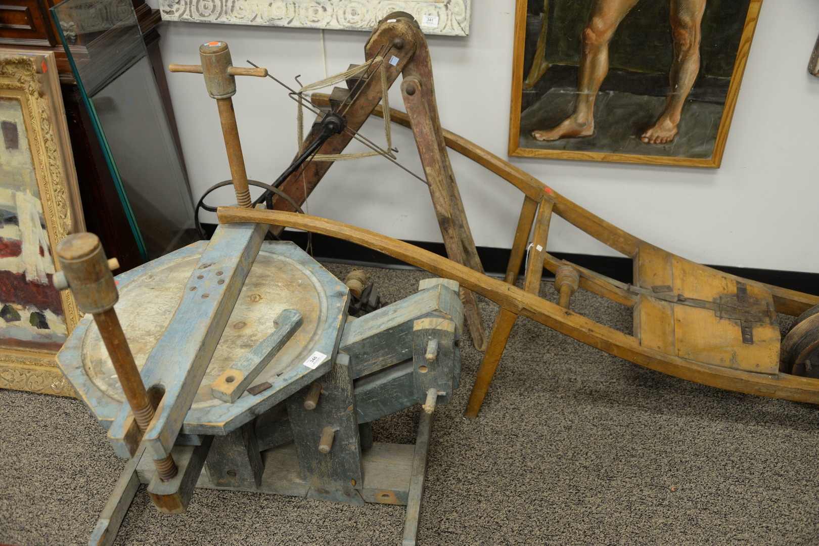 Lot 346: Five Piece Group, to include four primitive farming implements, one iron yarn winder with adjustable spool and leather strap, a large wooden wool winder, diameter 25 inches, a primitive wood corn seeder in wheelbarrow form, length 64 inches, a primit