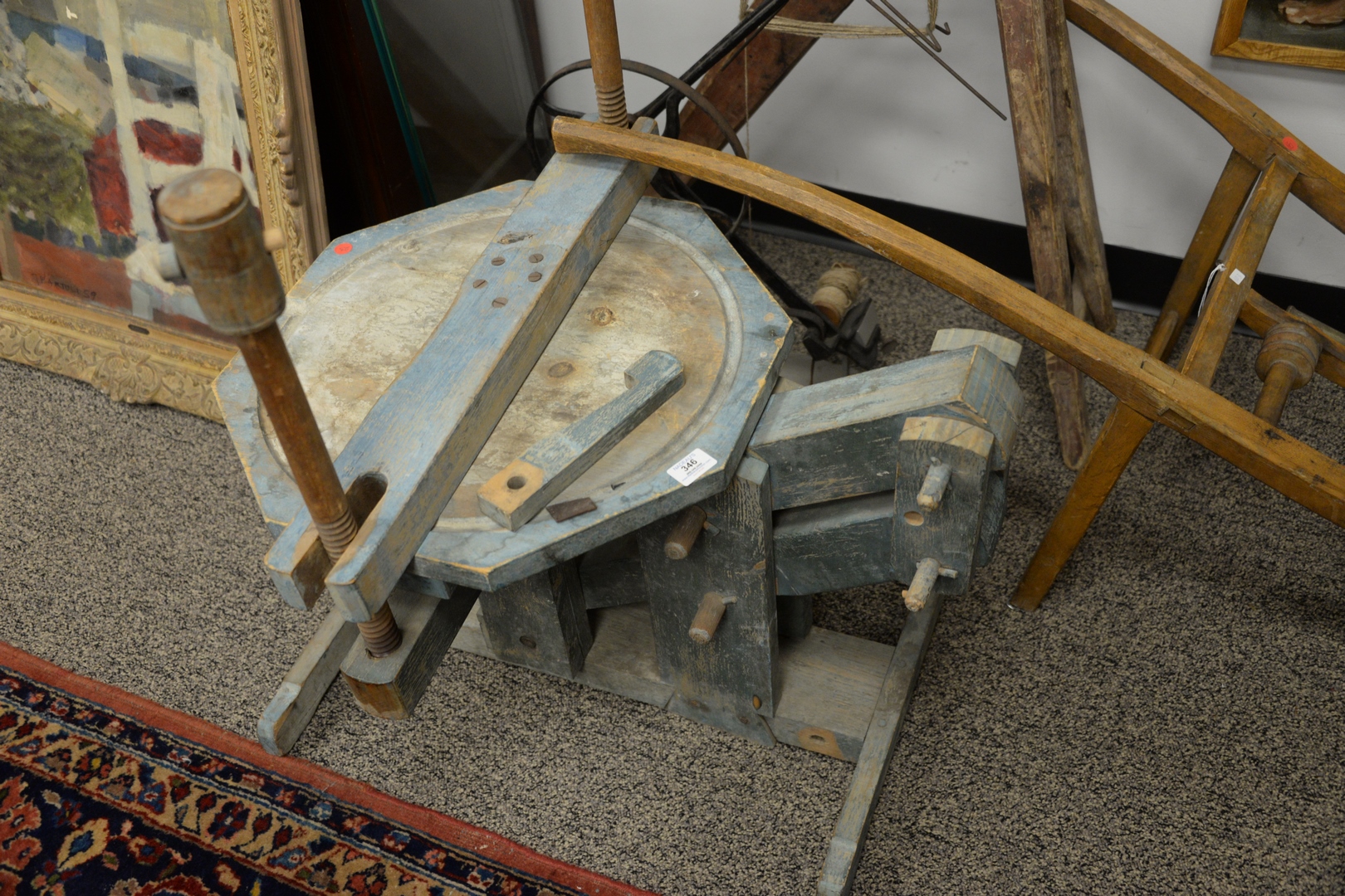 Five Piece Group, to include four primitive farming implements, one iron yarn winder with adjustable spool and leather strap, a large wooden wool winder, diameter 25 inches, a primitive wood corn seeder in wheelbarrow form, length 64 inches, a primitive iron and wood wagon step jack, 19th century, height 34 inches along with a large primitive wood wine press, in blue paint with scissor mechanism, 19th century, height 29 inches, width 23 1/2 inches, depth 32 inches.