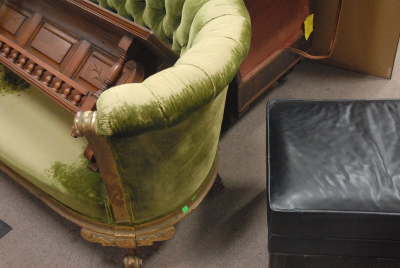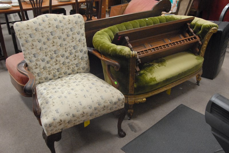 Lot 346: Five piece lot to include Victorian shelf, chair with ball and claw feet, footstool, Continental style loveseat, and iron andirons.