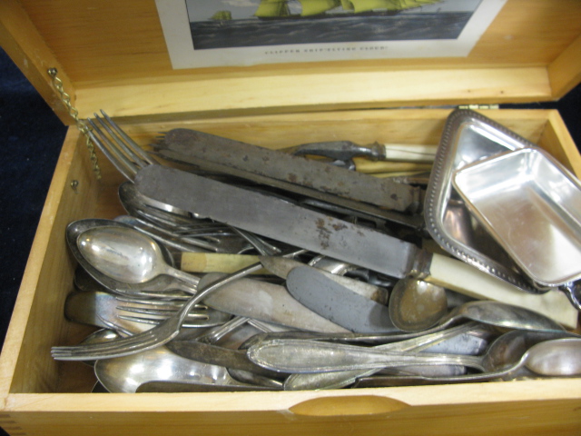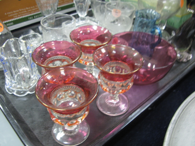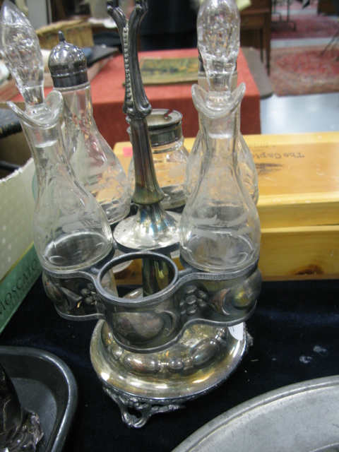 Group lot to include early pressed glass stems,cranberry bowl, oil lamp, hooked rug, caster set and misc silver plated flatware
