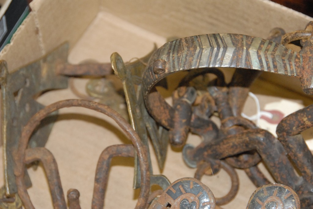 Group of African, Latin, American, and Mexican items two stirrups and horse bits, silver plated designs.