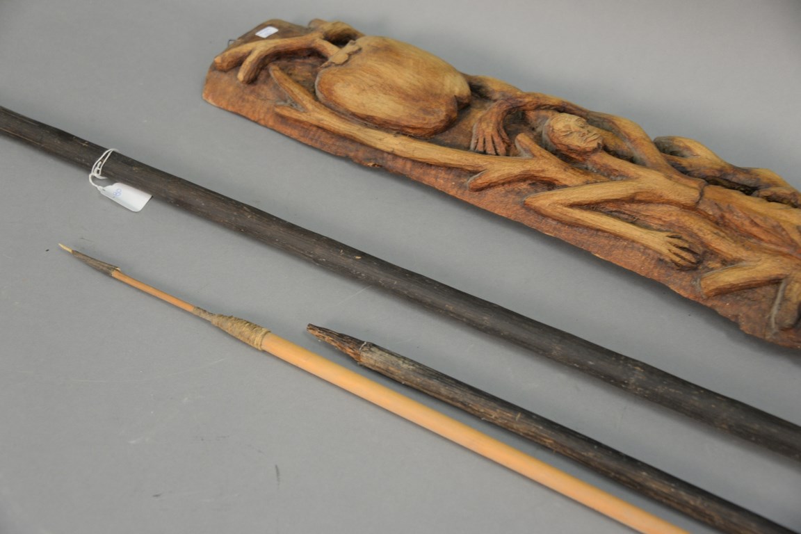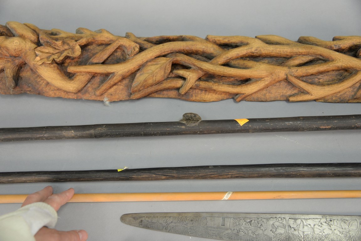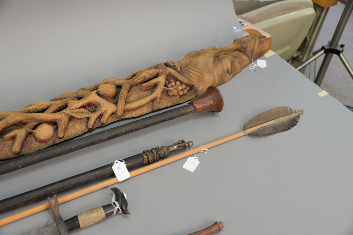 Lot 346: Group of South American items to include a blow dart gun, two spears, cane and a sword lg. 30 in.