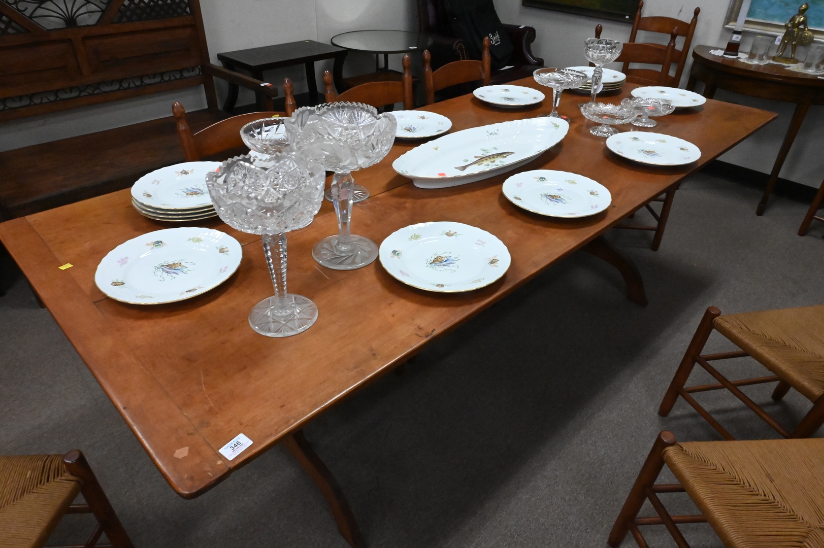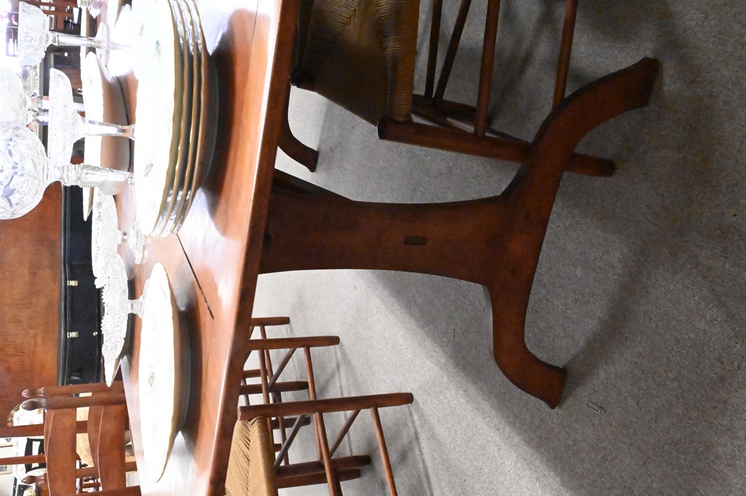 Maple Tavern Table, having two board top ending in breadboard ends, over trestle base, height 30 inches, top 36″ x 89″.