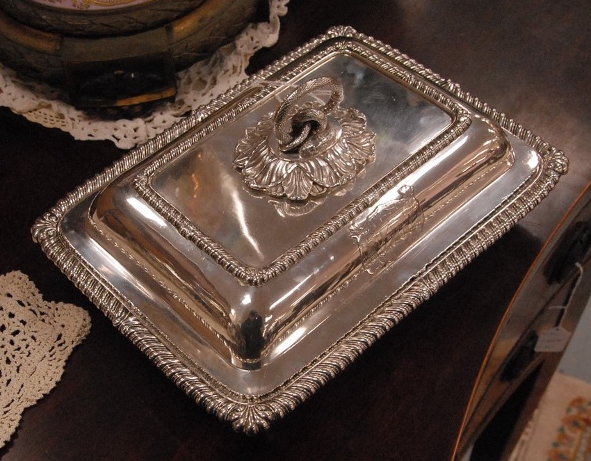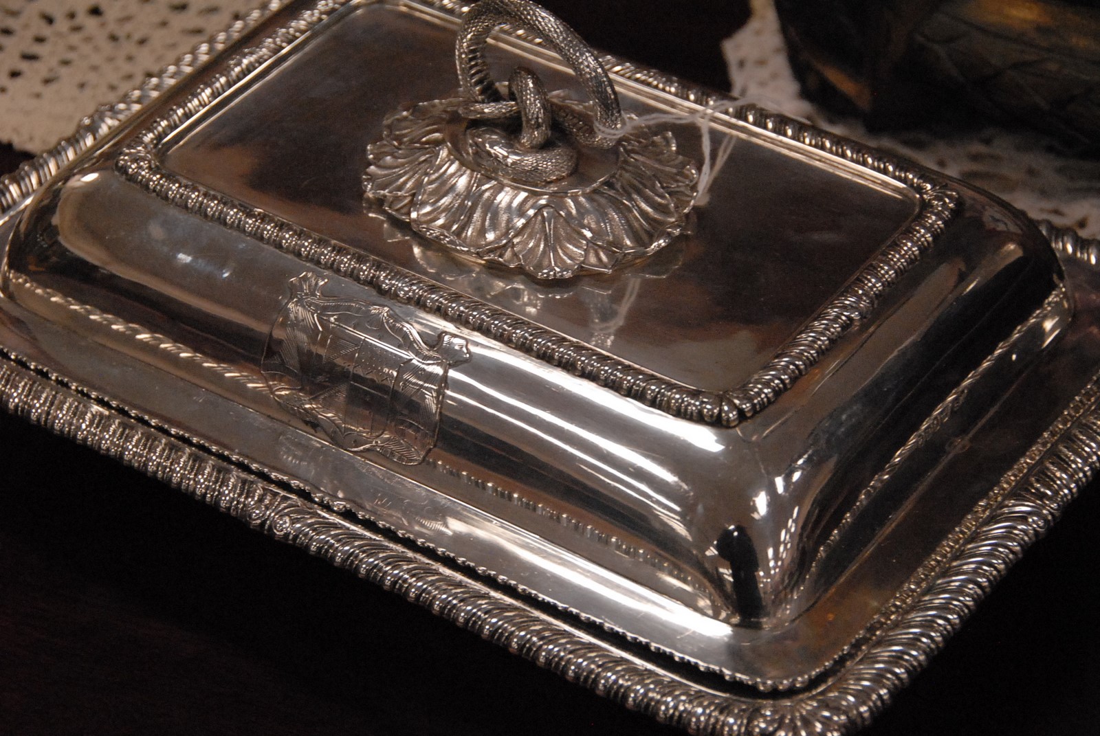 Paul Storr 1771-1844 silver covered entre dish in rectangular form with cover having snake handle on leaf base with gadrooned top and bottom edge above coat of arms on base with gadrooned top edge marked with hallmarks of Paul Storr. ht. 5 1/2in., wd. 12 1/4in. 67.8 t oz.