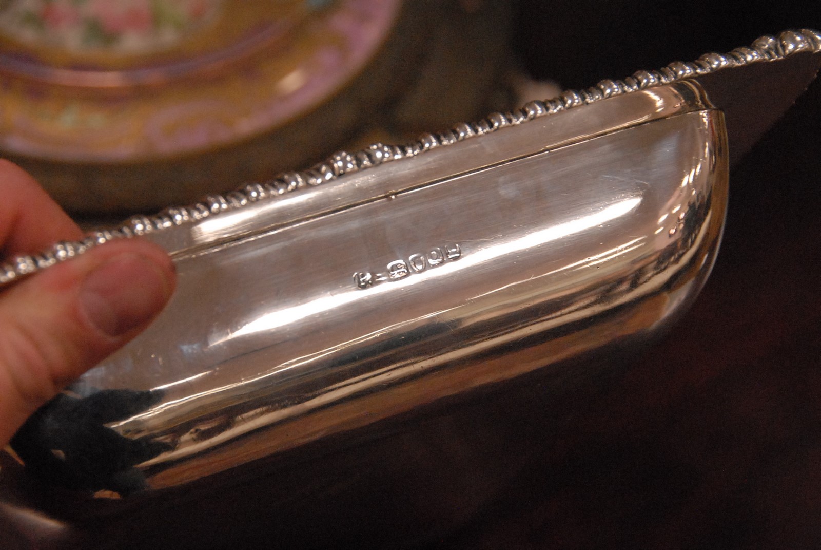 Lot 346: Paul Storr 1771-1844 silver covered entre dish in rectangular form with cover having snake handle on leaf base with gadrooned top and bottom edge above coat of arms on base with gadrooned top edge marked with hallmarks of Paul Storr. ht.