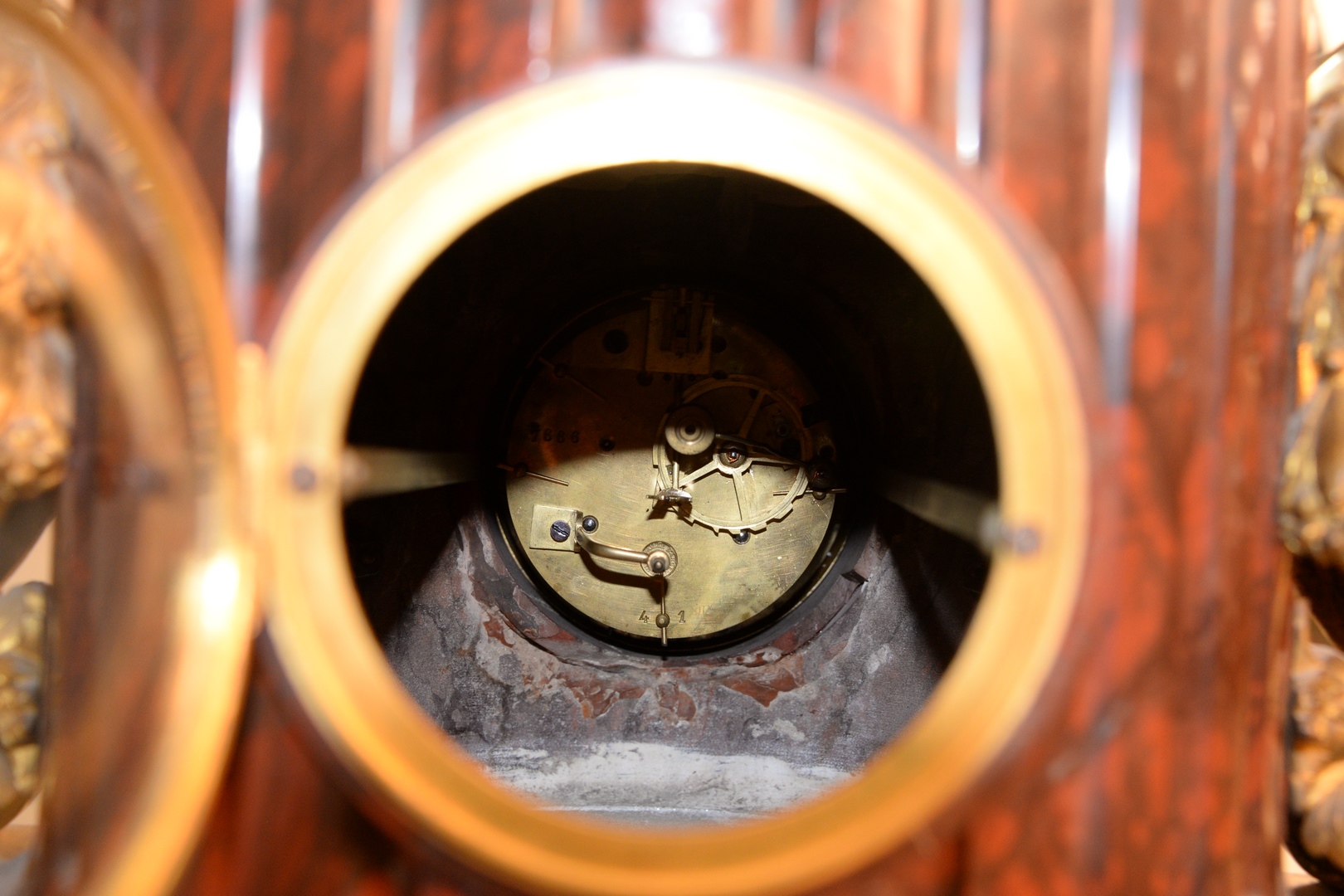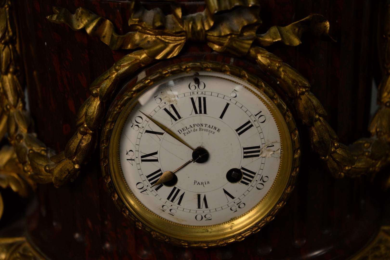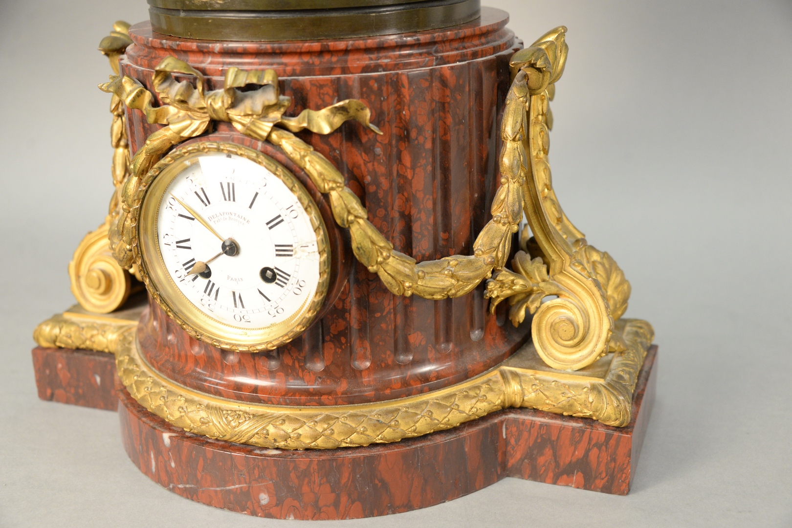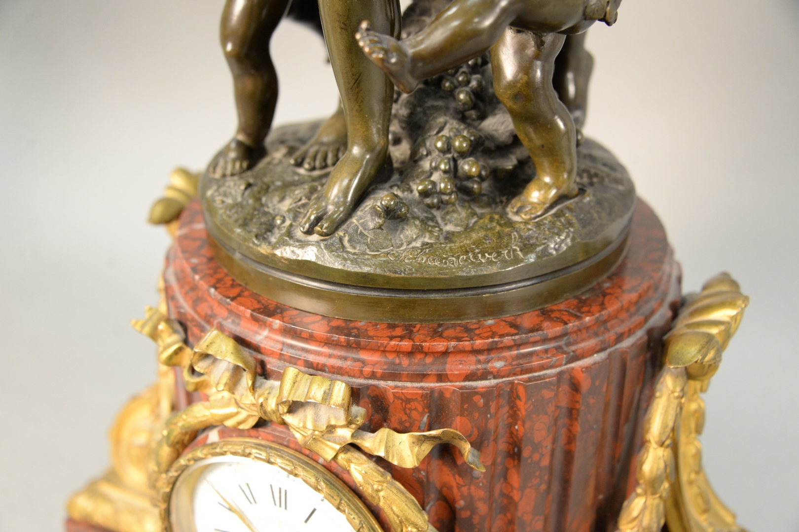 Bacchus family, inscribed on base Schoenewerk, De La Fontaine, resting on large rouge marble clock base, having enameled clock face, marked De La Fontaine, Paris