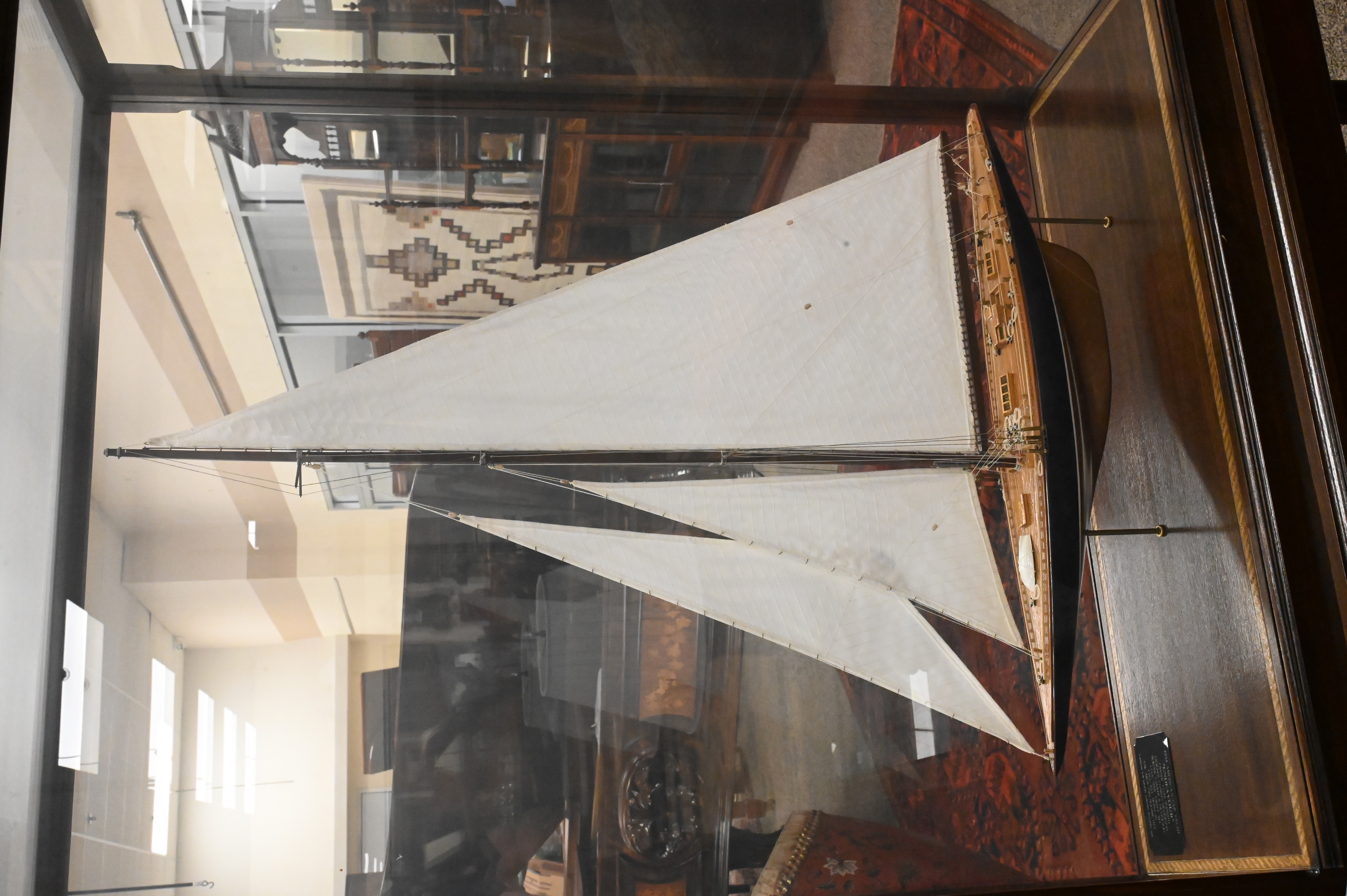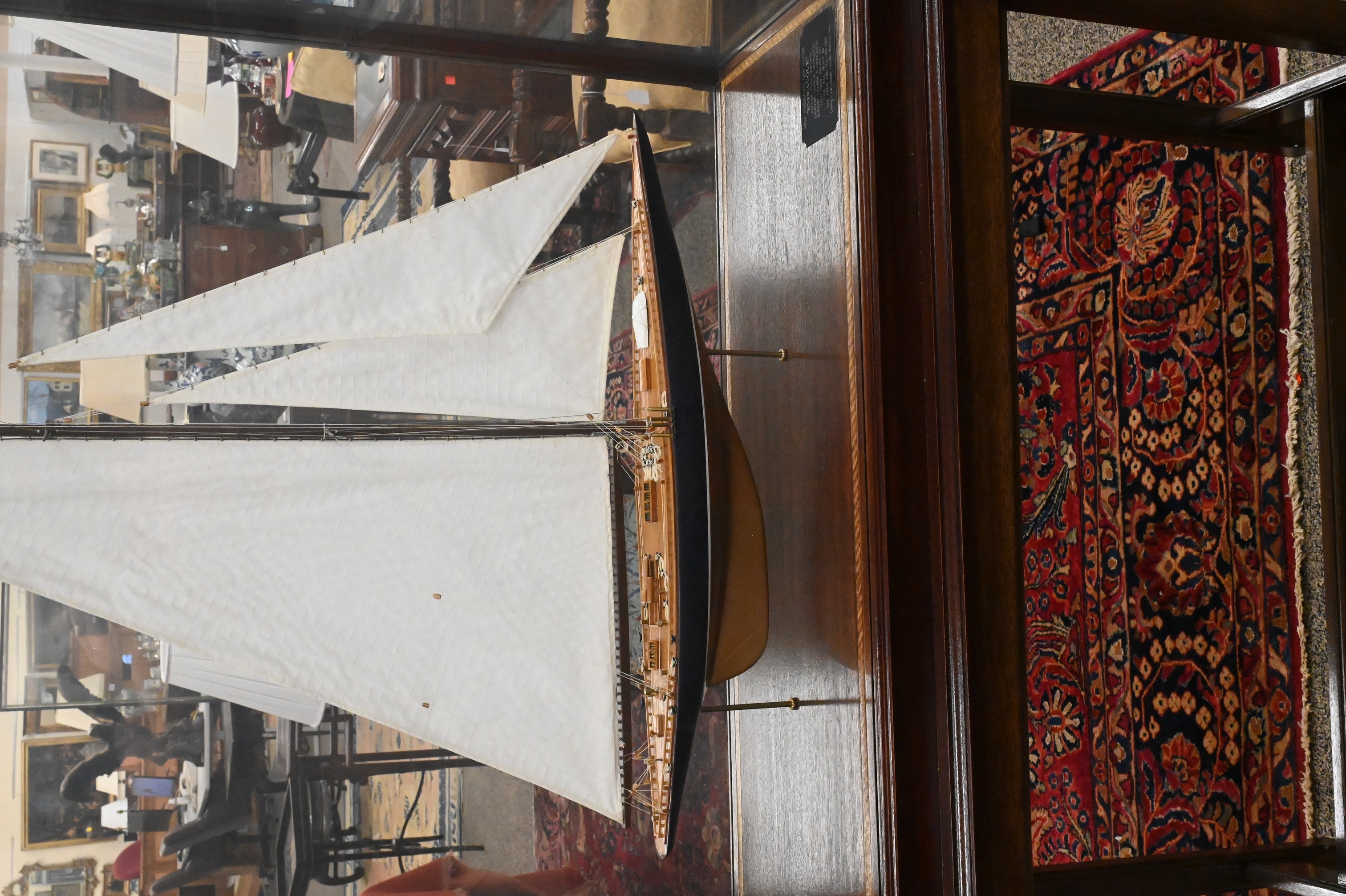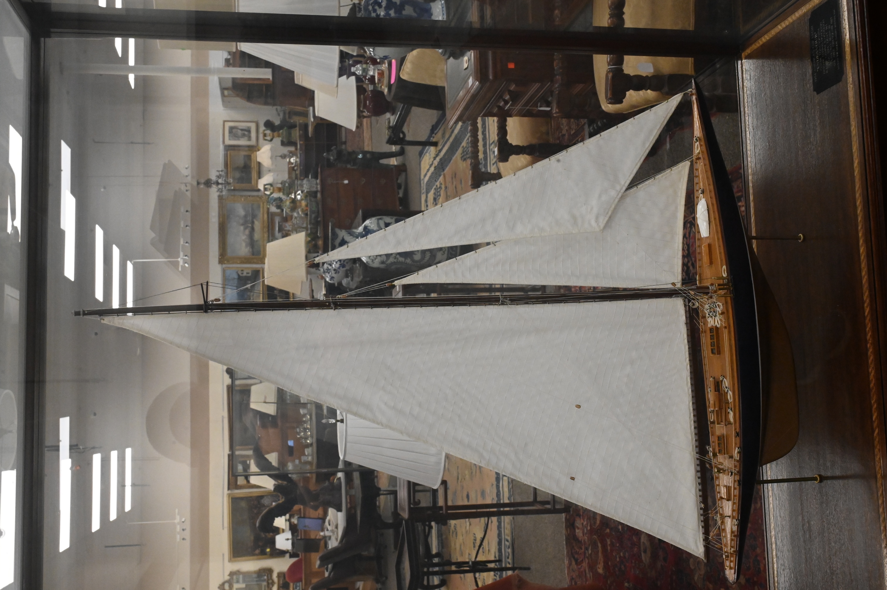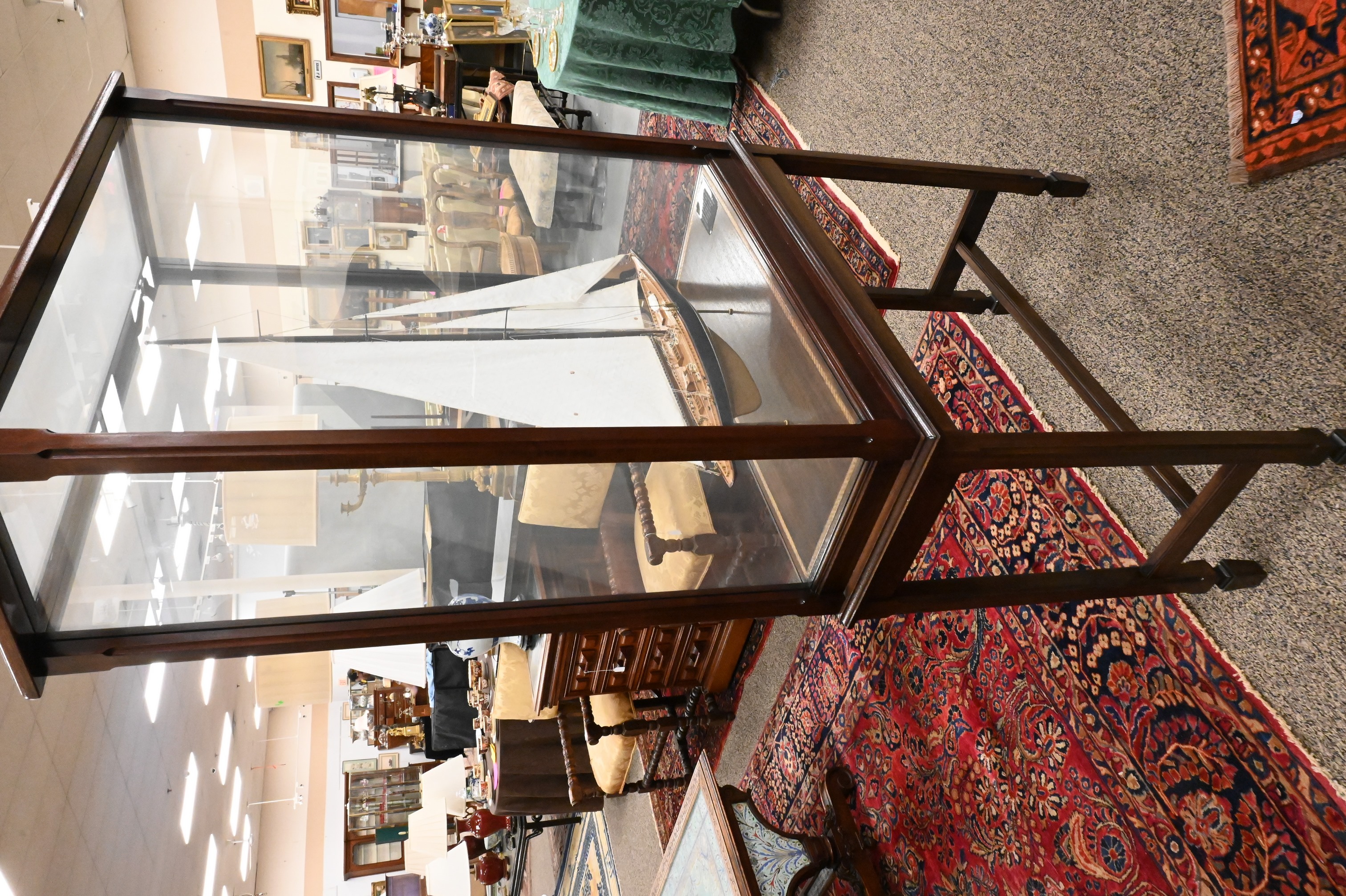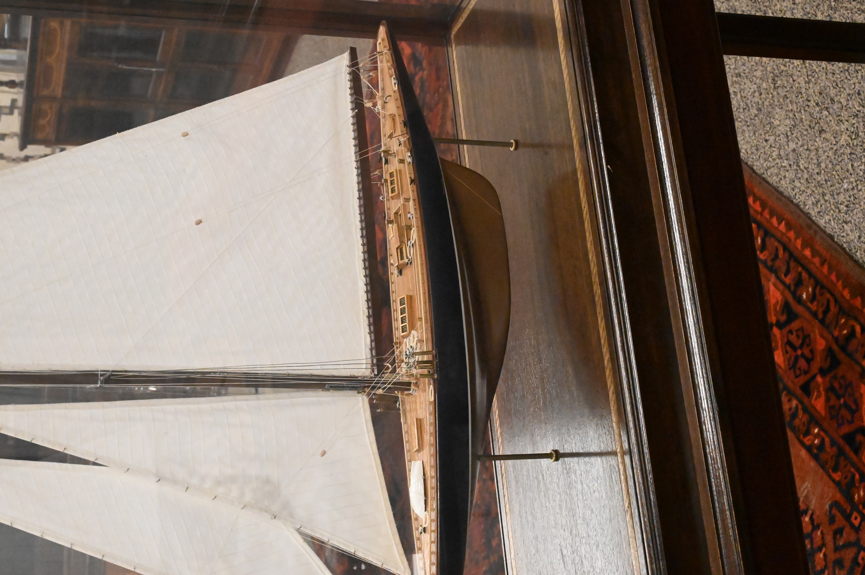Lot 346: Sailing Boat Model “Endeavour” in Mahogany and Glass Case on Mahogany Stand