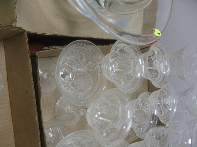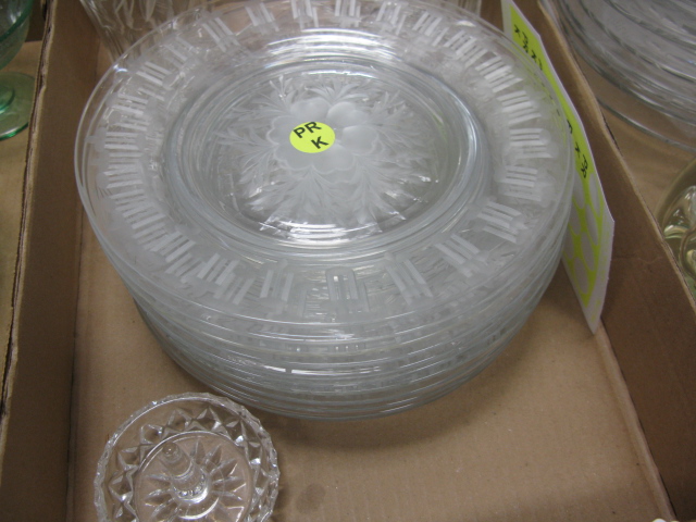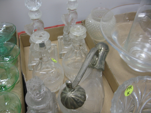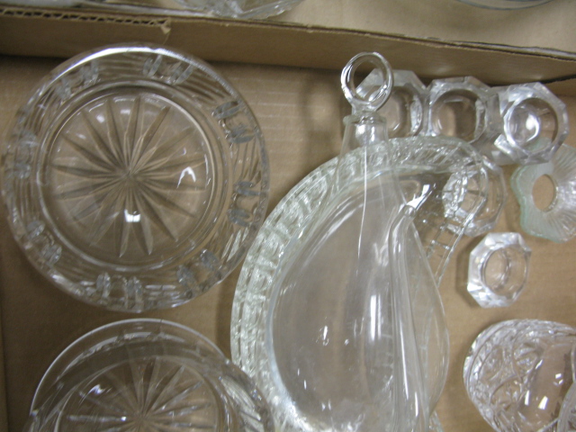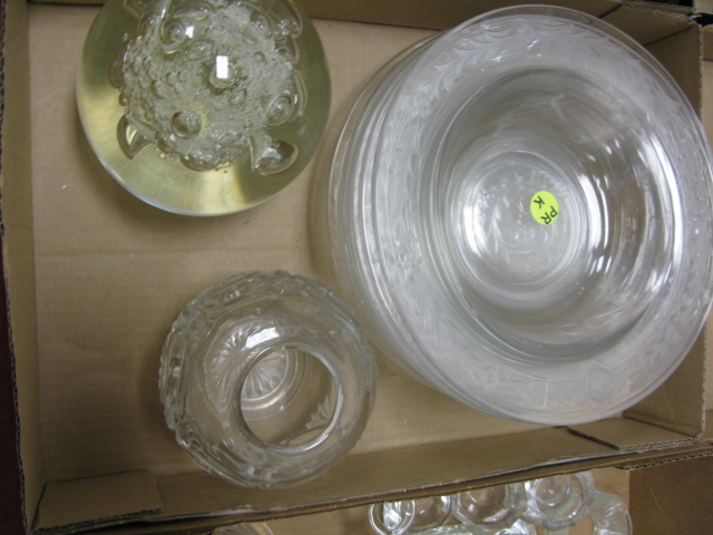 Six box lots of pressed glass and crystal, plates, pitcher and bowl sets, decanters, dolphin candlesticks, bowls, large paperweight etc.