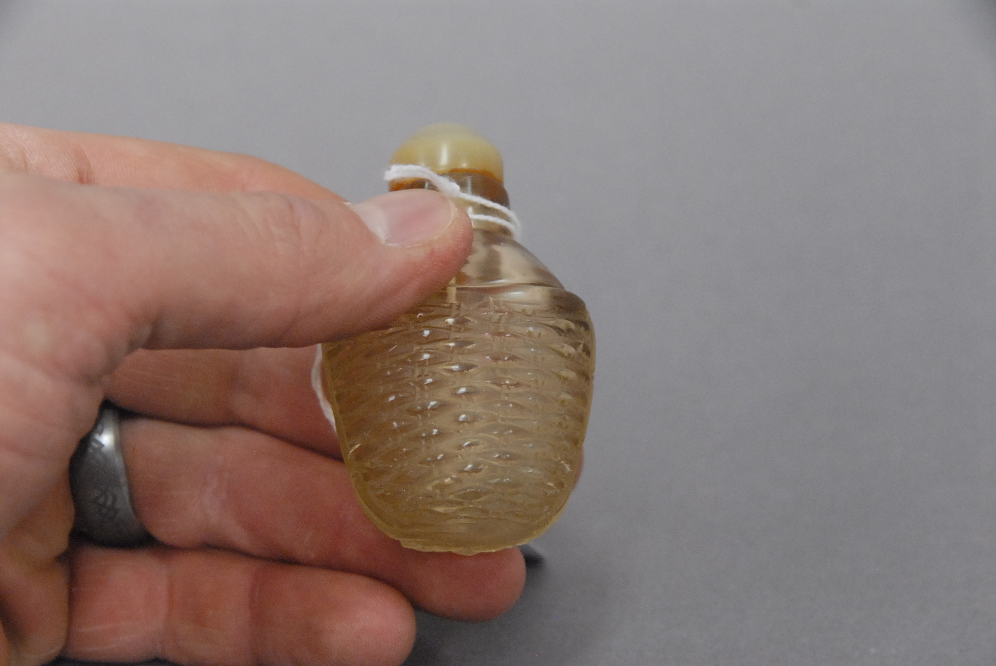 Clear glass snuff bottle carved in basket form with jade top, ht 2 1/2.