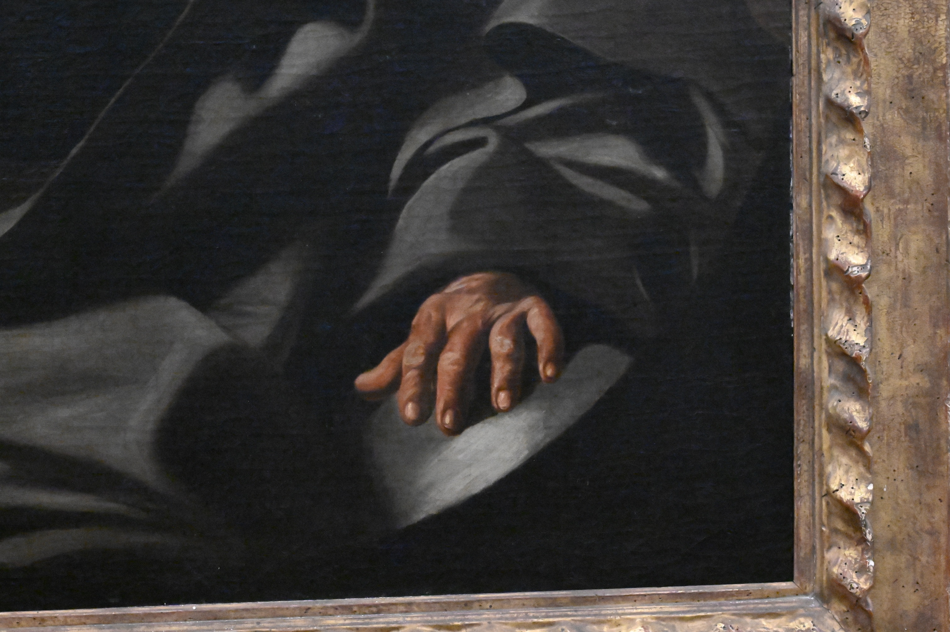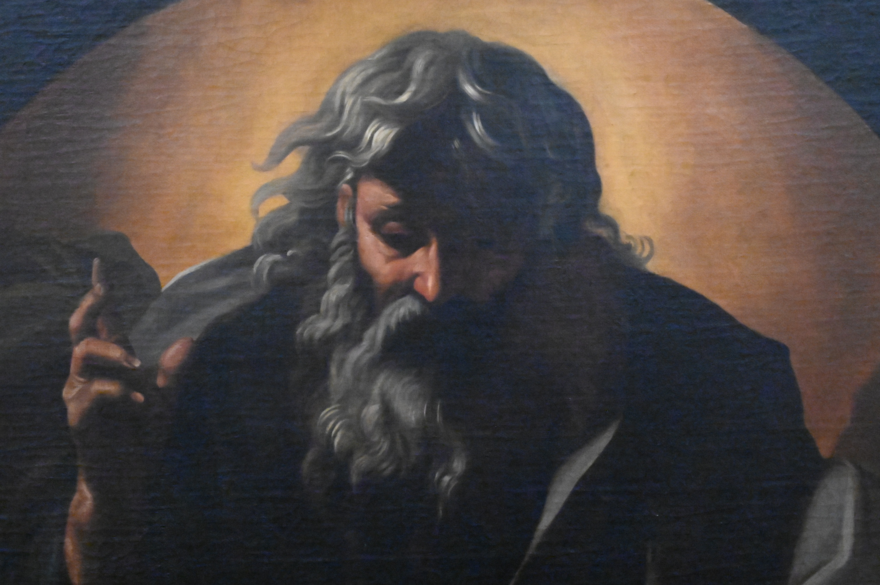 depicting God the Father in a moment of divine gesture, rendered with dramatic chiaroscuro and a radiant golden nimbus, rendered after Lanfranco original composition for the cimasa of the high altar in Santo Spirito (Filippo Neri), Fermo, painted circa 1616