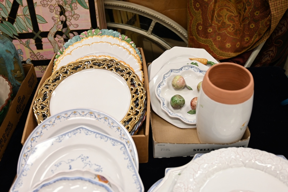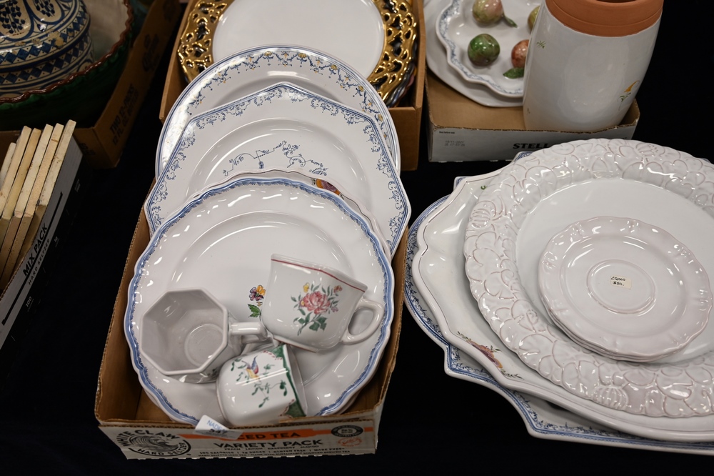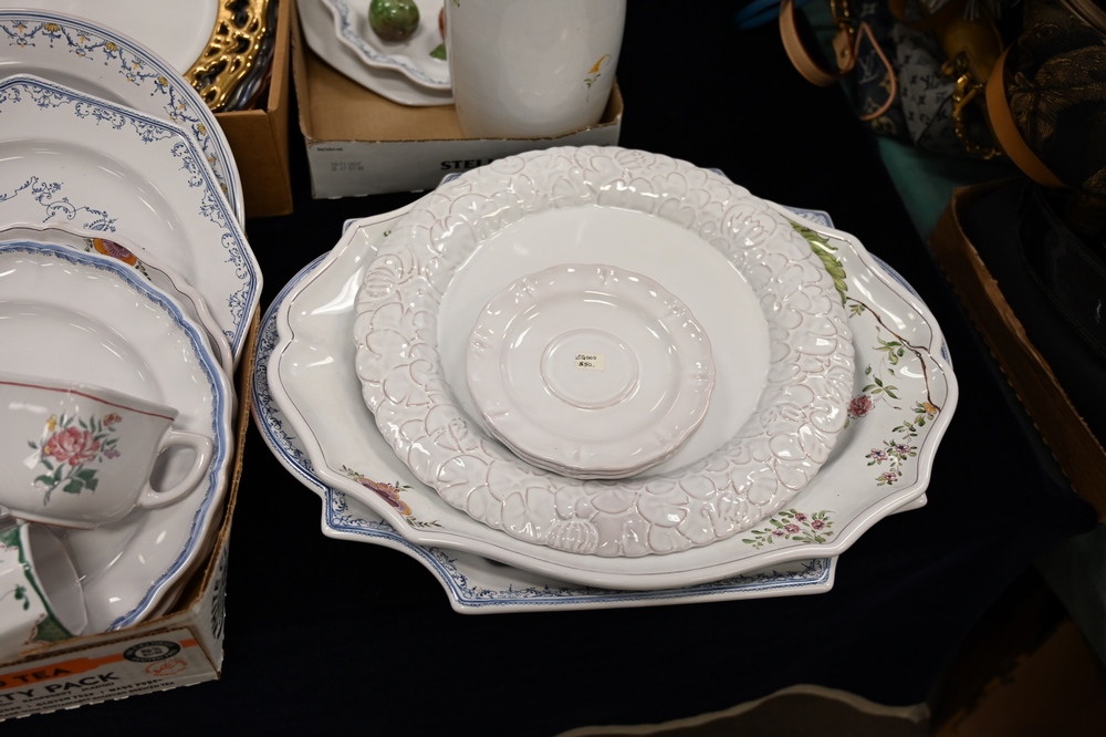Lot 347: Group Lot of French Faience Atelier de Segries Plates, Chargers, Cups and Serving Trays, to include trompe l’oeil plates, several chargers, a compote, and plates in assorted colors and sizes, along with six reticulated chargers, diameter 12 1/2 inches.