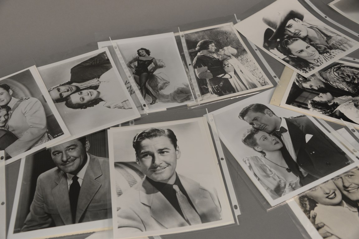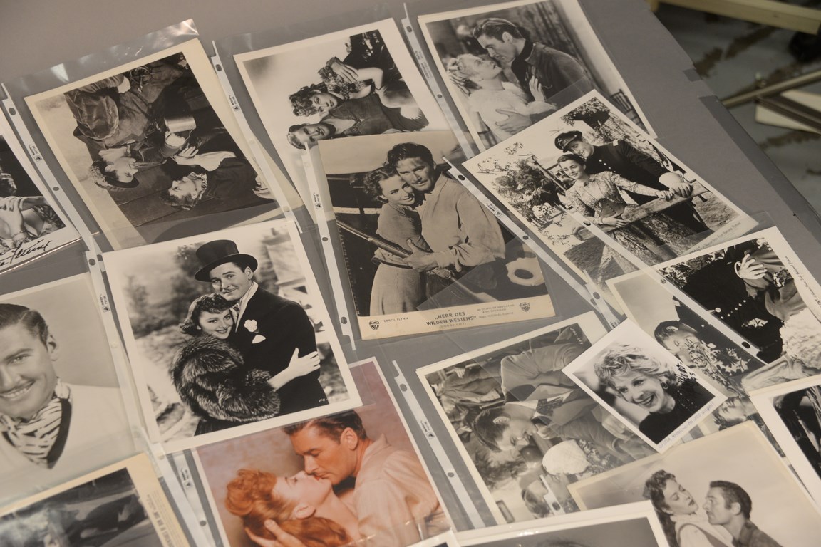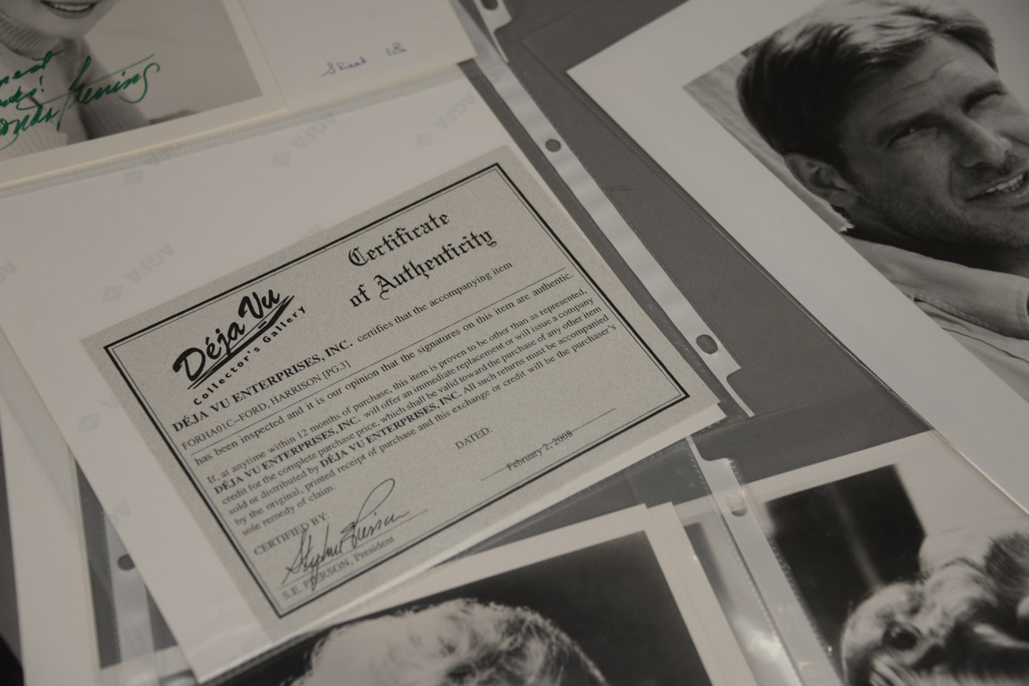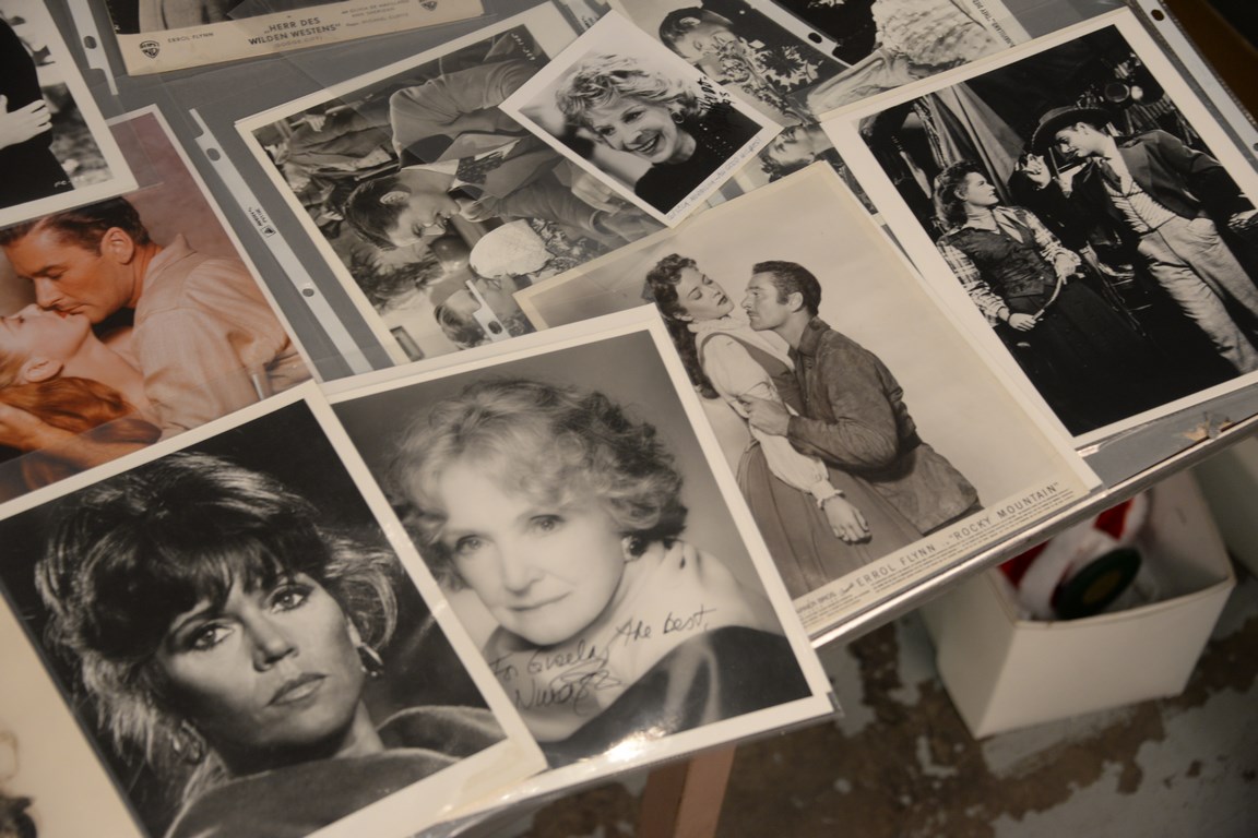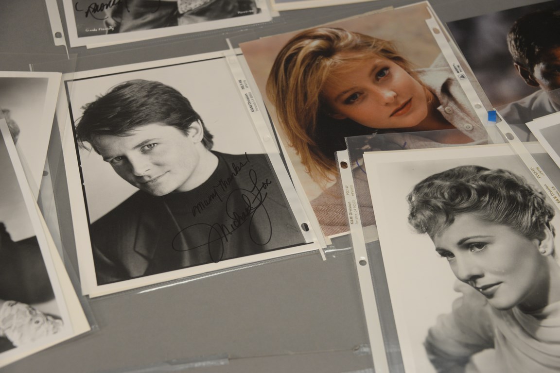 Group of 72 photographs, 38 are autographed including 2 Mel Ferrer, 1 Sally Field, 2 Eddy Fisher, 1 Peggy Fleming, 8 Rhonda Fleming, 2 Nina Foch, 2 Jane Fonda, 12 Joan Fontaine, 4 Harrison Ford, 1 Jodi Foster, 1 John Forsythe, 1 Michael J. Fox, and 1 Robert Foxworth and 34 are unsigned including 31 Errol Flynn, 2 Jane Fonda, and 1 Harrison Ford.