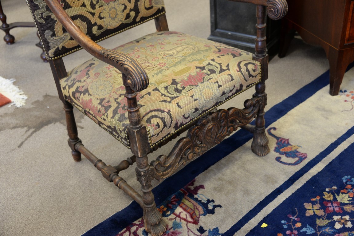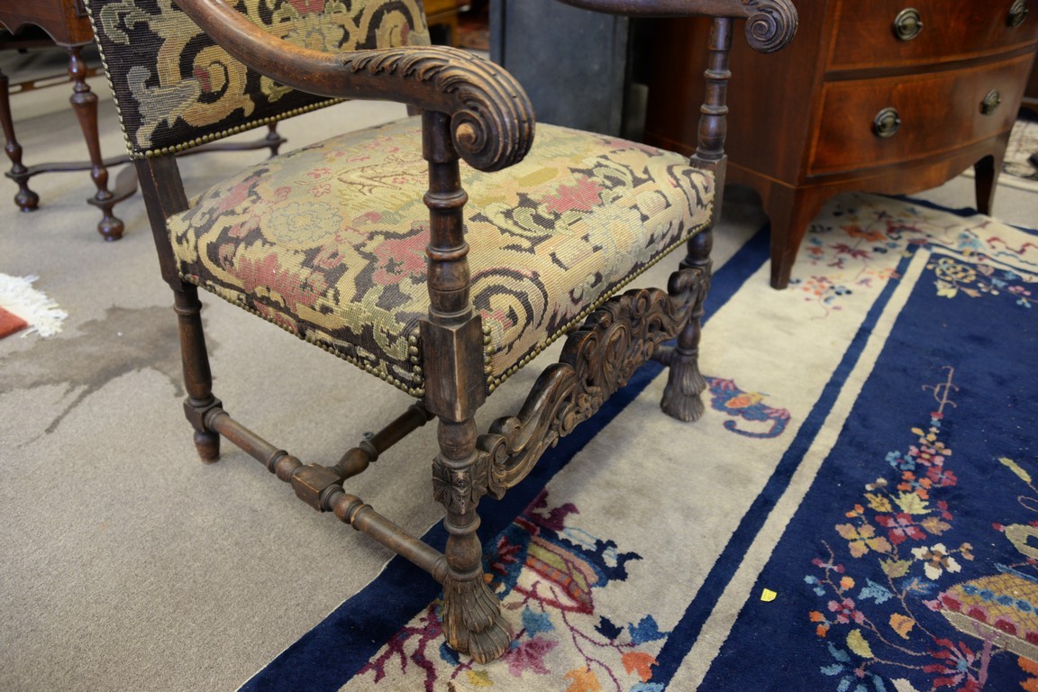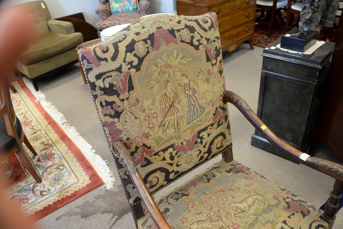 Lot 347: Jacobean style occasional chair with needlepoint and petit point upholstery. ht. 47in.