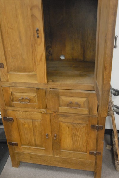 Large pine cabinet having shelves and drawers, ht. 77in. wd. 36in. dp. 25in.
