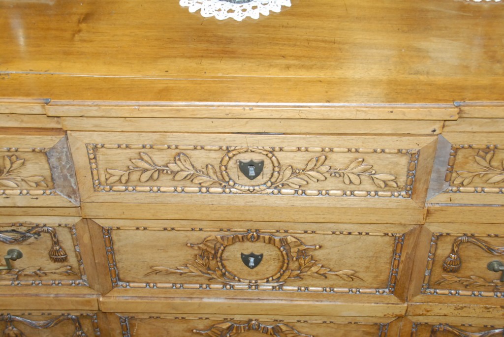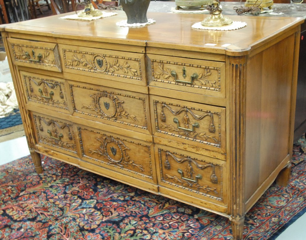 Louis XVI 19th century style chest with three drawers over two drawers, all set on turned and fluted legs, 19th century. height 34in. length 54 1/2in.