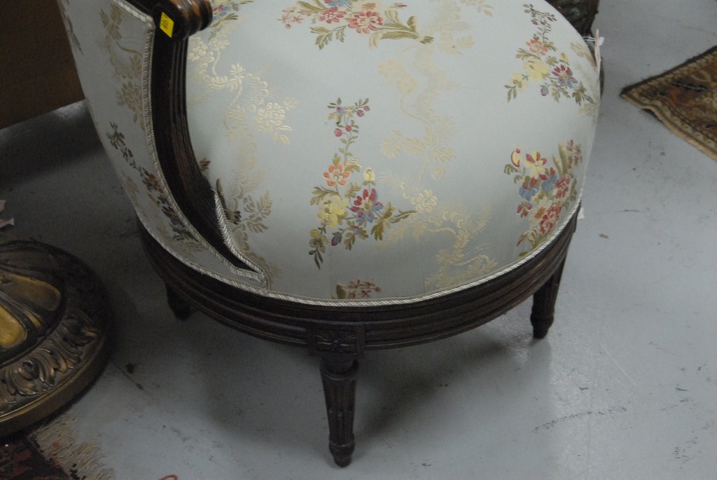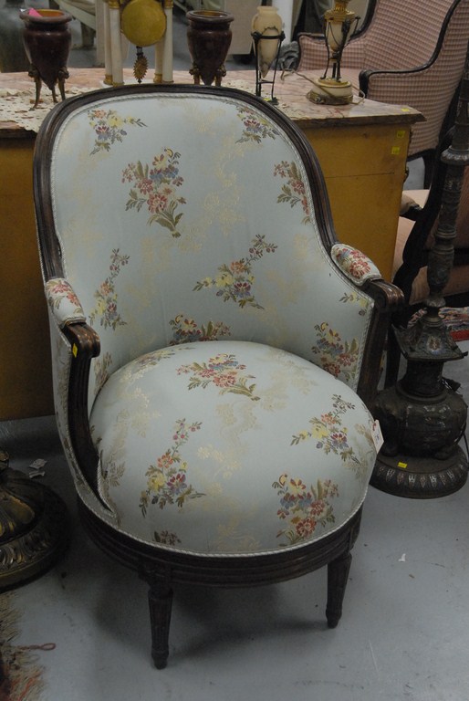 Lot 347: Louis XVI style swivel bergere having rounded tub, back and round seat set on swivel base set on round fluted tapered legs, upholste…