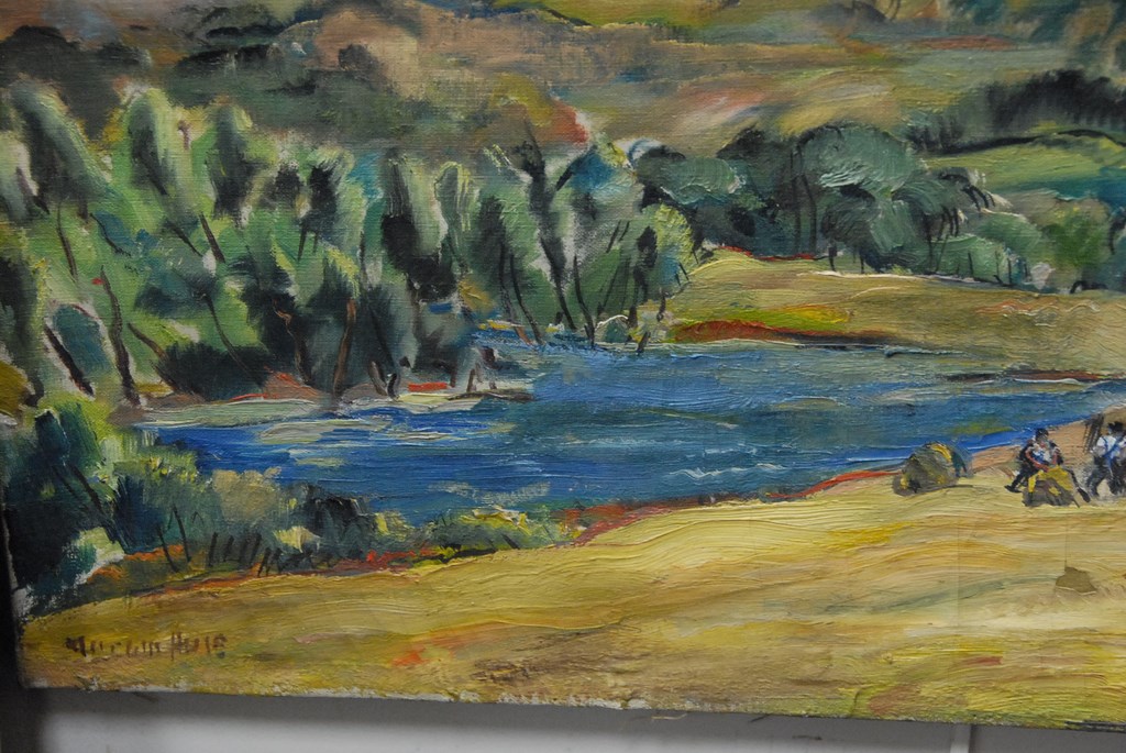 Lot 347: Marion Huse 1896-1967 HAYING WITH MOUNTAINS IN BACKGROUND oil on canvas signed lower left Marion Huse 18 X 28…