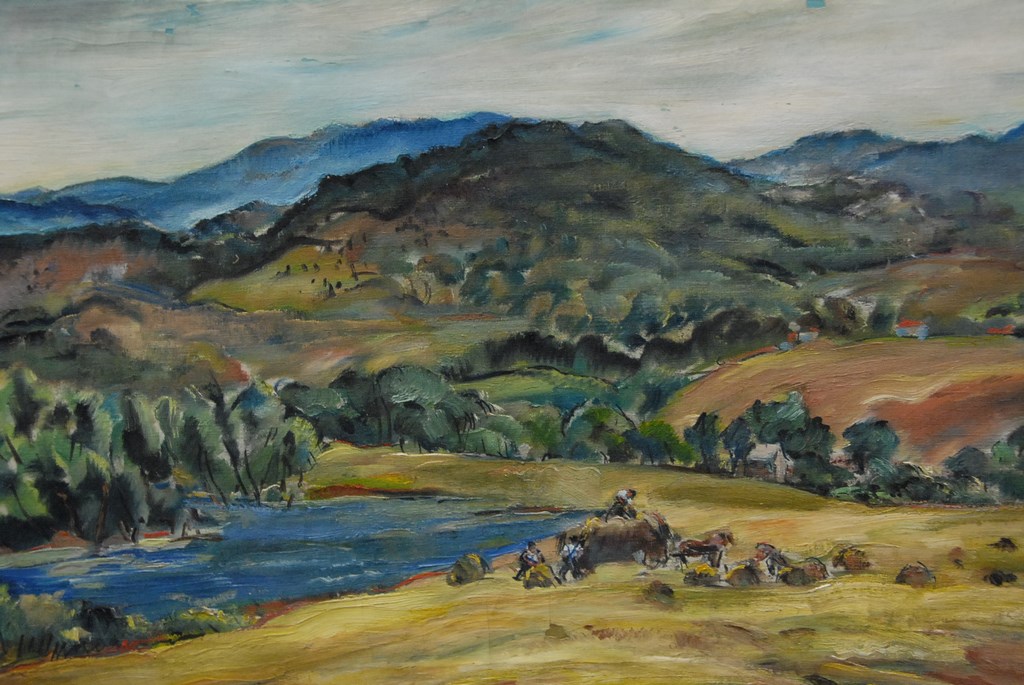 Marion Huse 1896-1967 HAYING WITH MOUNTAINS IN BACKGROUND oil on canvas signed lower left Marion Huse 18 X 28 Being auctioned to benefit the New Britain Museum of American Art.