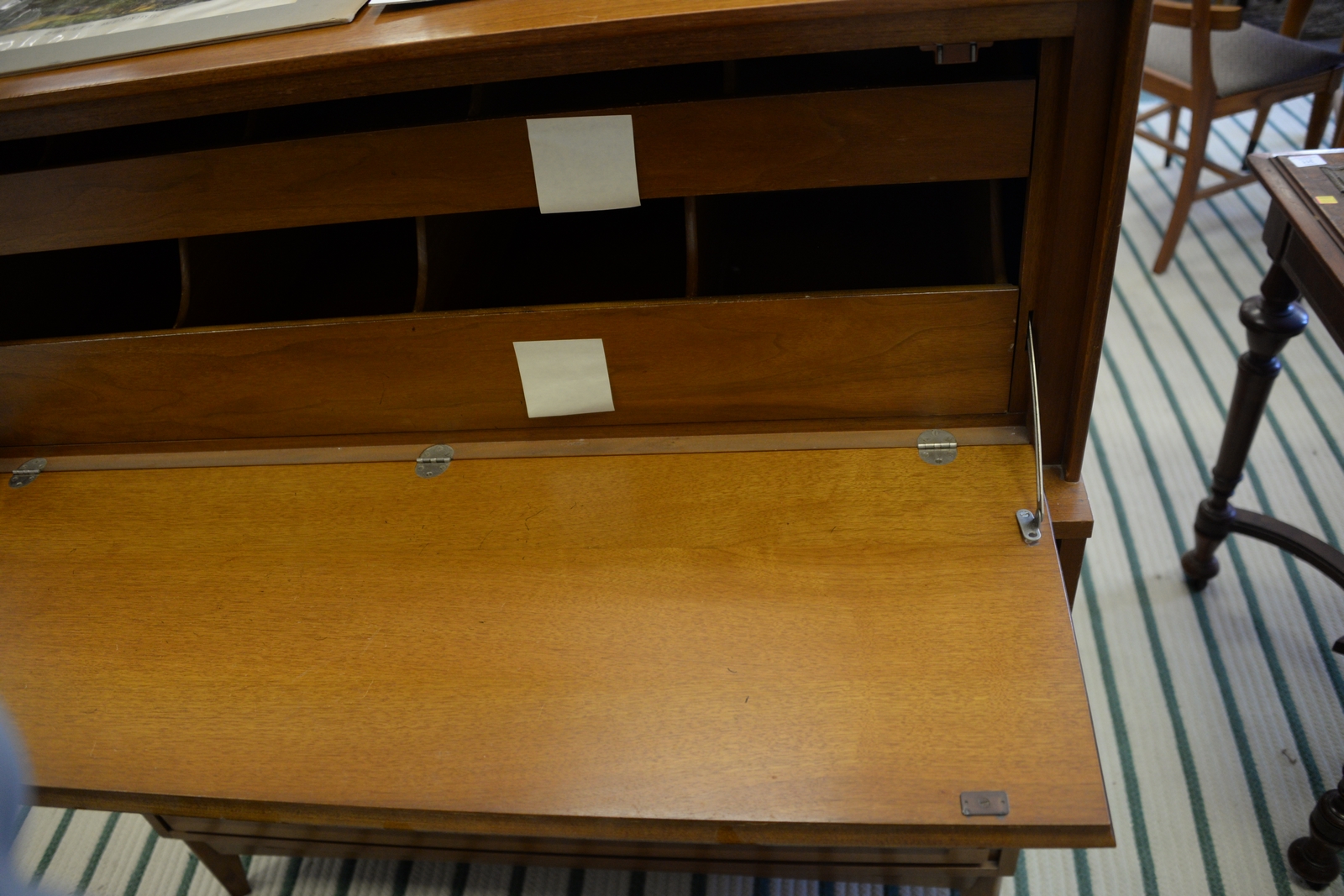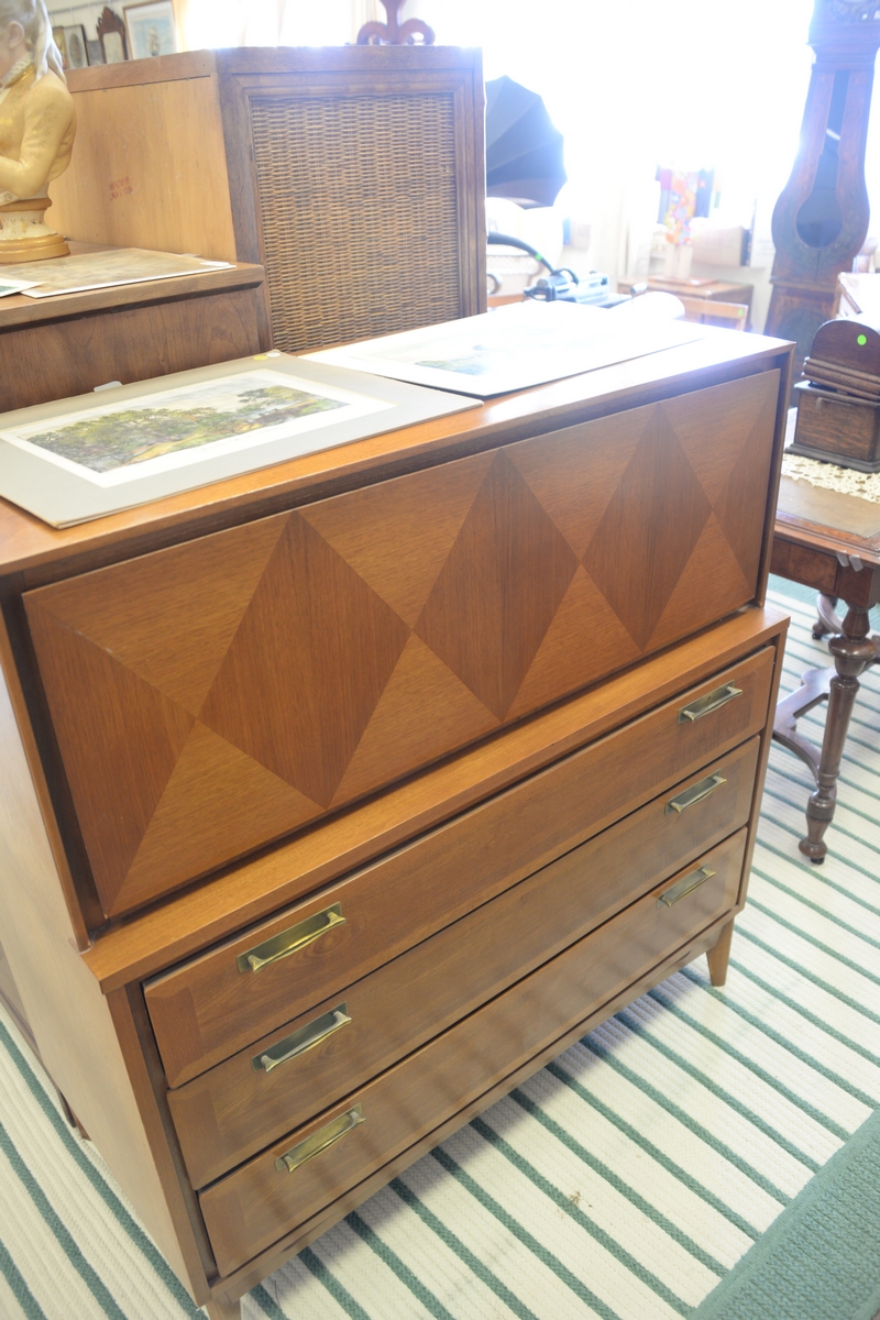 Modern walnut chest with drop front having two fitted drawers. ht. 47in., wd. 44in.