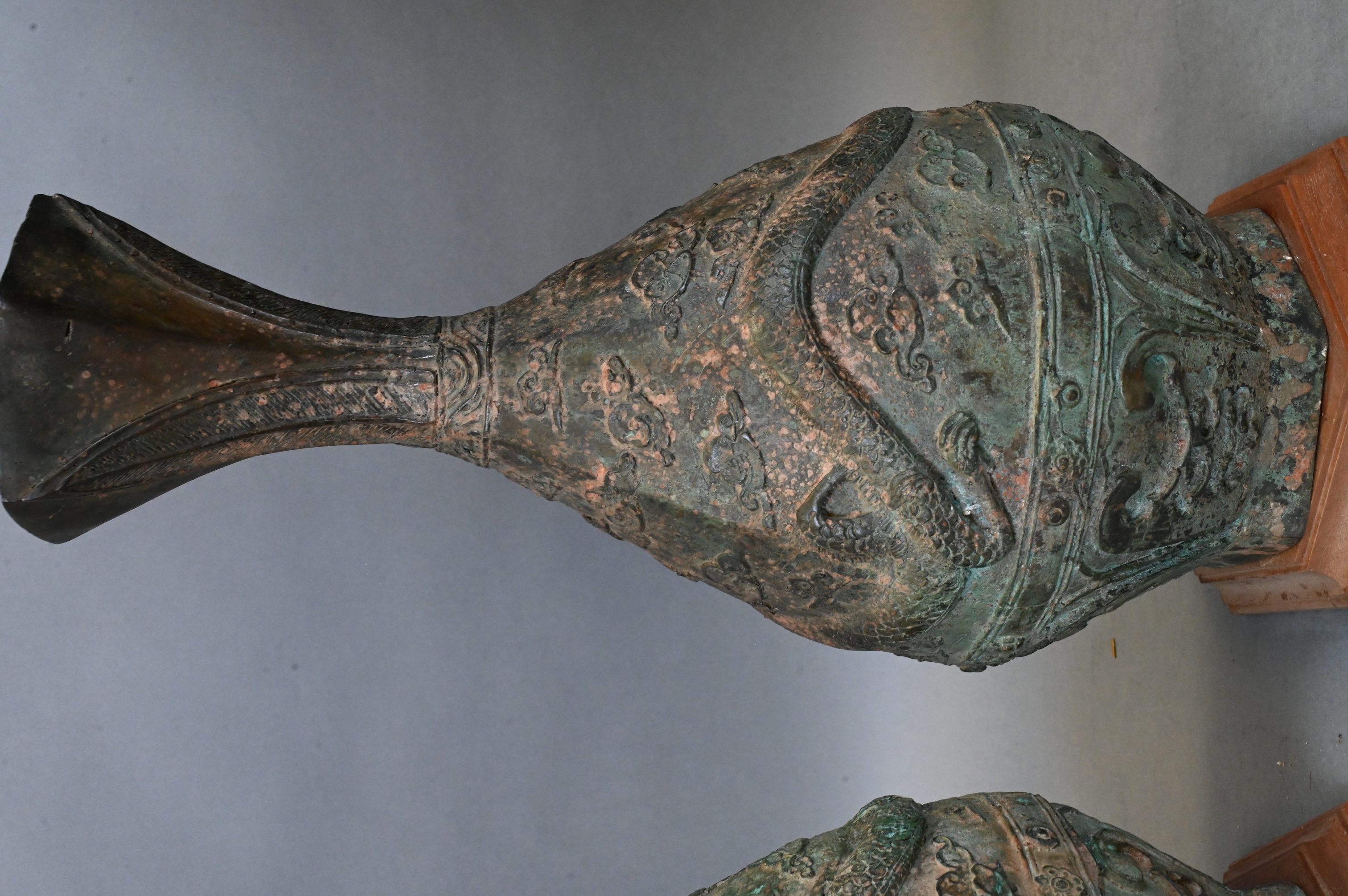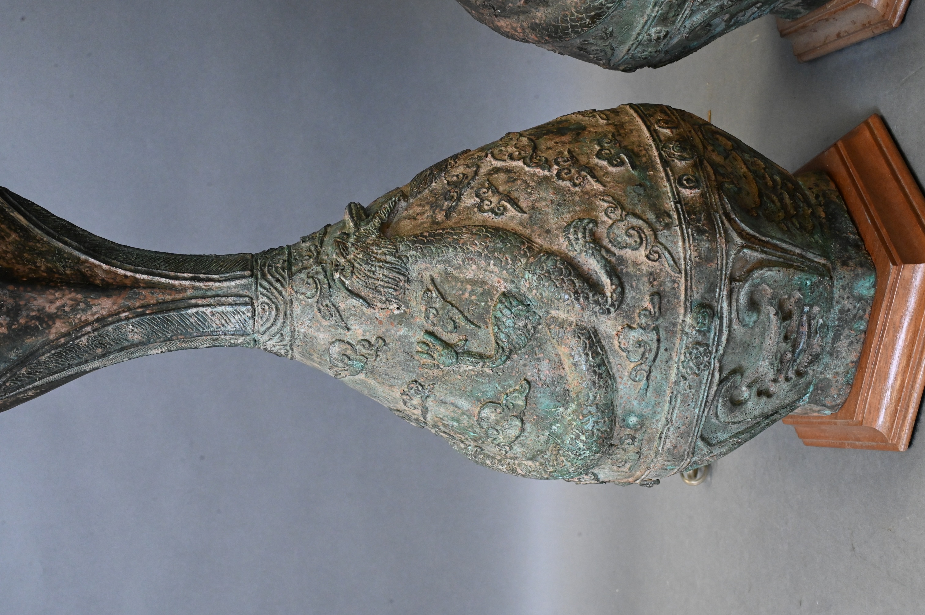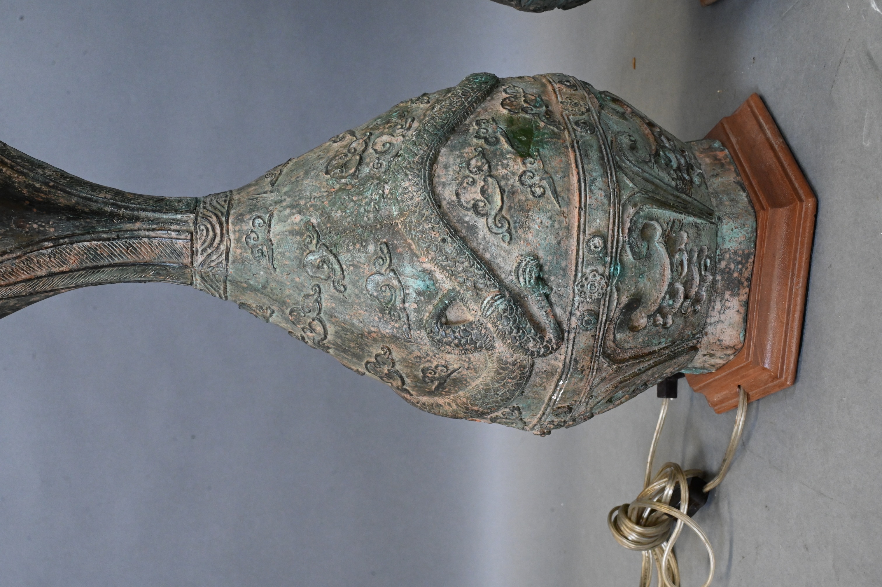 set on wooden bases, no shades, both having flared trumped neck over teardrop shaped body, raised five clawed dragon amongst clouds motif with geometric accents