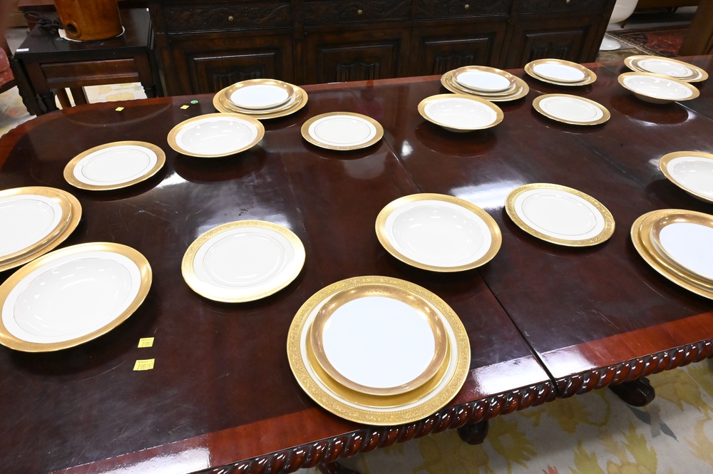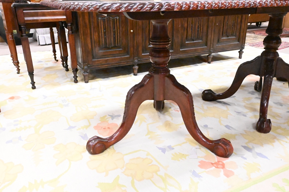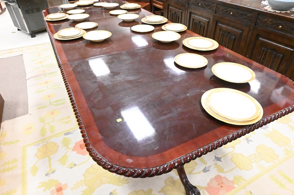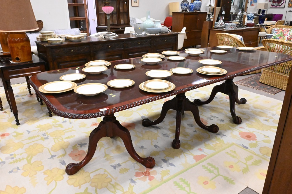 Lot 347: Reproduction Mahogany Triple Pedestal Dining Table, having rope edge top over carved pedestals with ball and claw feet, having two 20 inch leaves, late 20th century, (one small chip on edge), height 31 inches, top 46″ x 112″, top with leaves opens to 46″ x 152″.
