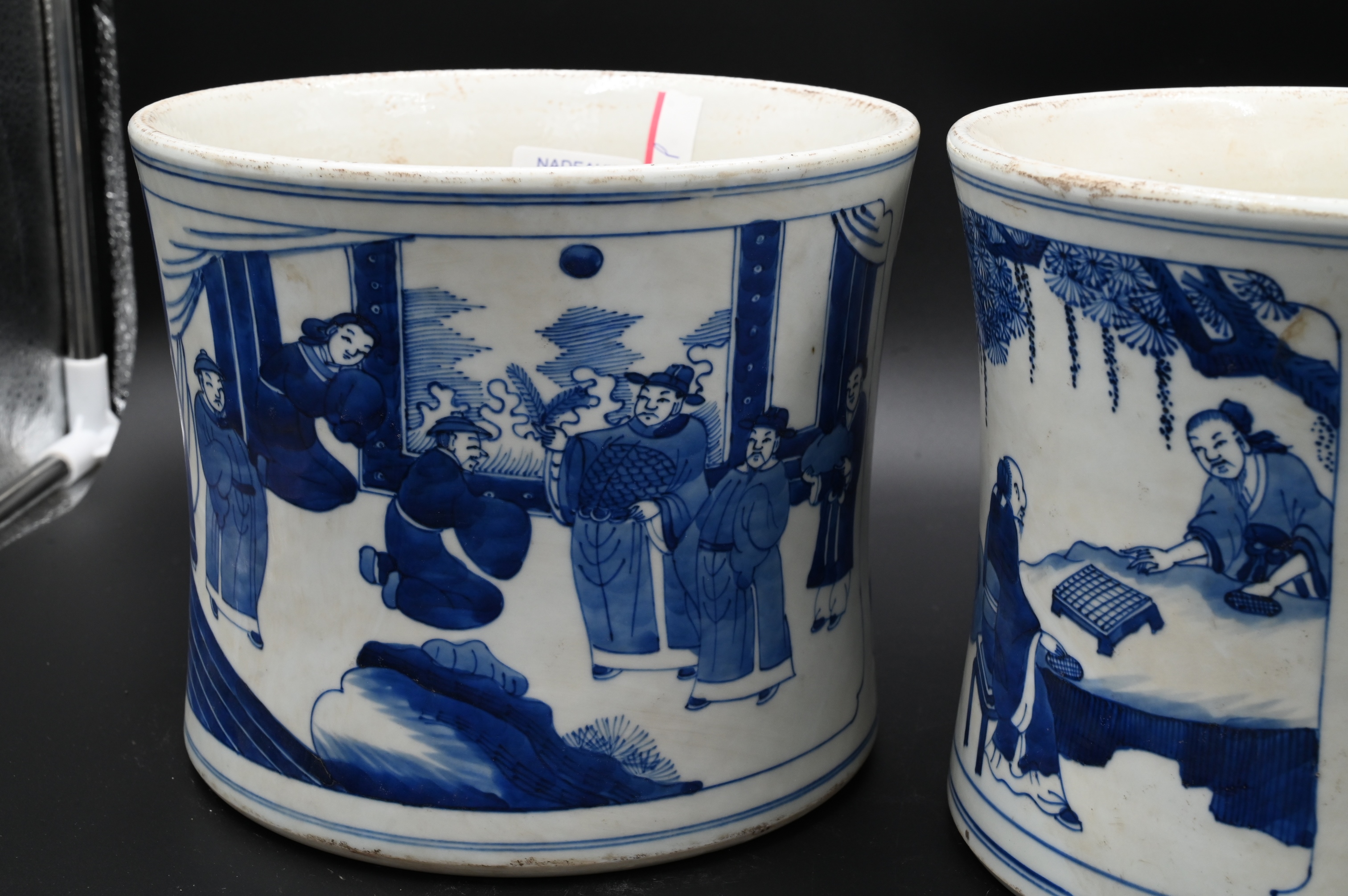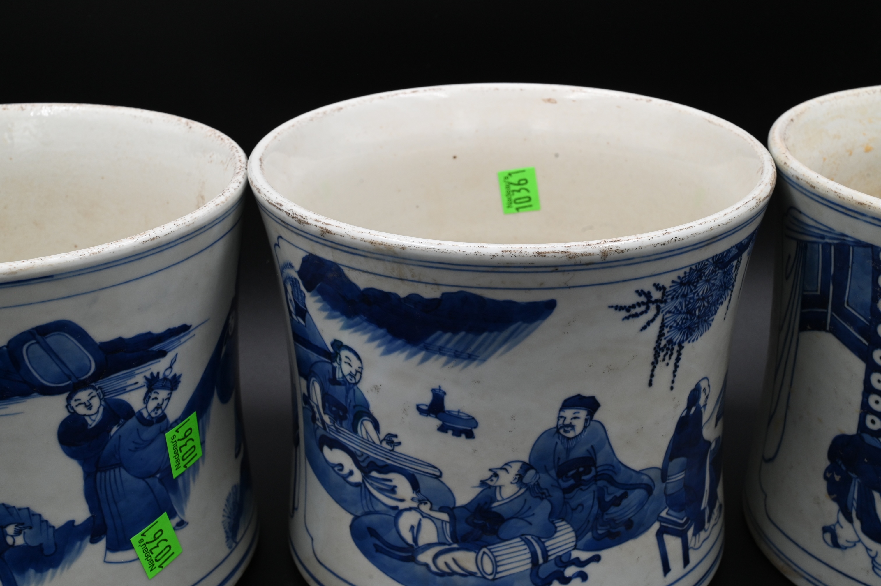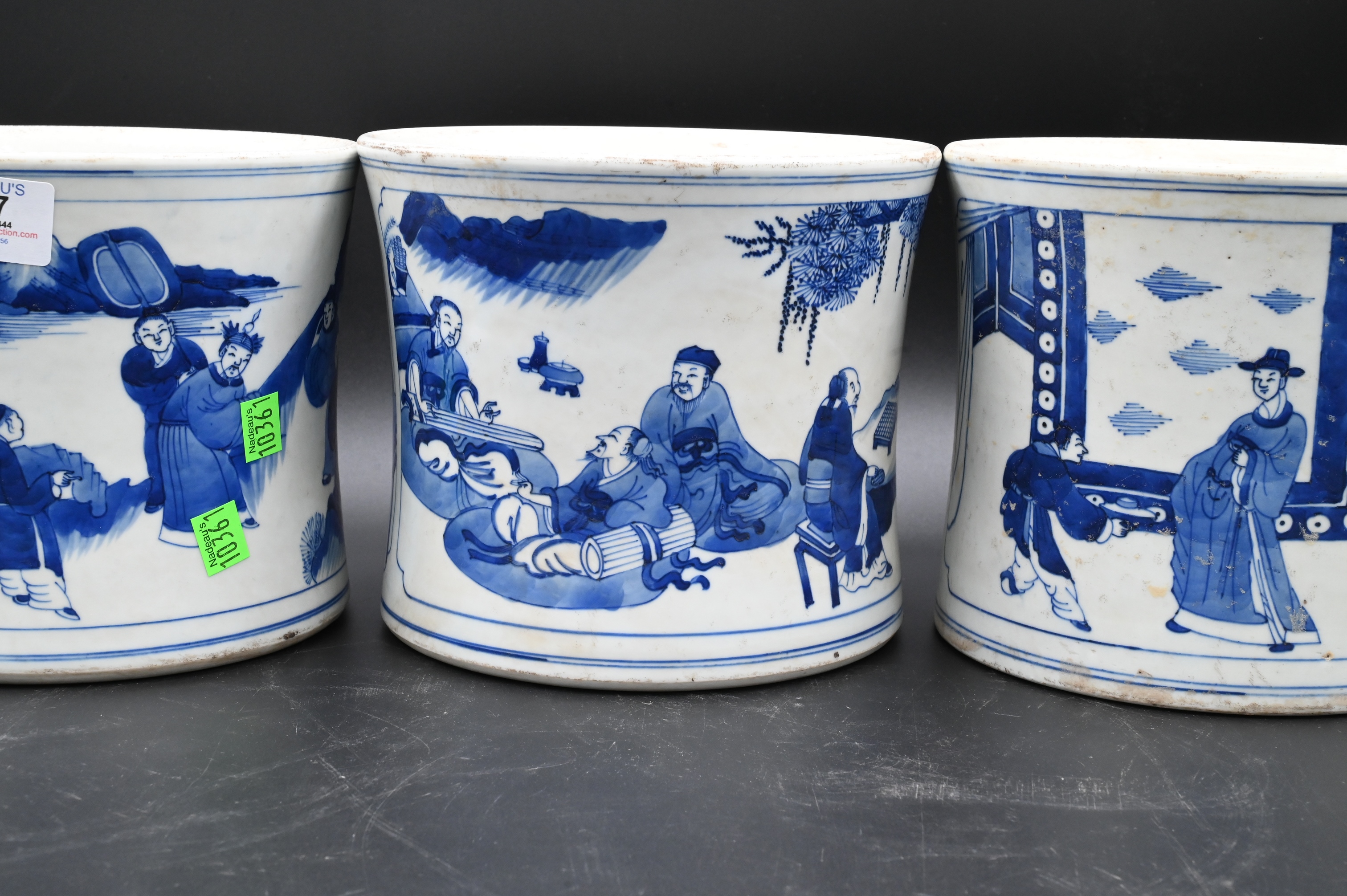 Set of Three Chinese Blue and White Porcelain Brush Pots having Painted Courtyard Scenes and Figures