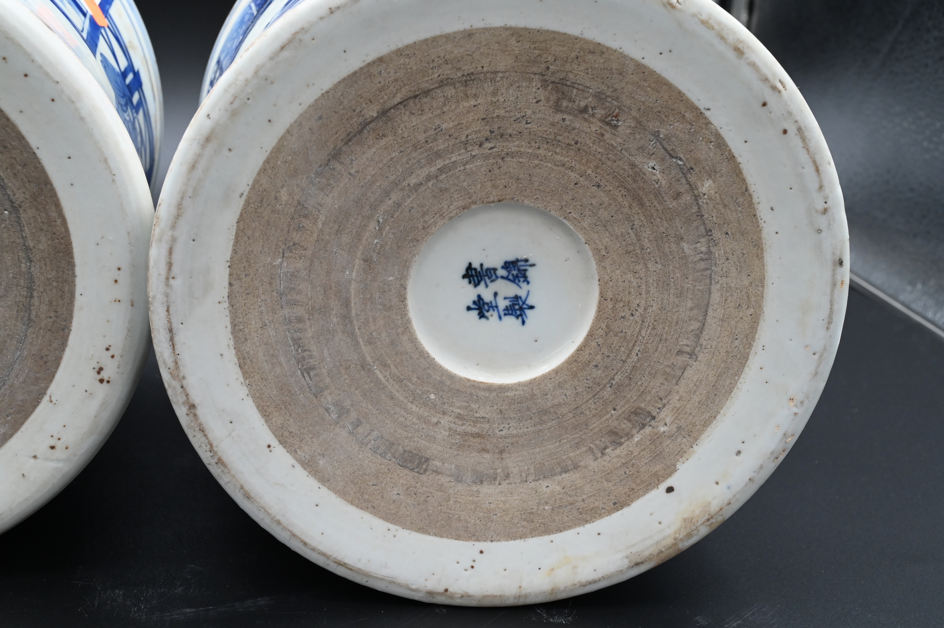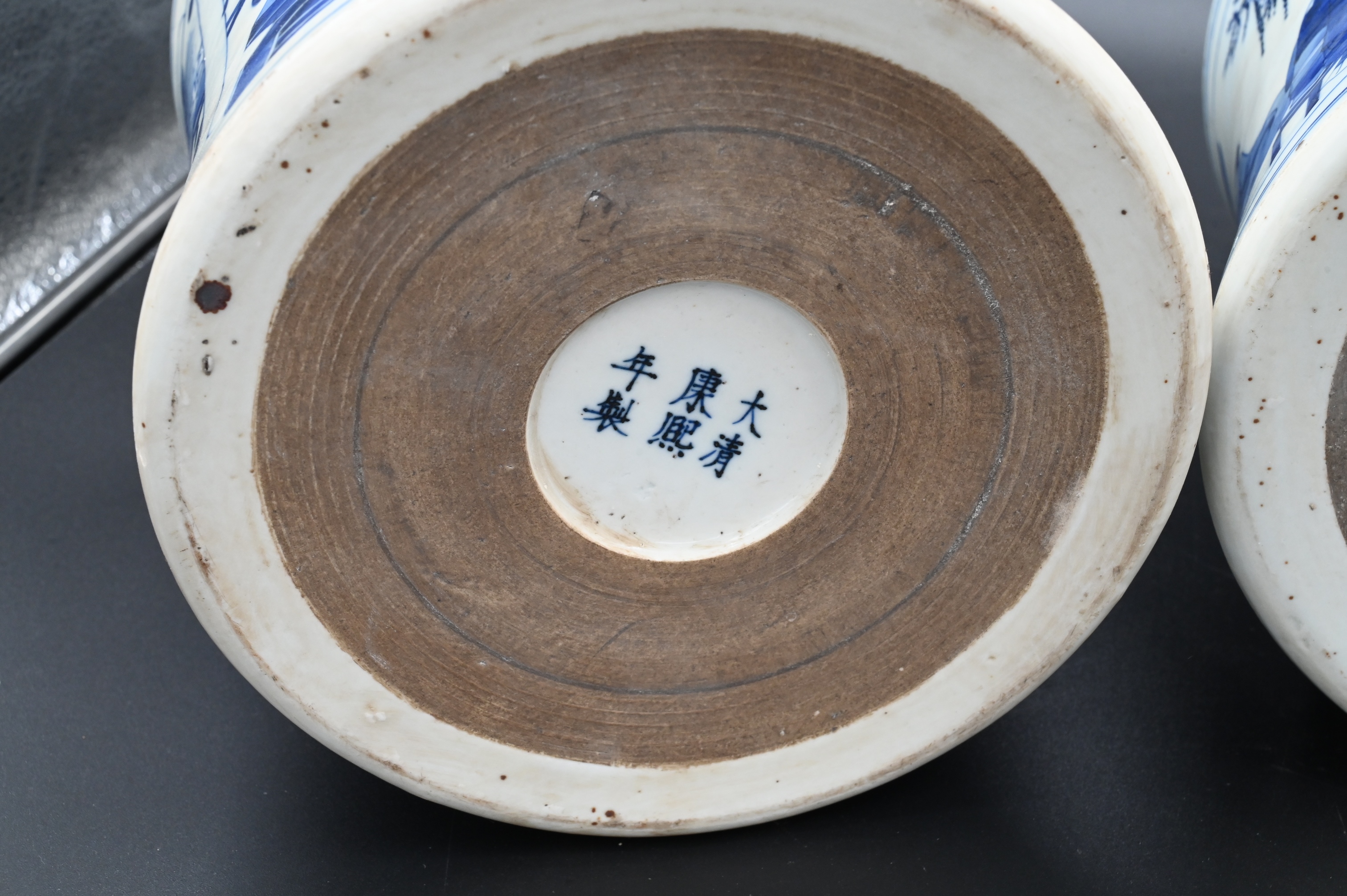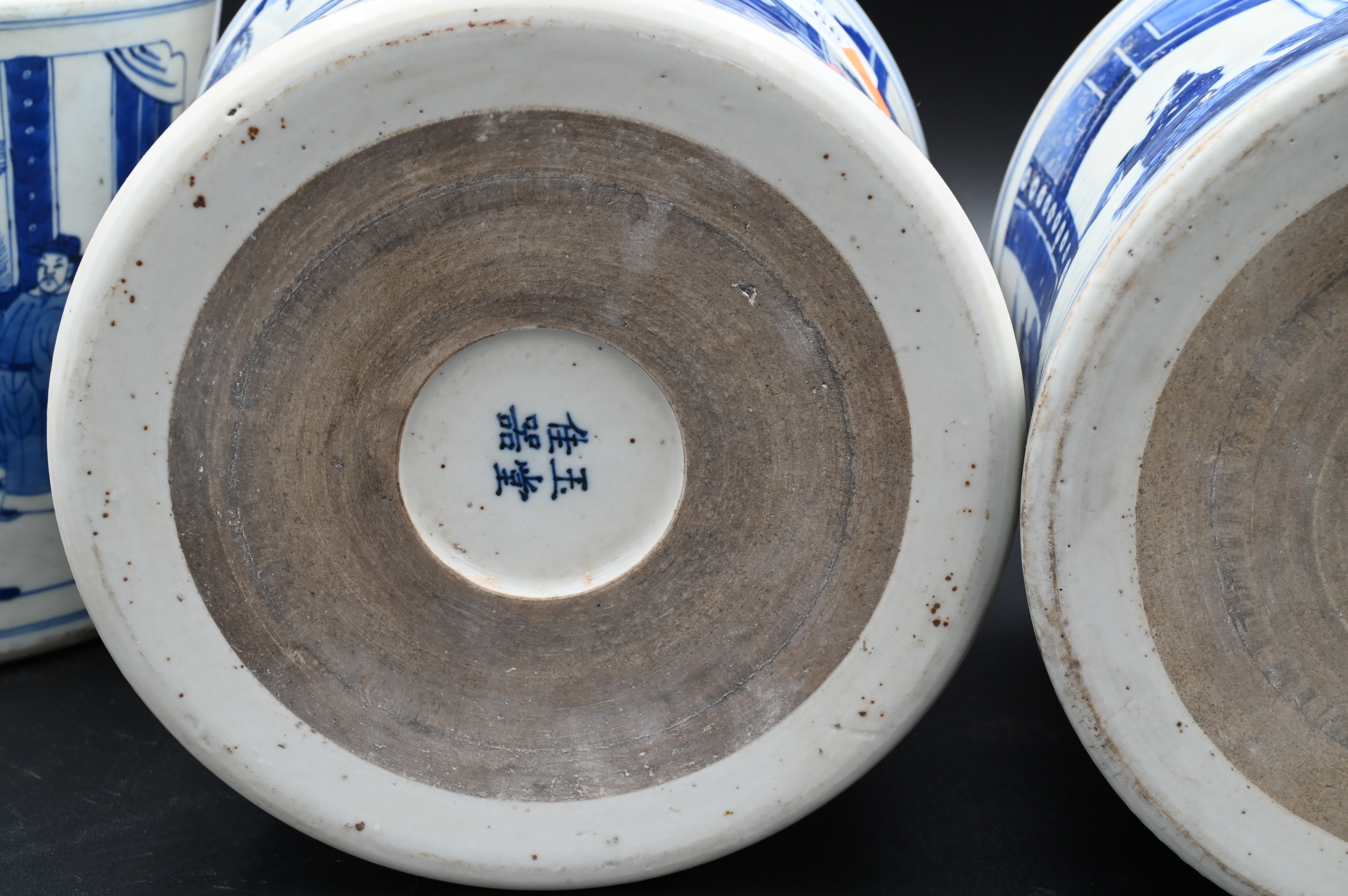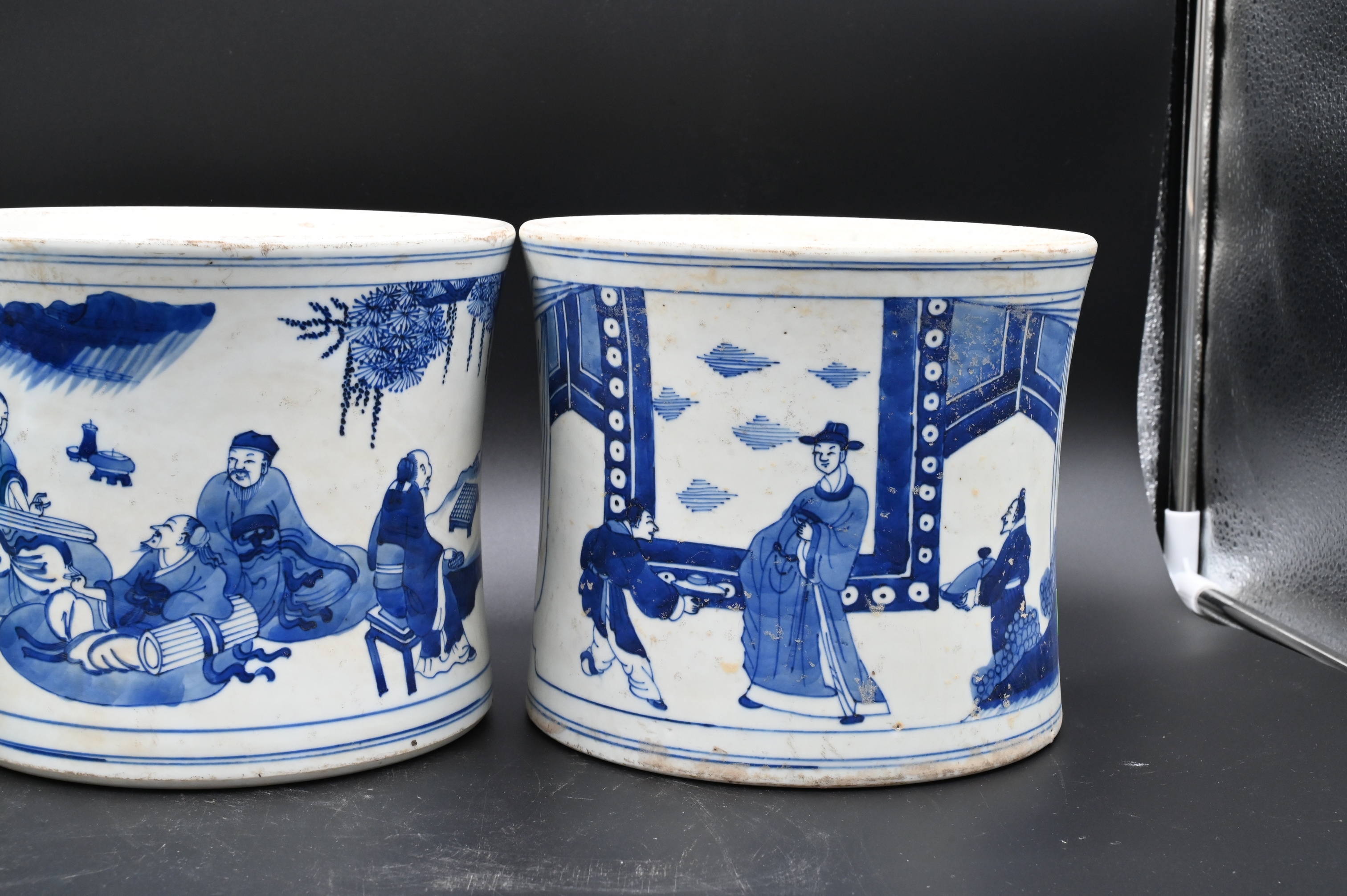 Set of Three Chinese Blue and White Porcelain Brush Pots having Painted Courtyard Scenes and Figures
