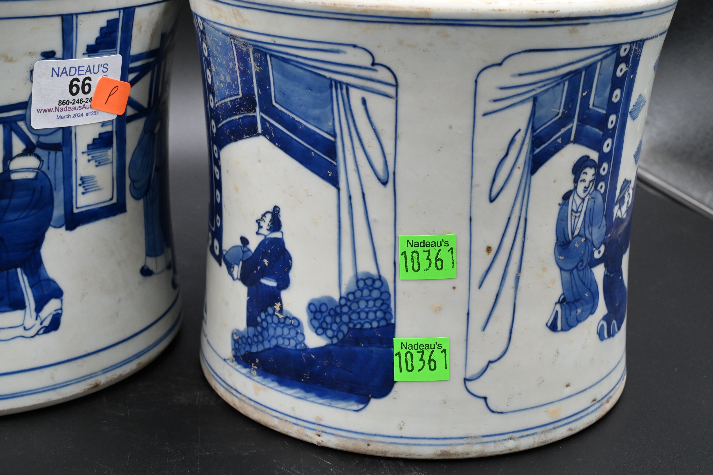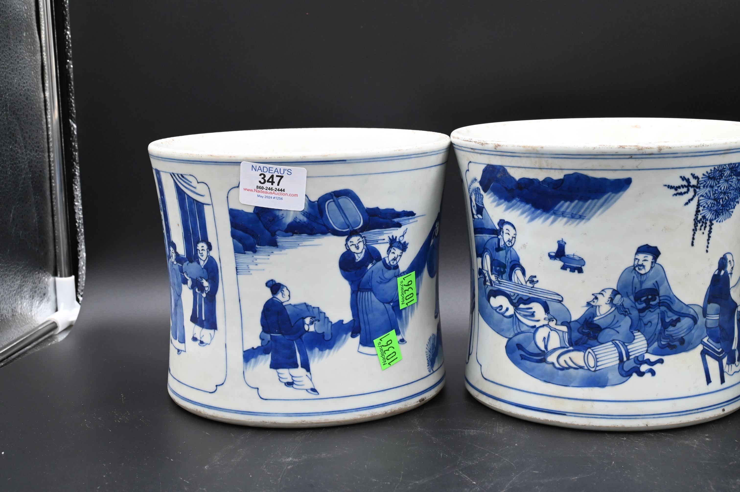 Lot 347: Set of Three Chinese Blue and White Porcelain Brush Pots having Painted Courtyard Scenes and Figures