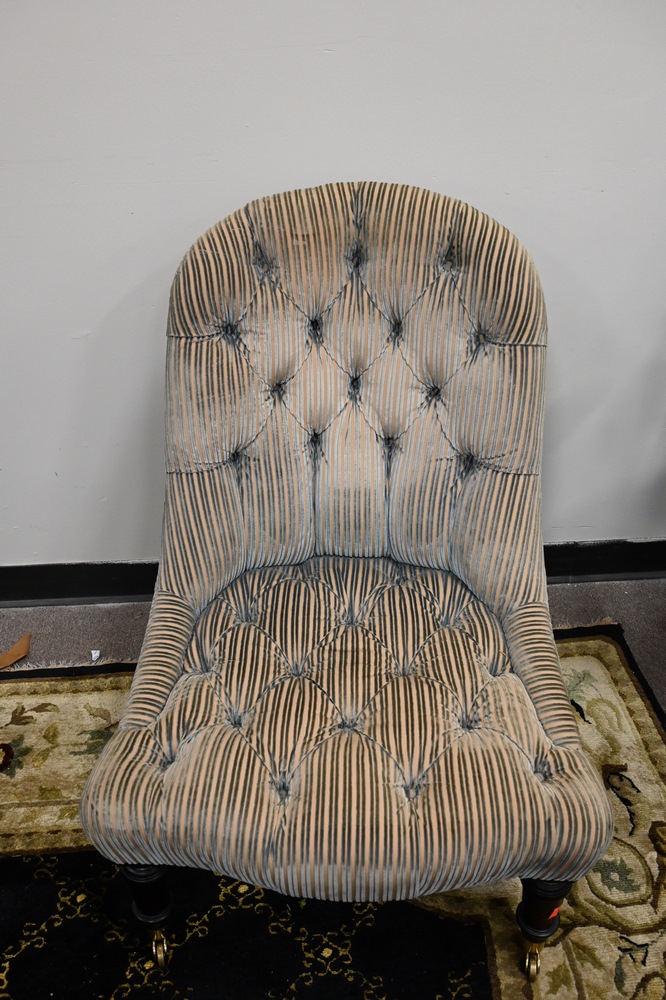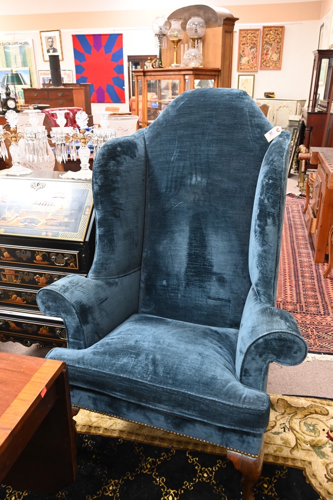 Lot 347: Three Chairs, to include a Chippendale style leather wing chair; a blue queen style wing chair; along with a Victorian slipper chair.