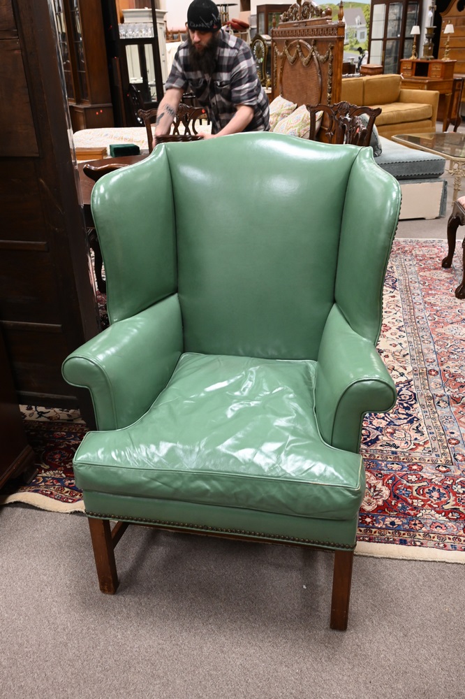 Three Chairs, to include a Chippendale style leather wing chair; a blue queen style wing chair; along with a Victorian slipper chair.