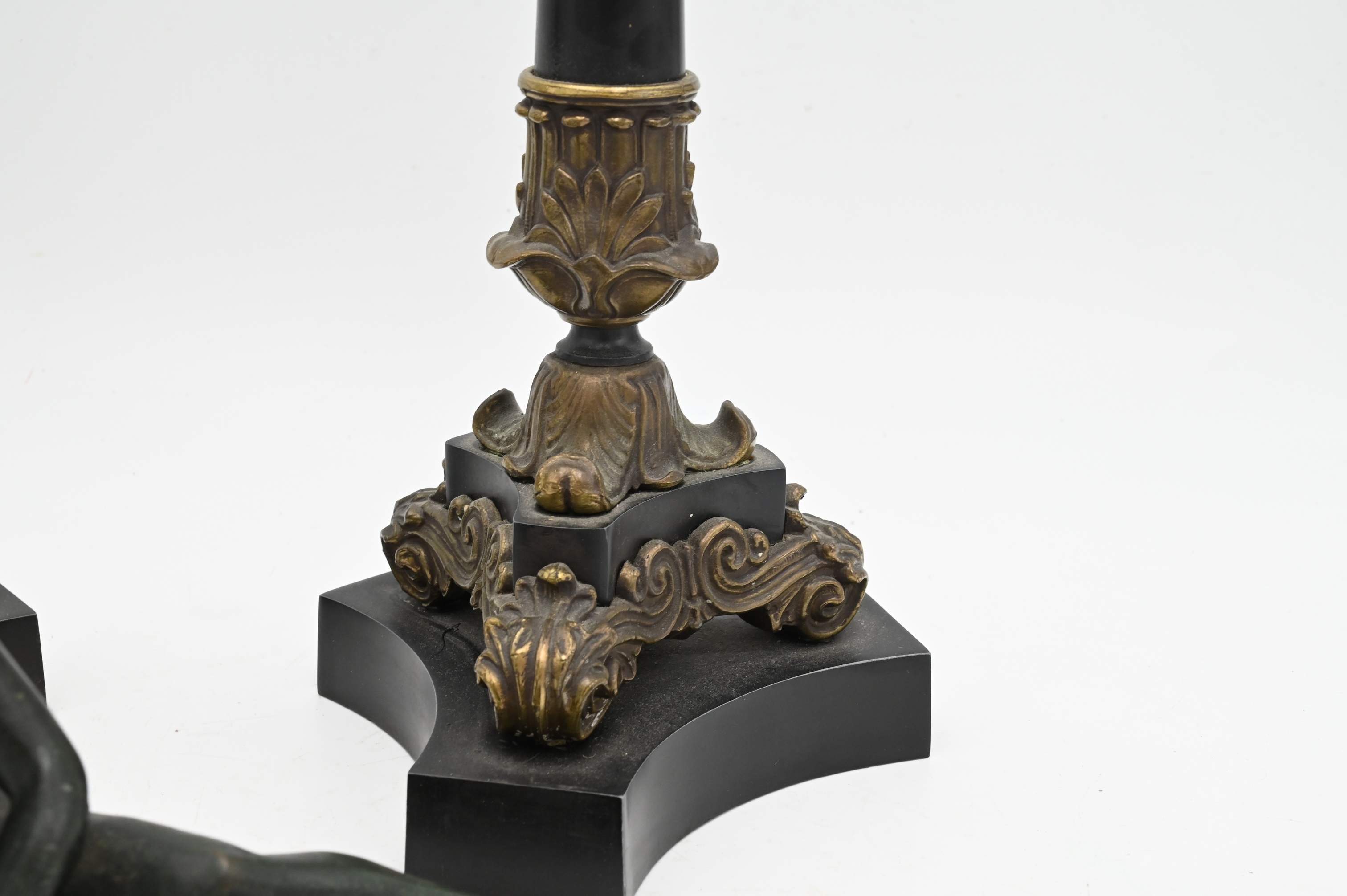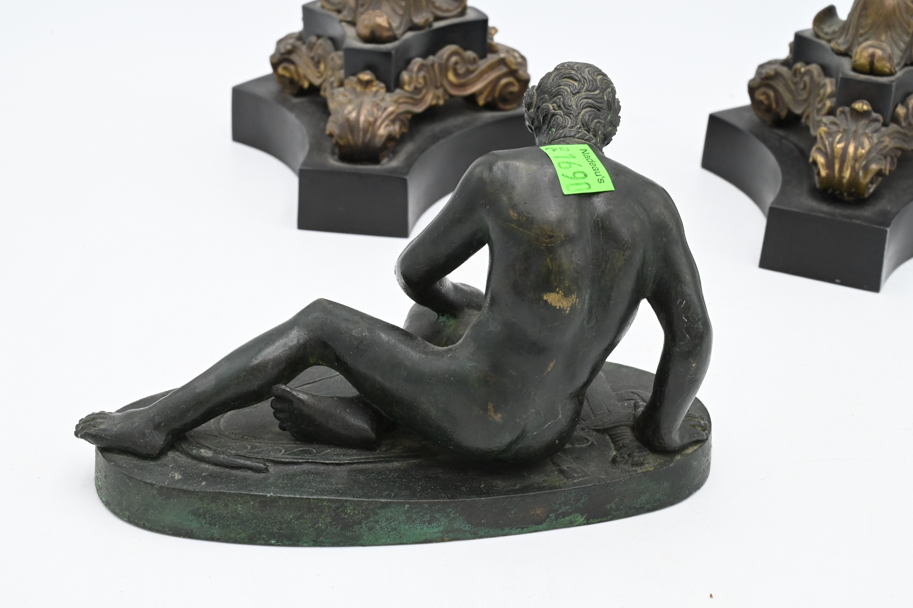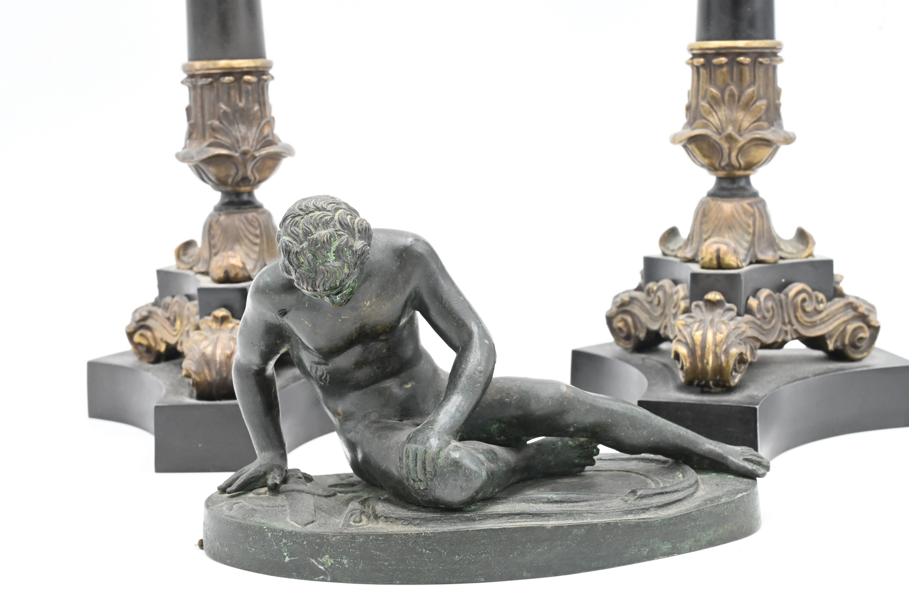 Three Piece Group, to include pair of two toned bronze French Empire candelabras (height 22 inches), along with a bronze figure of a reclining man,.