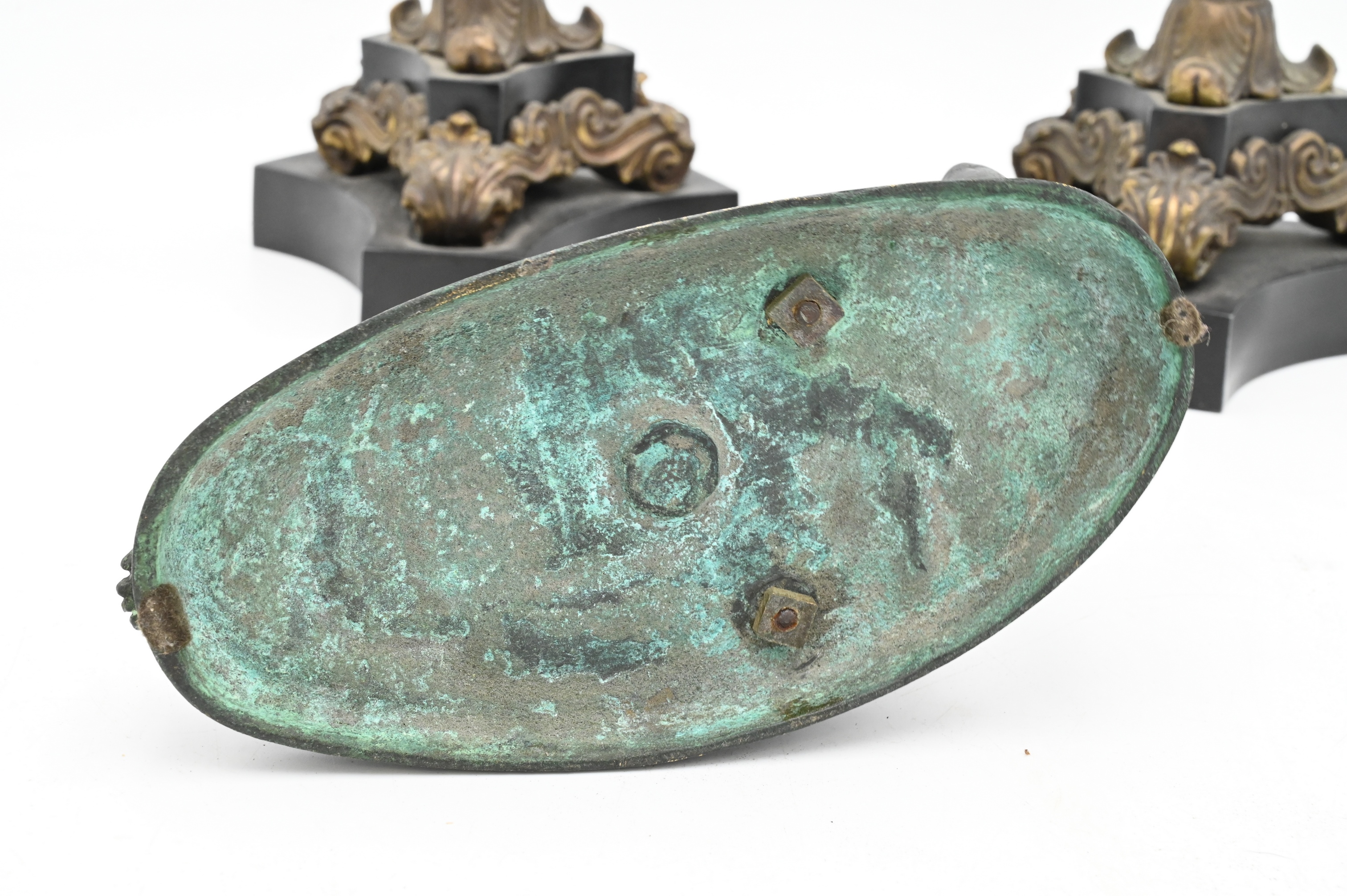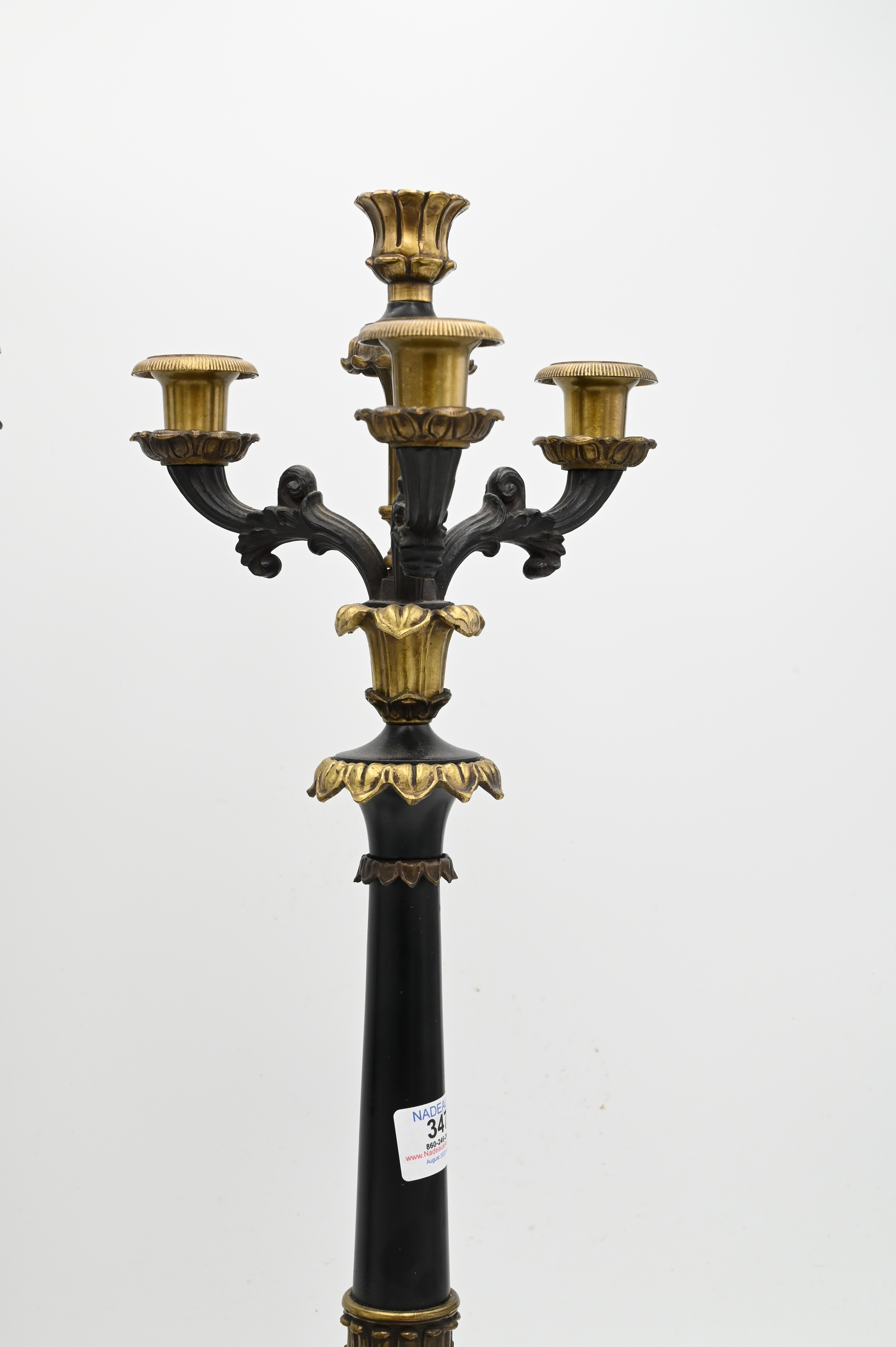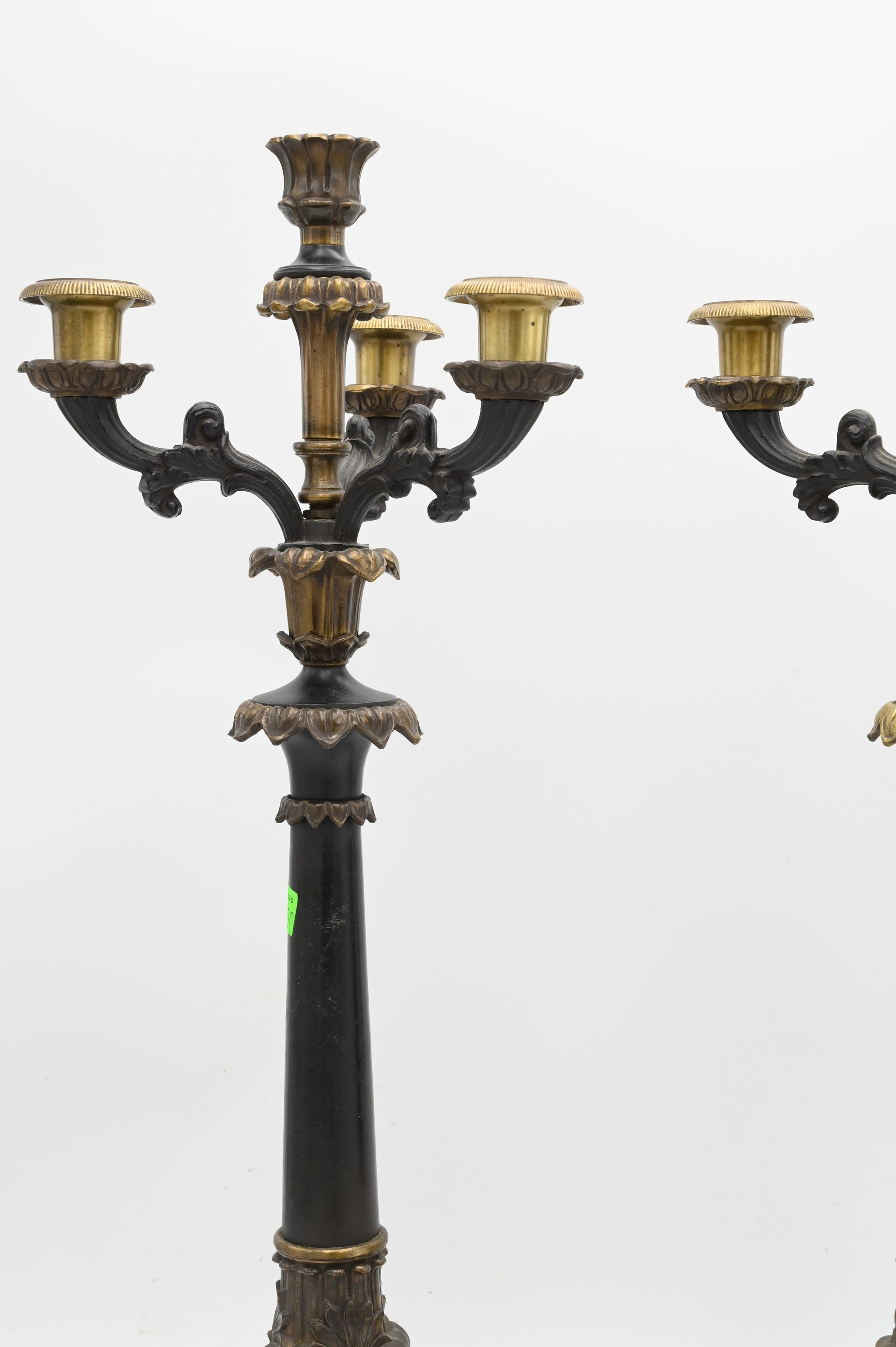 Three Piece Group, to include pair of two toned bronze French Empire candelabras (height 22 inches), along with a bronze figure of a reclining man,.