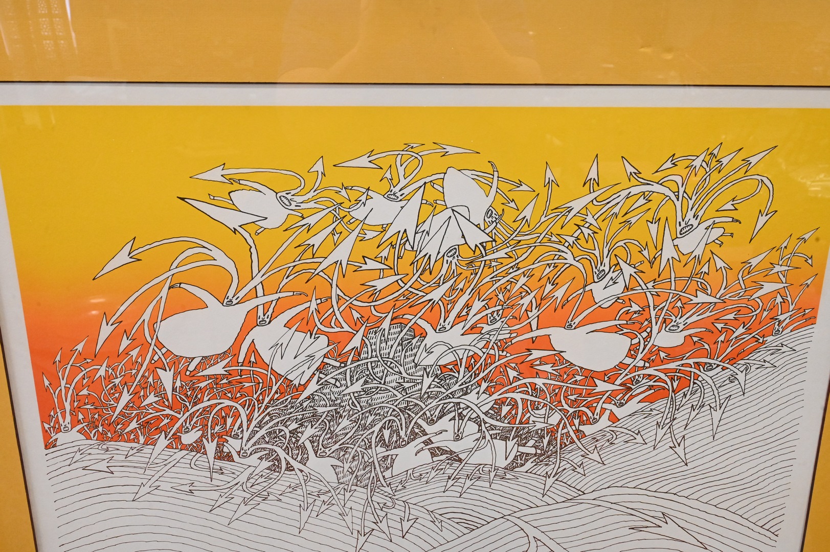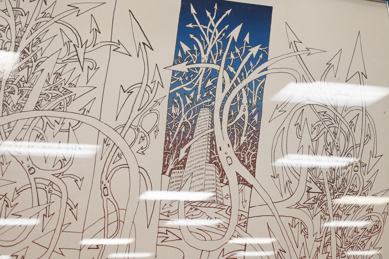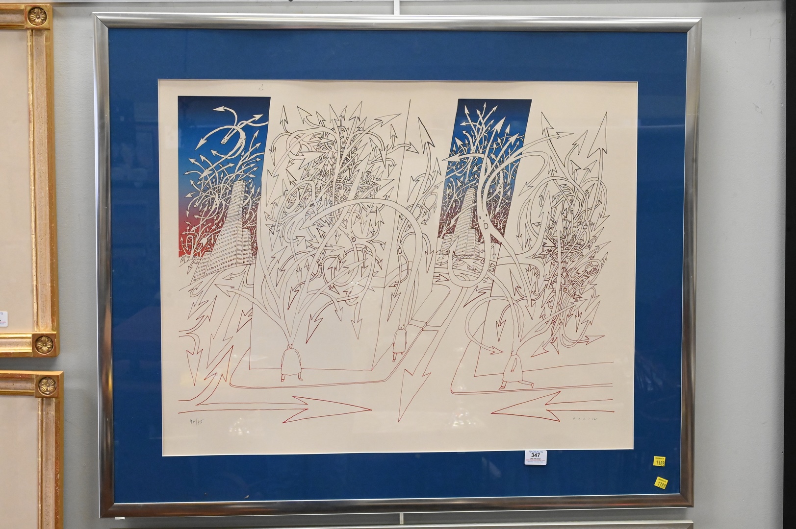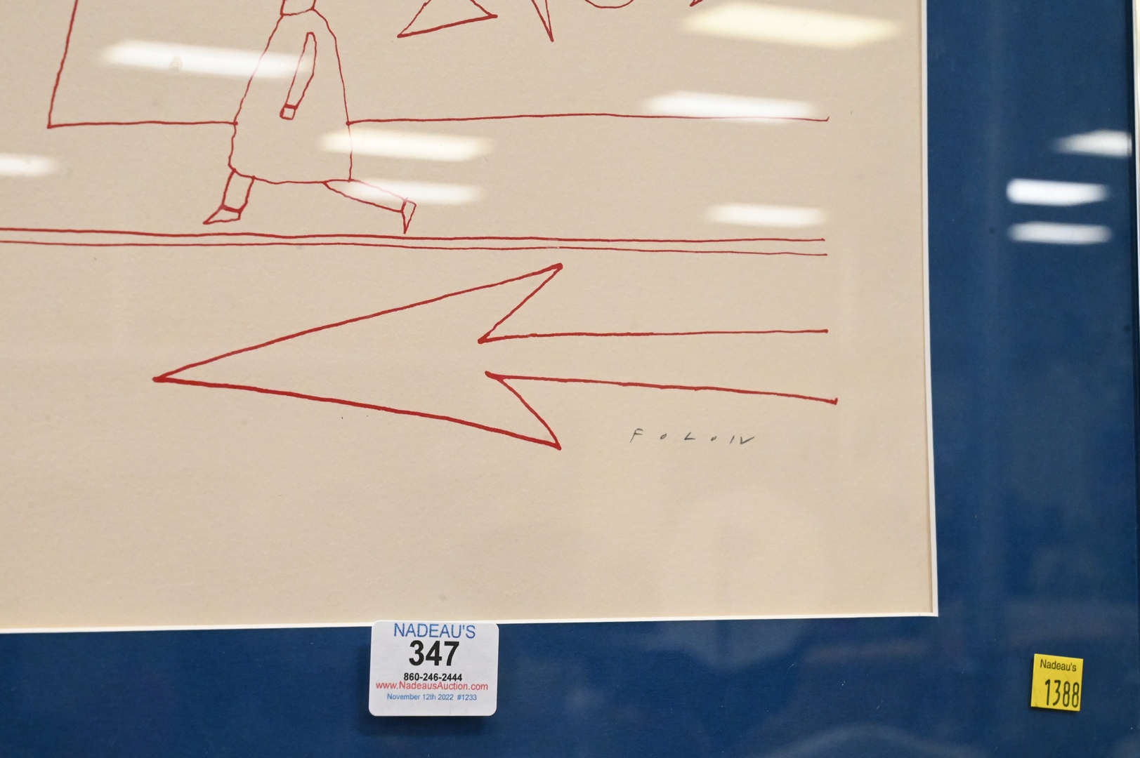 Two Jean Michel Folon (1934-2005) Colored Lithographs, “Arrowhead man”, pencil signed, numbered edition 42/75, 43/75, largest 24 1/2″ x 31 1/4″.
