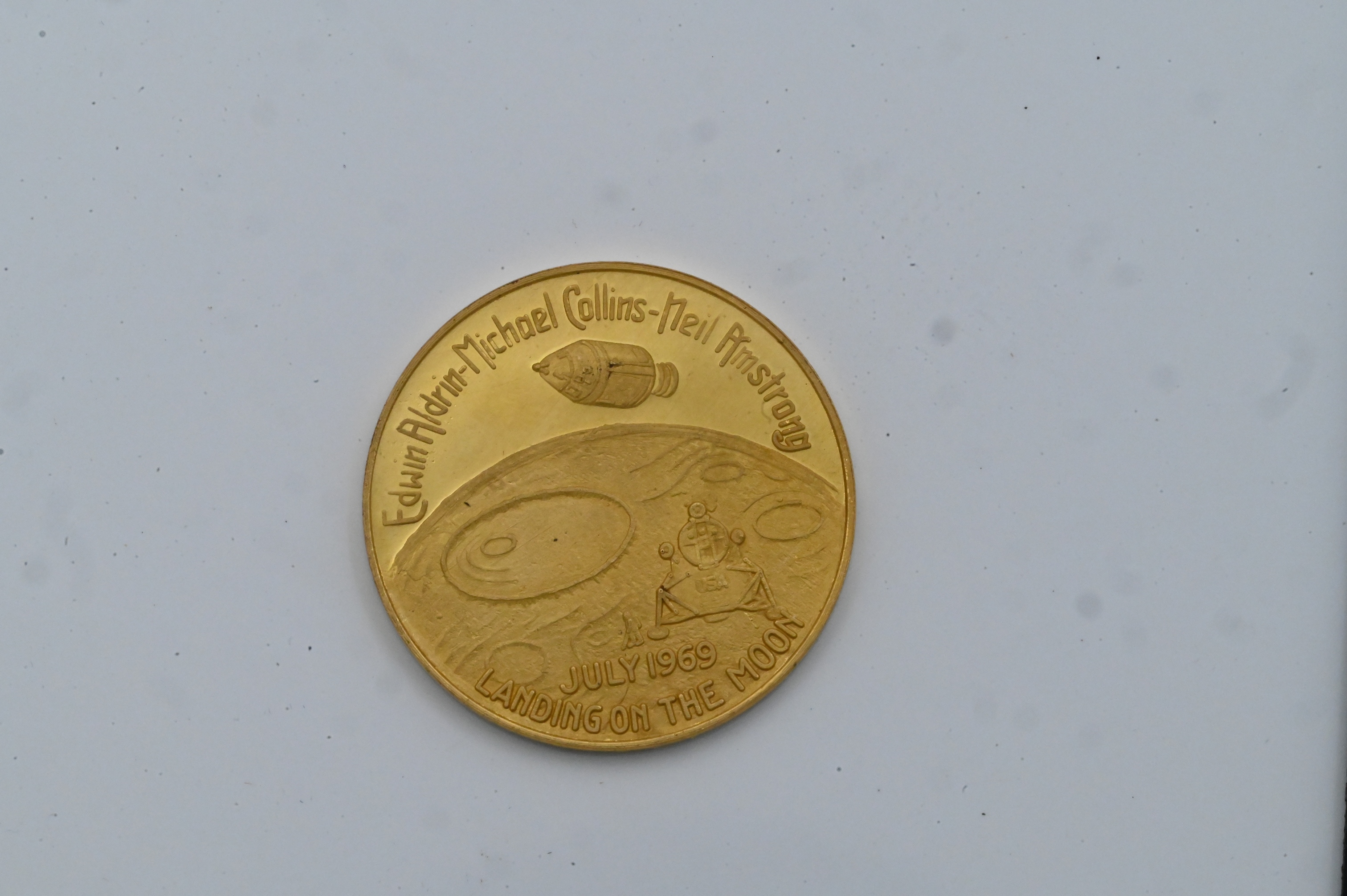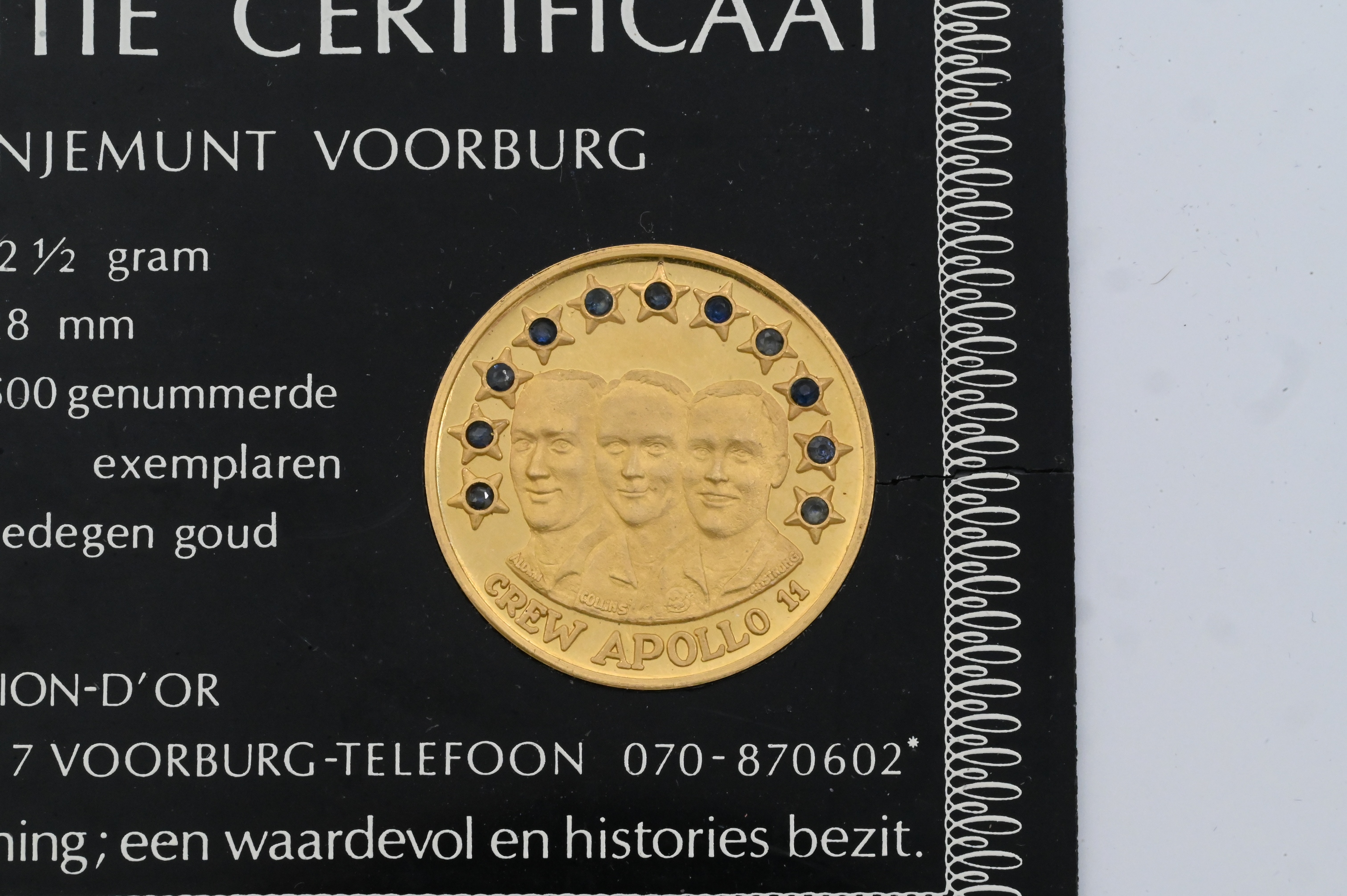 Crew Apollo 11 Gold Medallion, set with 11 sapphires, 12 1/2 grams, 28 millimeters, 21.6 karats.