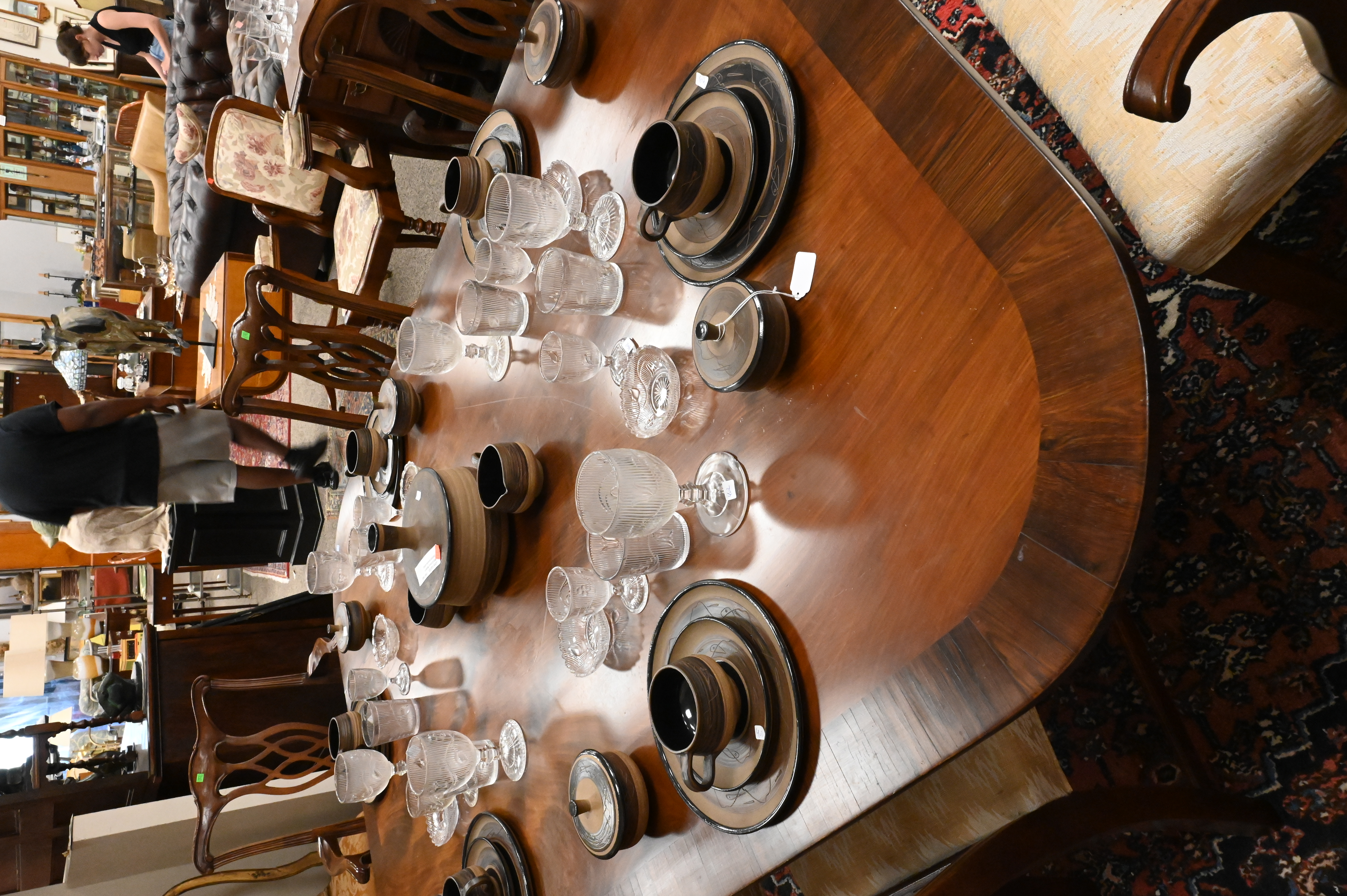 having banded inlaid top on pedestal base with brass paw feet, early 19th century