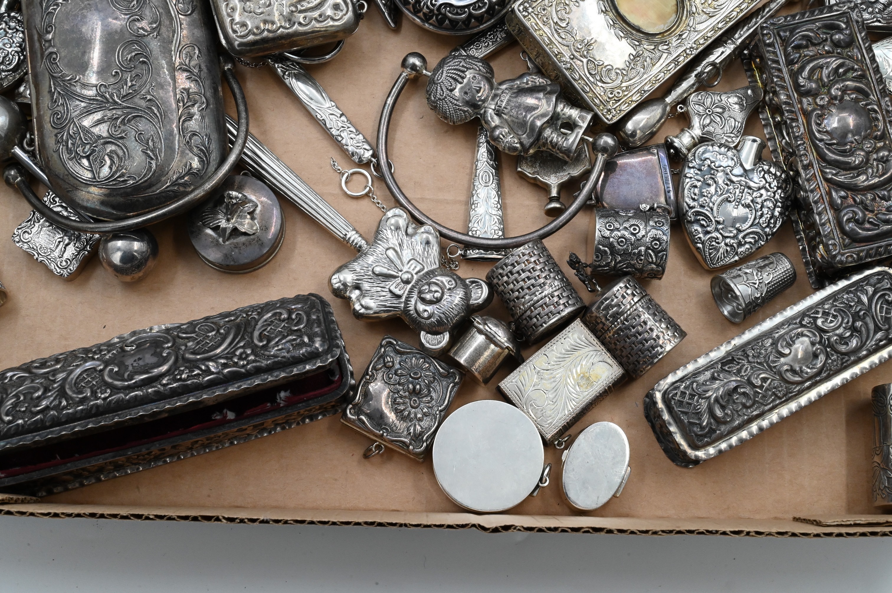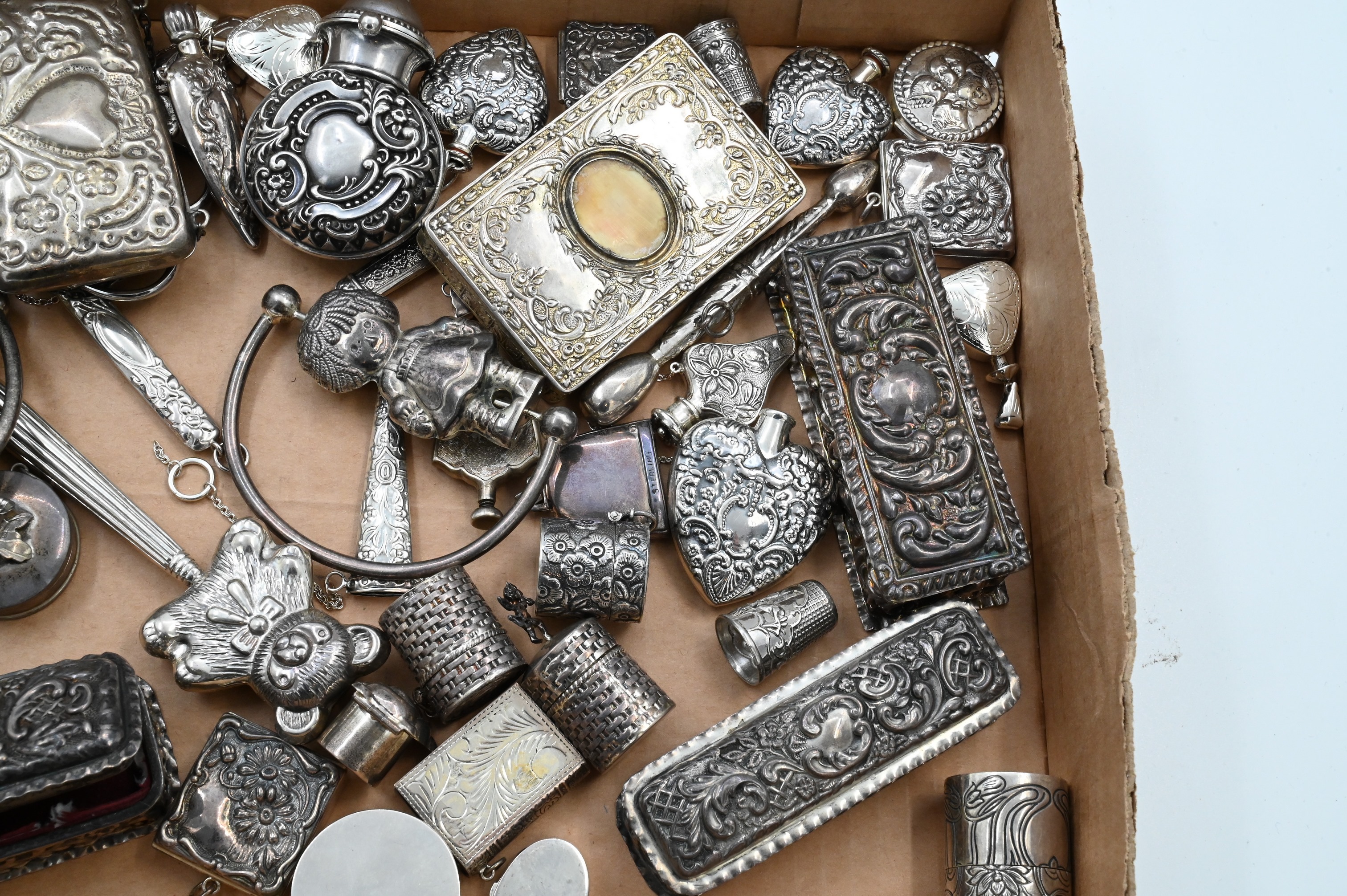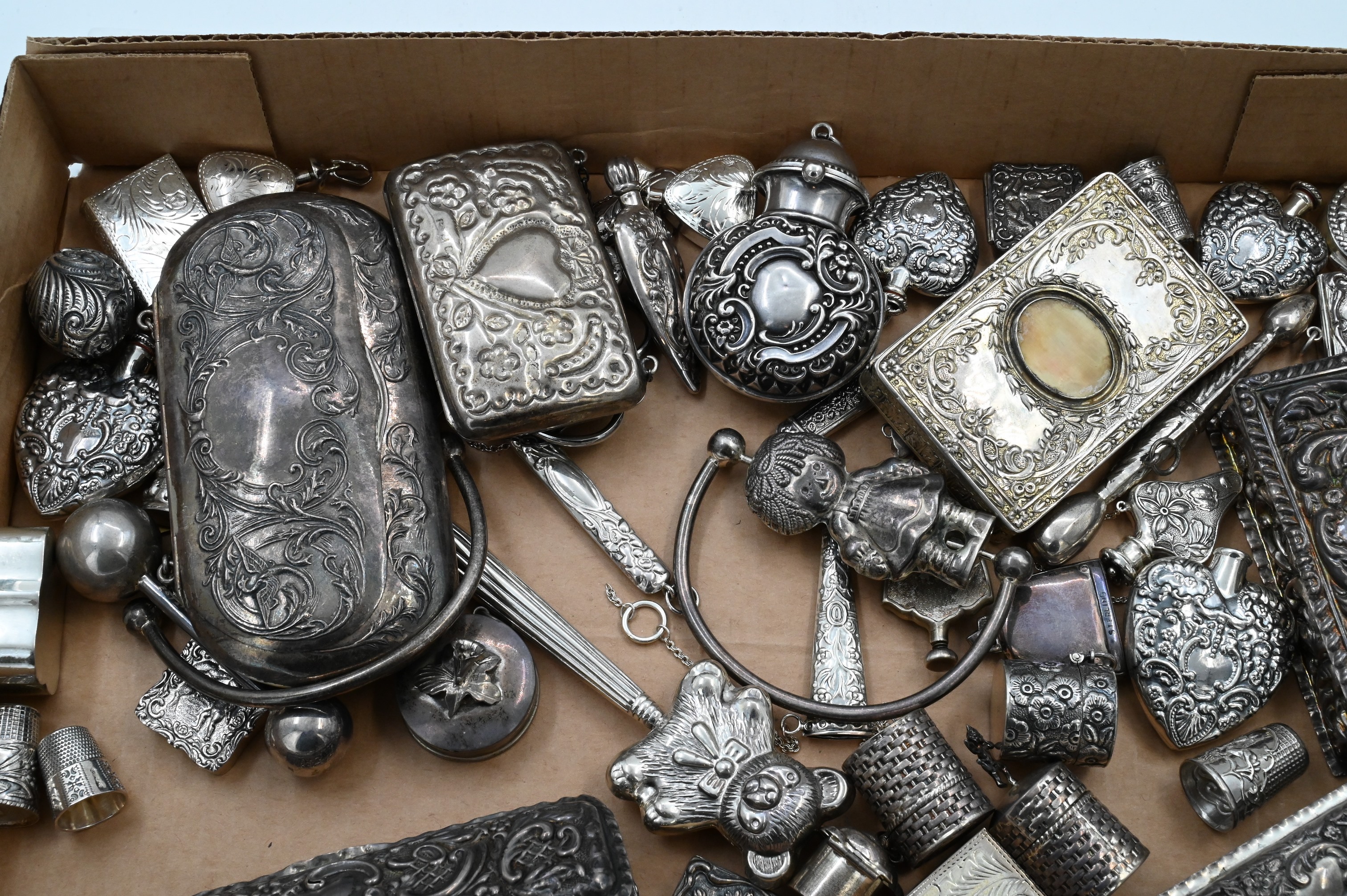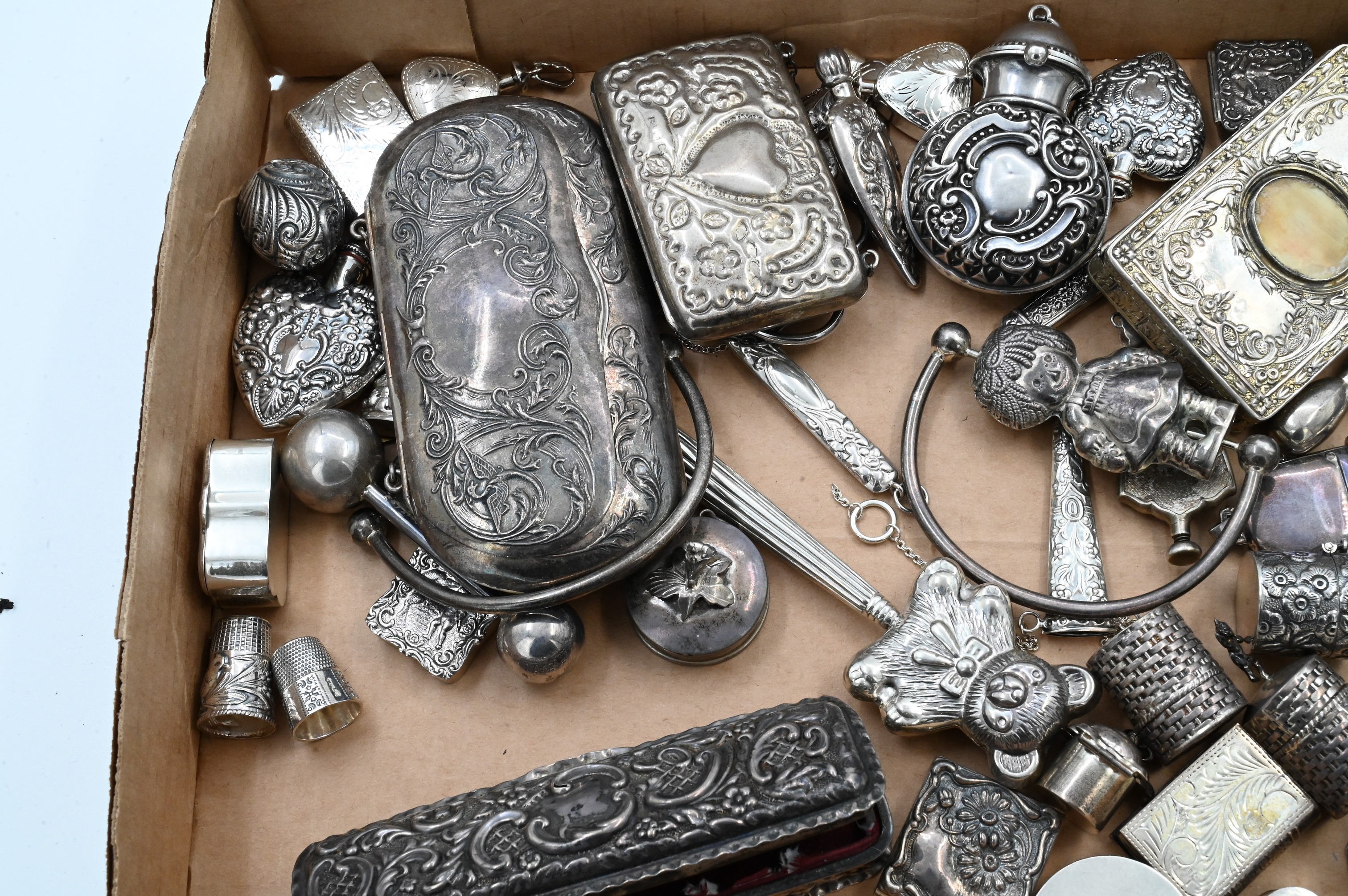 to include perfume bottles, sewing tools, 17 trinket / pill boxes, two sterling purses, one box with cameo missing, and baby rattles