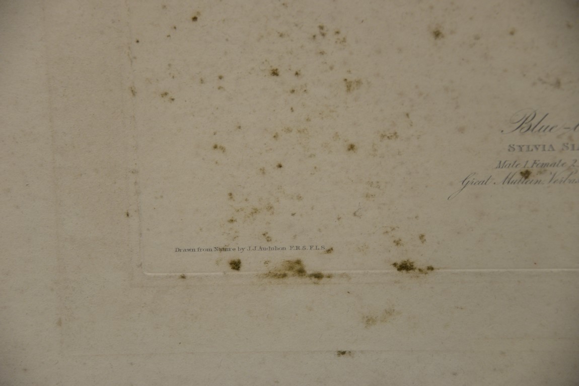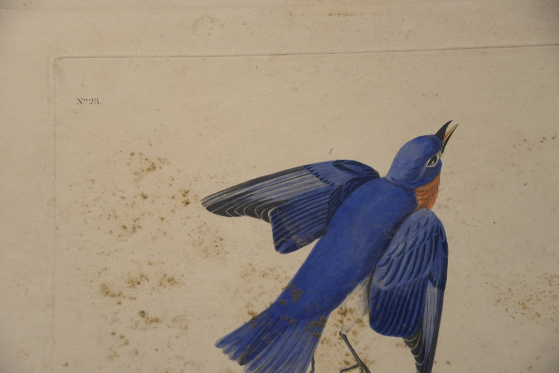 JOHN JAMES AUDUBON 1785-1851 Blue-Bird plate CXIII No. 23 hand colored engraving Drawn from Nature by J. J. Audubon FRS,ELS, Engraved, Printed, and Coloured by R. Havell, London 1831, Blue-Bird SYLVIA SIALIS having J. Whatman watermark laid down, foxing and mounted 28 3/4 x 19 7/8 plate size 19 3/4 x 12 1/2