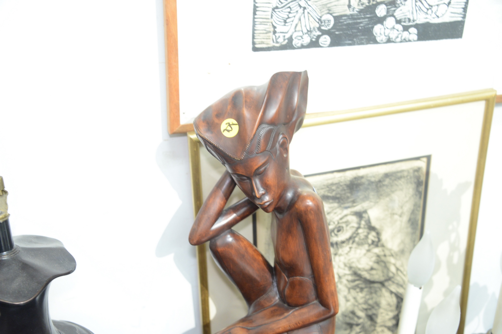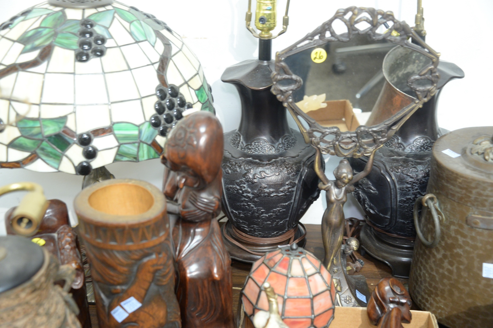 Large tray lot to include; Bali Carved Wood Figure, hand hammered copper pot, made in Italy; three Oriental lamps; carved figures; small boudoir lamp; etc. Provenance: The Estate of Alina Roisen, Park Avenue, New York.