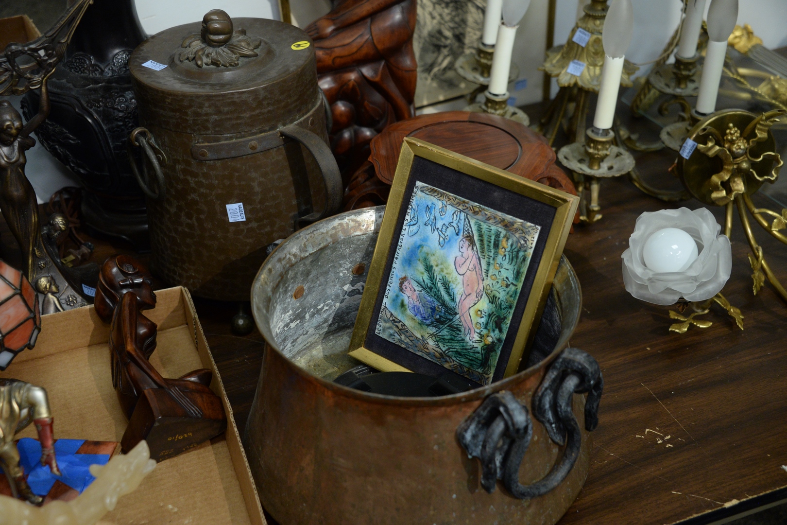 Lot 348: Large tray lot to include; Bali Carved Wood Figure, hand hammered copper pot, made in Italy; three Oriental lamps; carved figures; small boudoir lamp; etc. Provenance: The Estate of Alina Roisen, Park Avenue, New York.