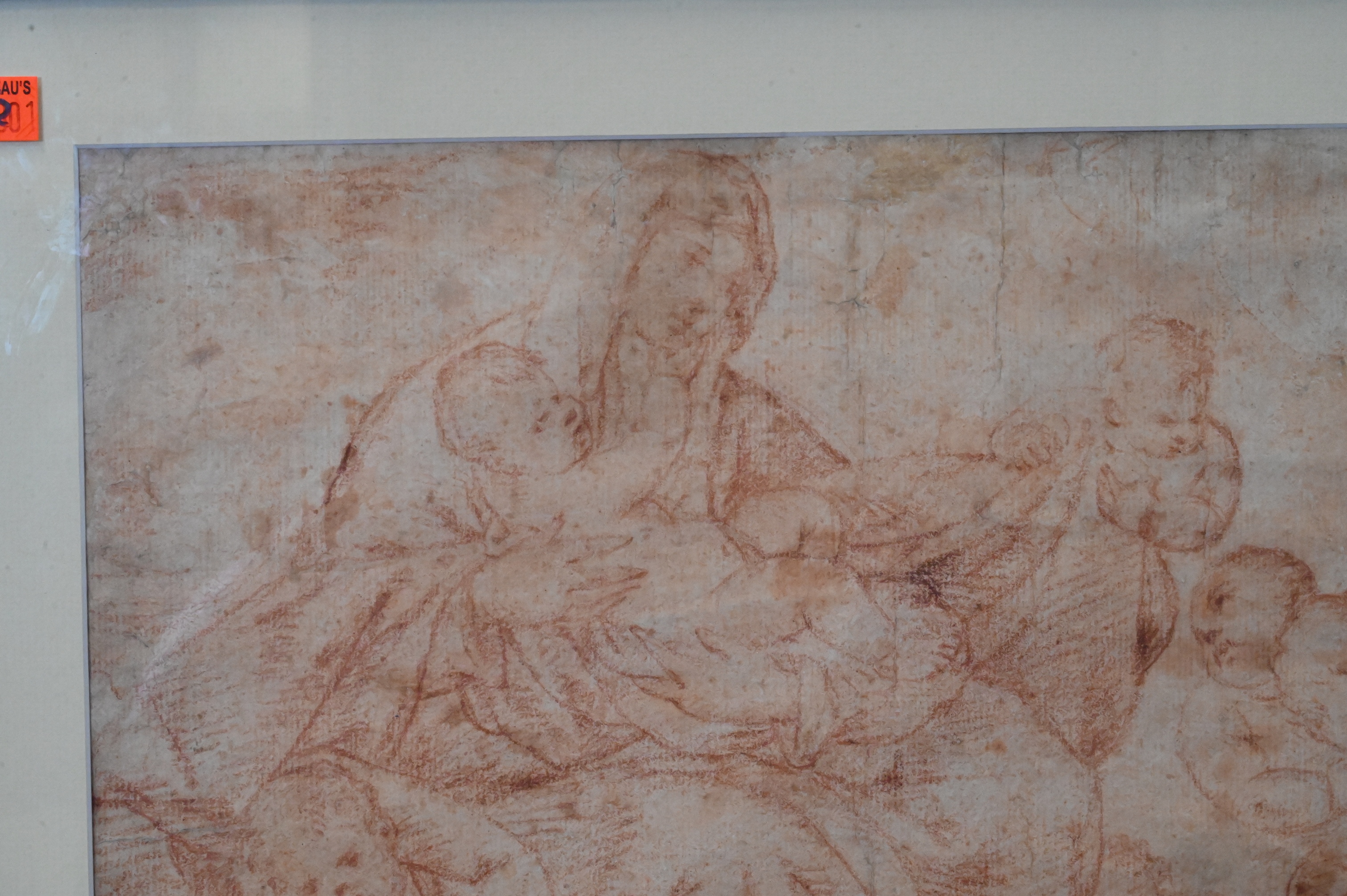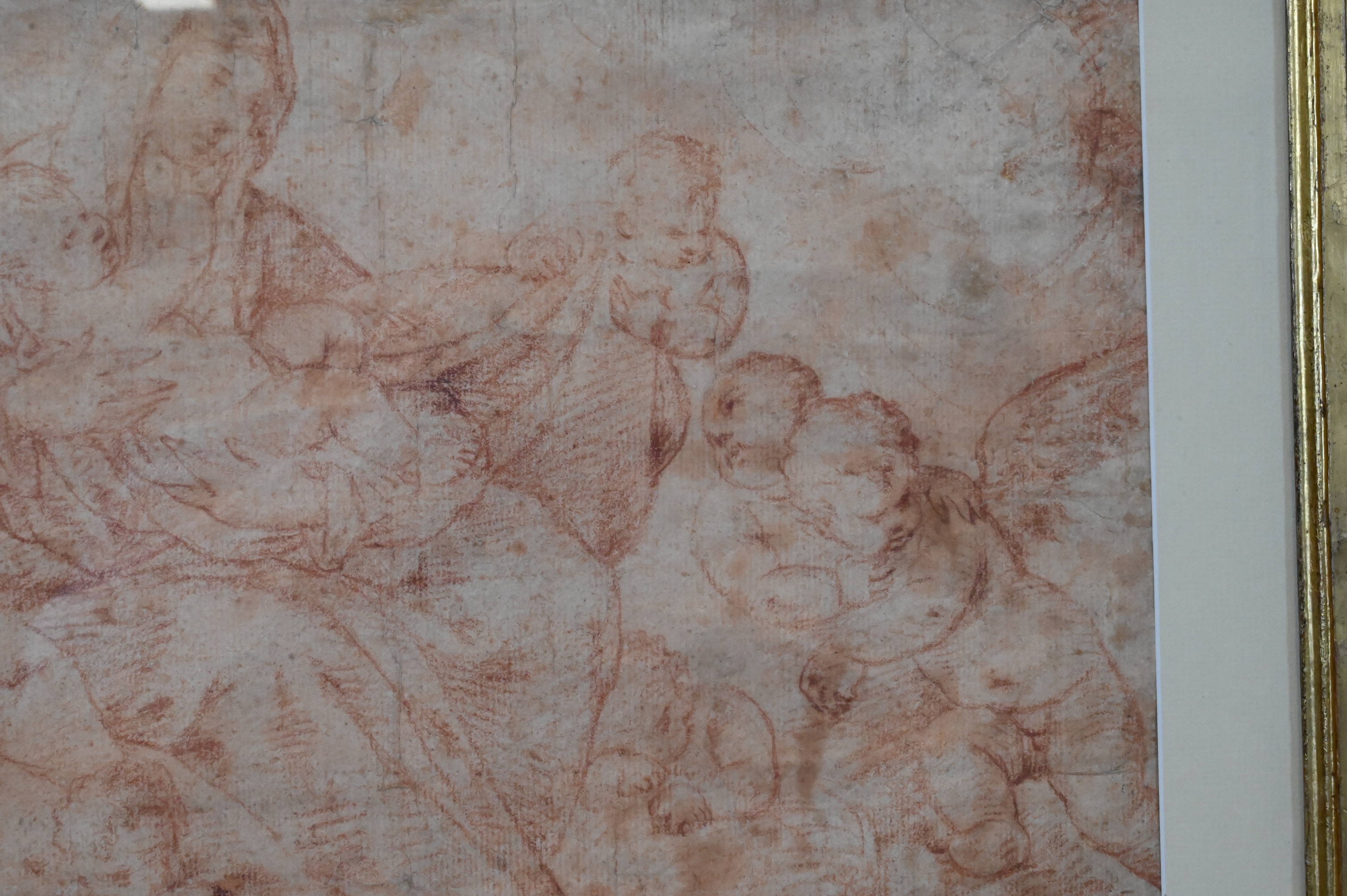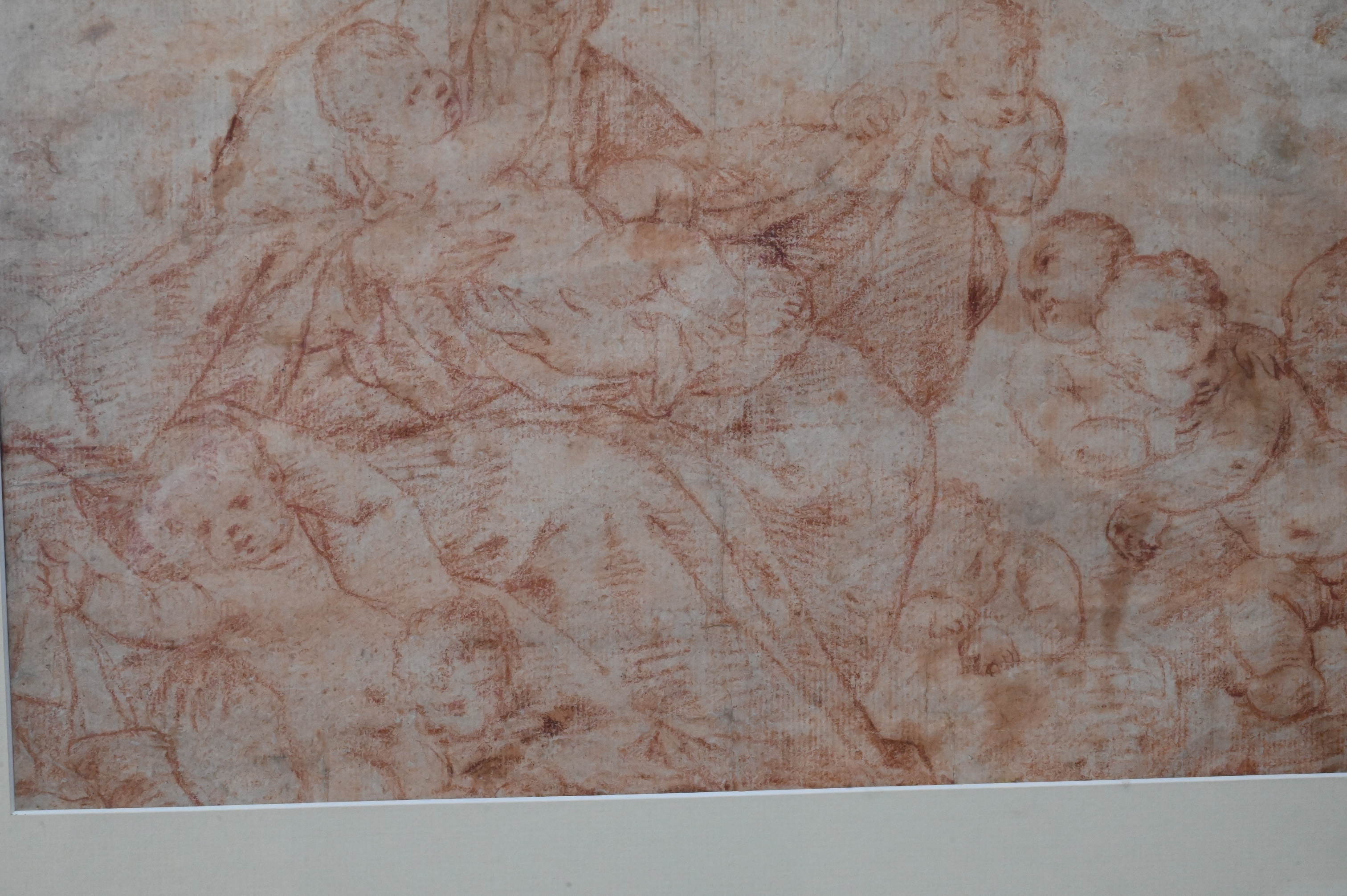 depicting the Virgin Mary tenderly embracing the Christ Child, surrounded by adoring cherubs; characteristic of Giordano’s confident draftsmanship and fluid line, the composition combines graceful motion and devotional intimacy, demonstrating his masterful handling of red chalk in preparatory studies