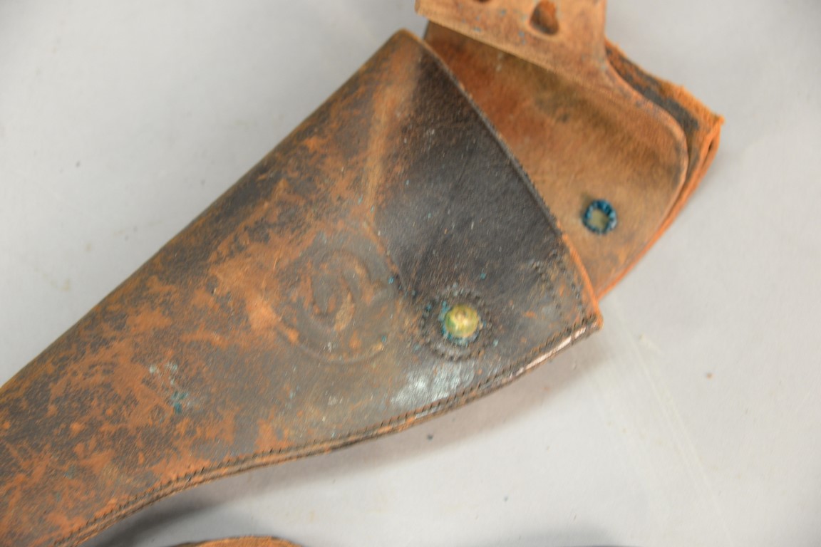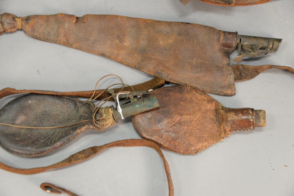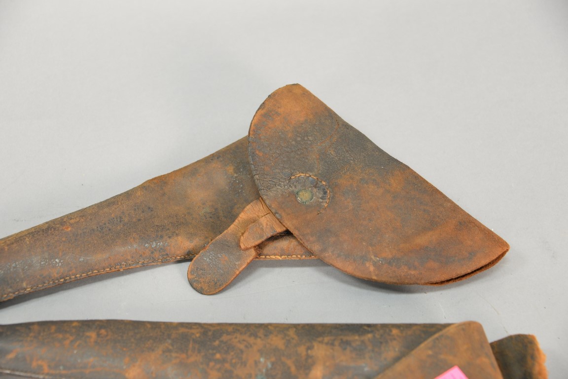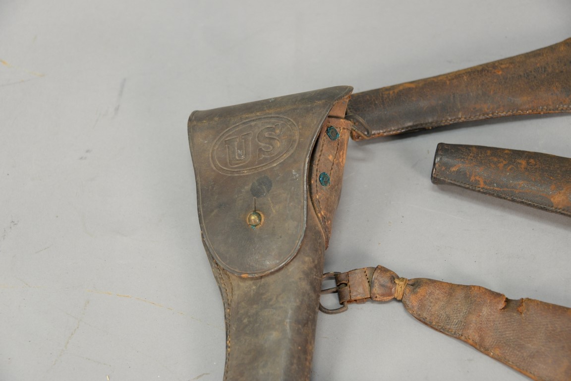 Lot 348: Military seven piece lot including American bayonet marked U.S., three holsters two marked U.S. and three leather powder horns.