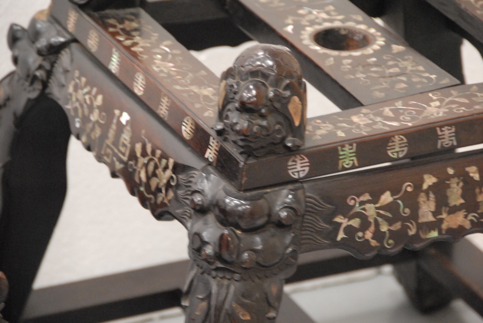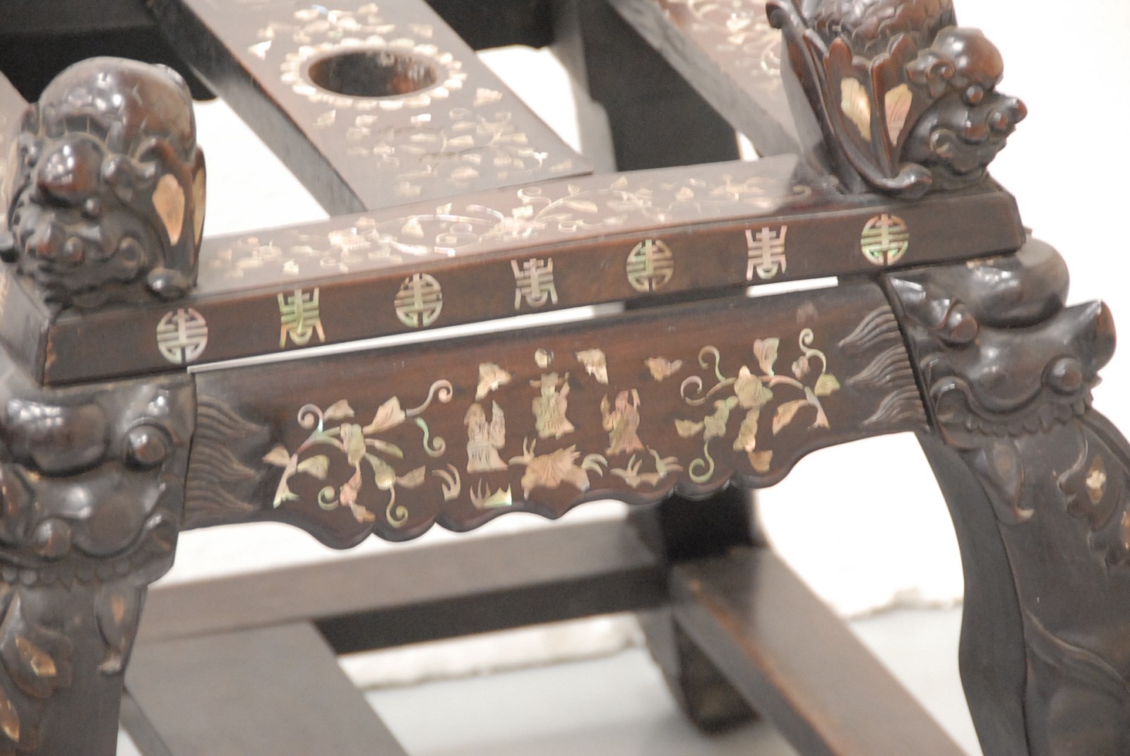 Pair of large wooden pool/flag stands with mother of pearl inlay, 20th century.