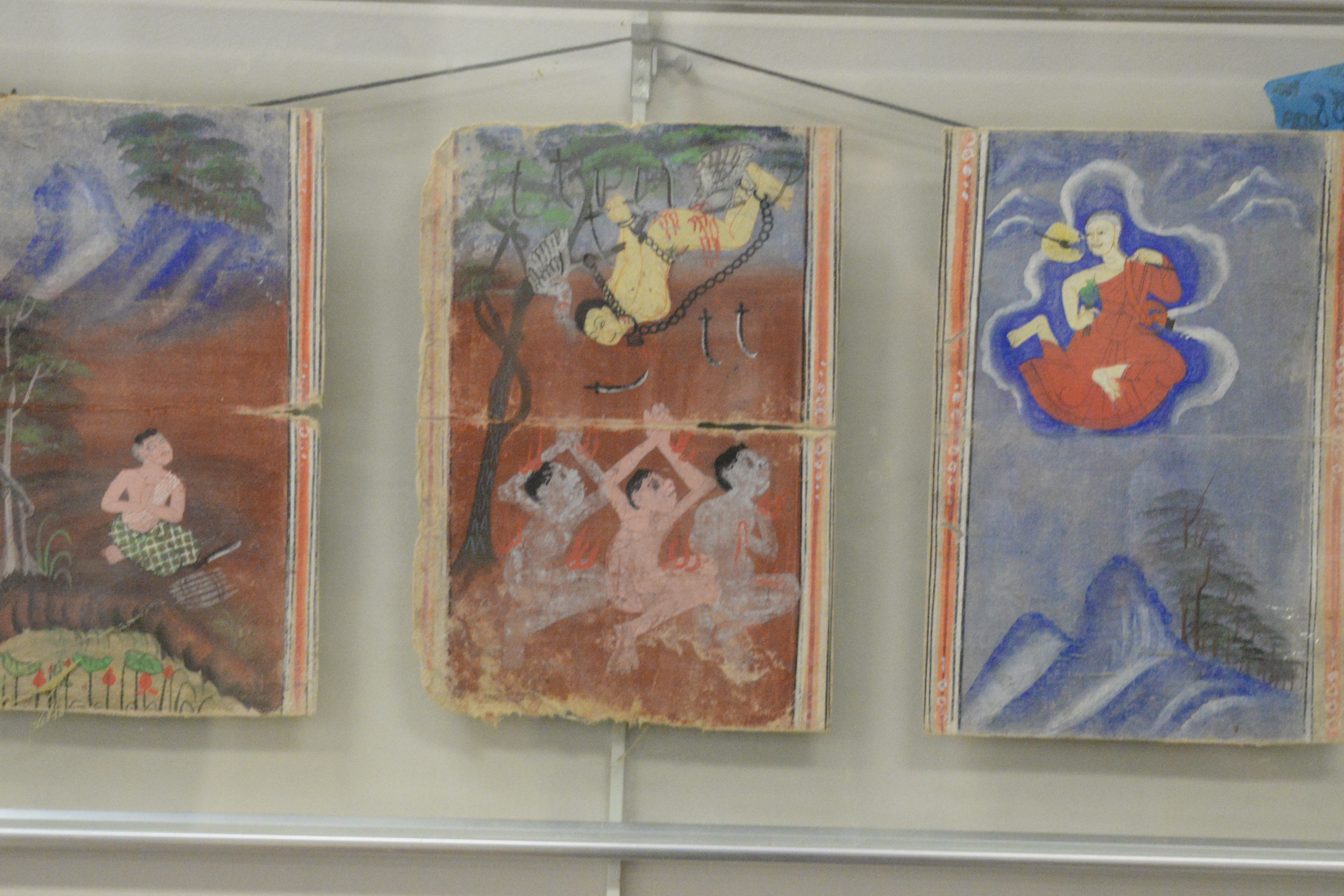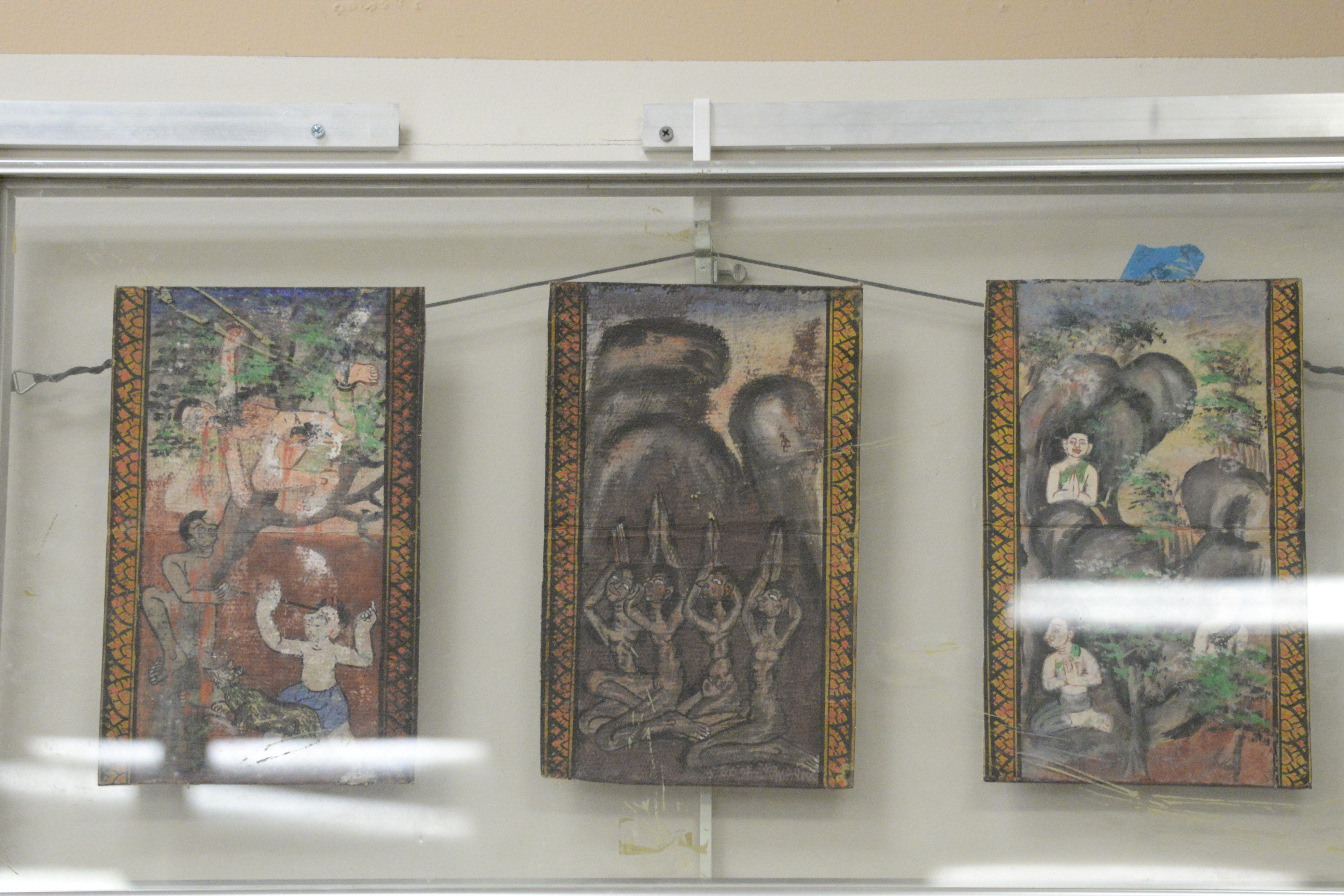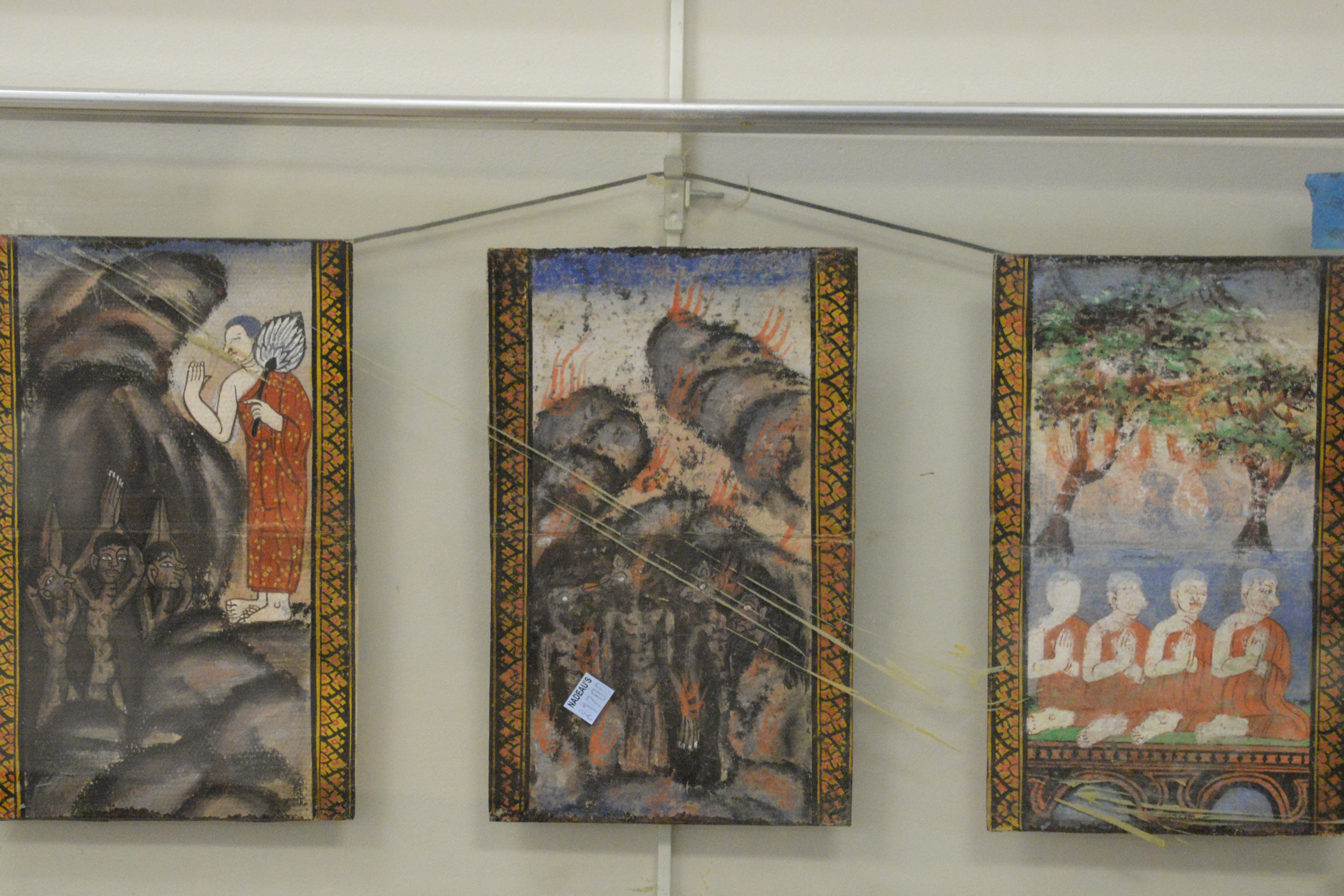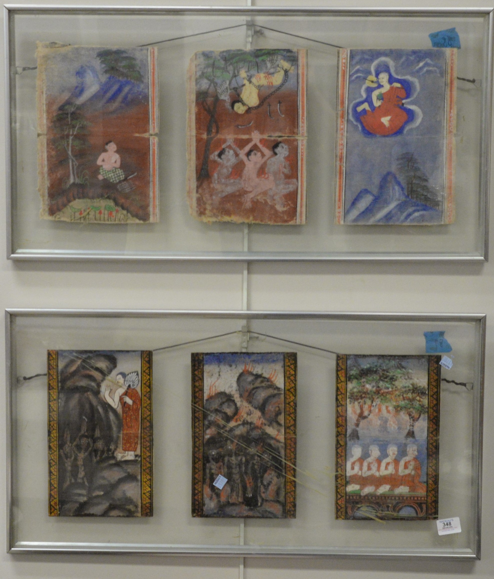 Paintings, double sided set between glass, 16″ x 31″ frame