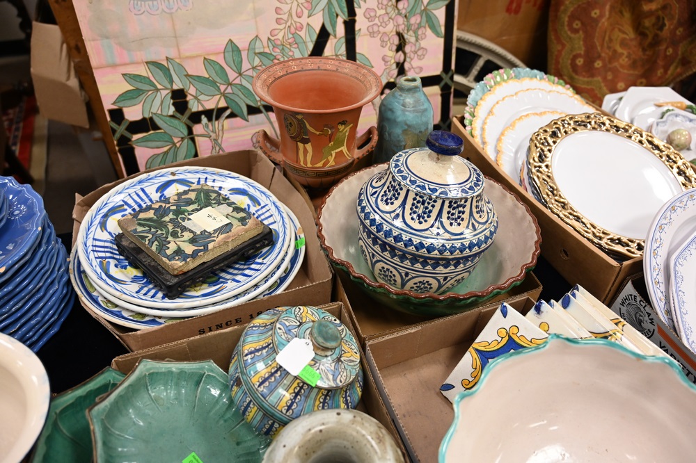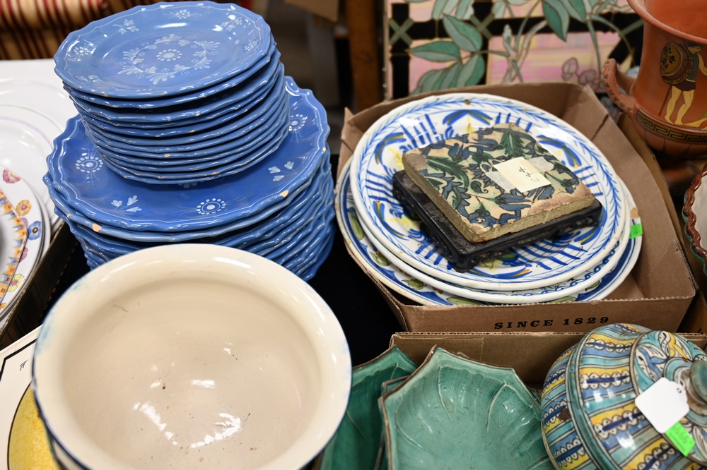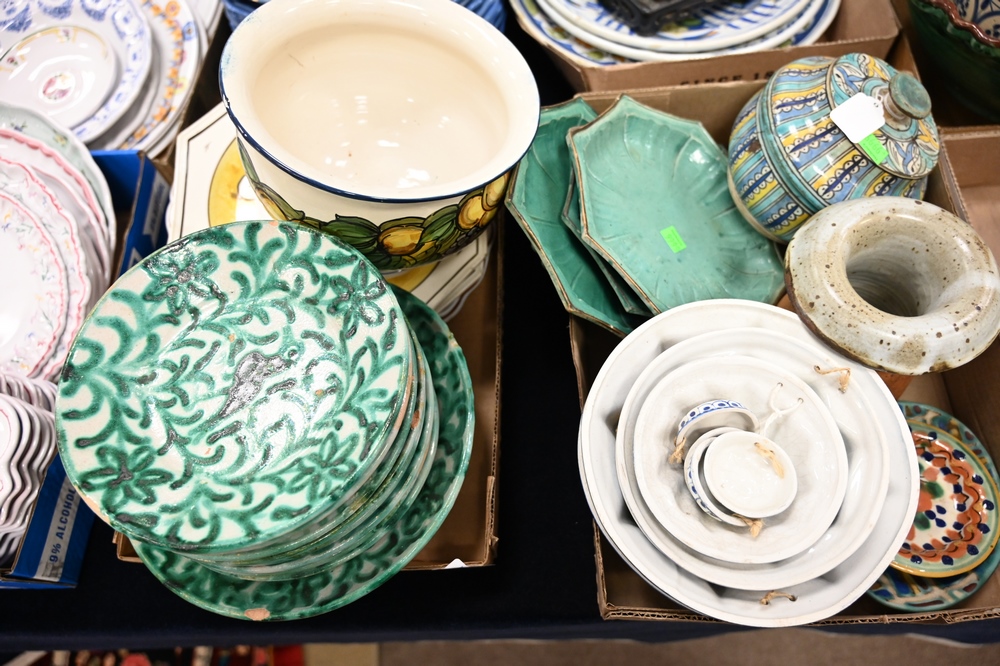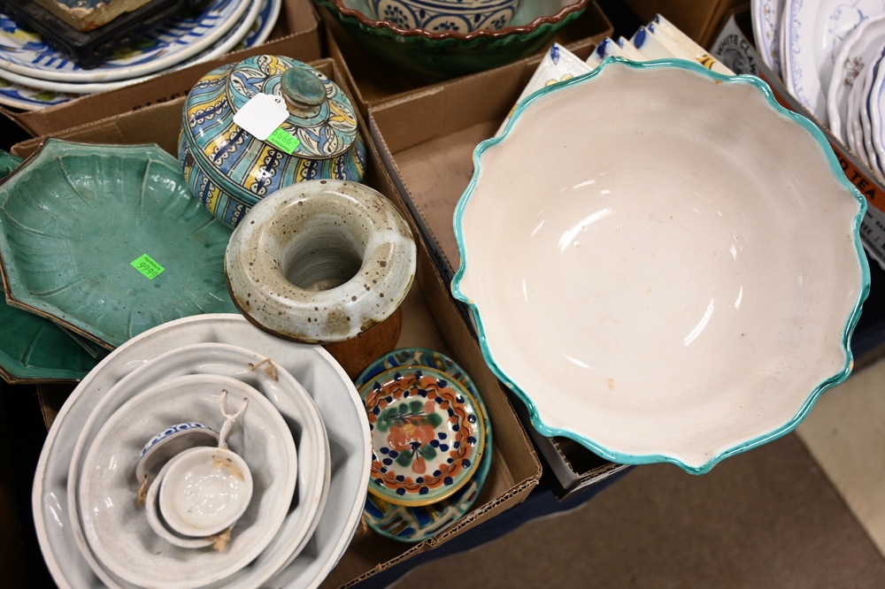 Lot 348: Six Tray Lots of Glazed Pottery and Ceramic Items, to include plates, bowls, chargers, etc., diameter of largest charger 13 inches.
